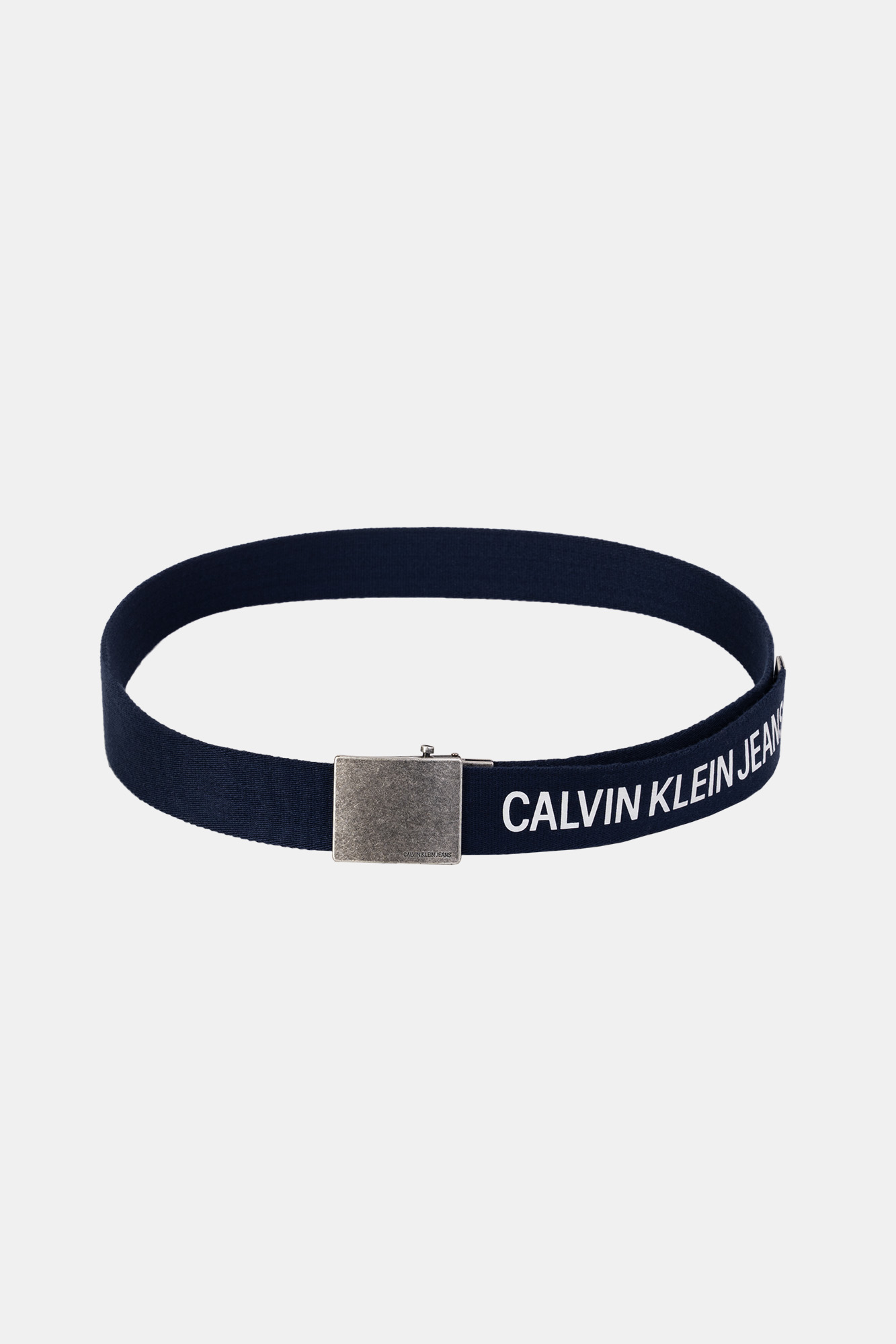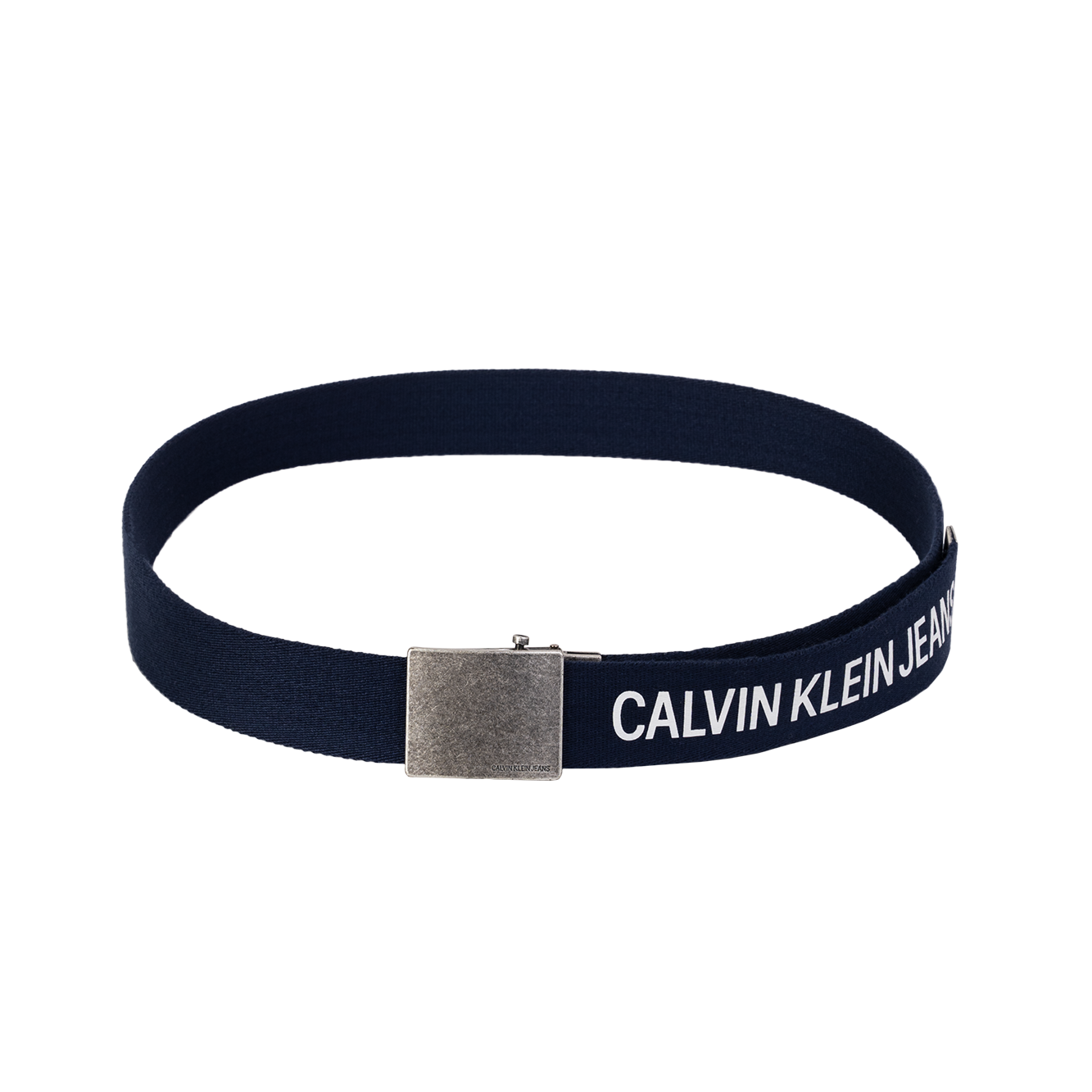 Granatowy pasek Calvin Klein Jeans materiałowy z srebrną klamrą i nazwą marki.