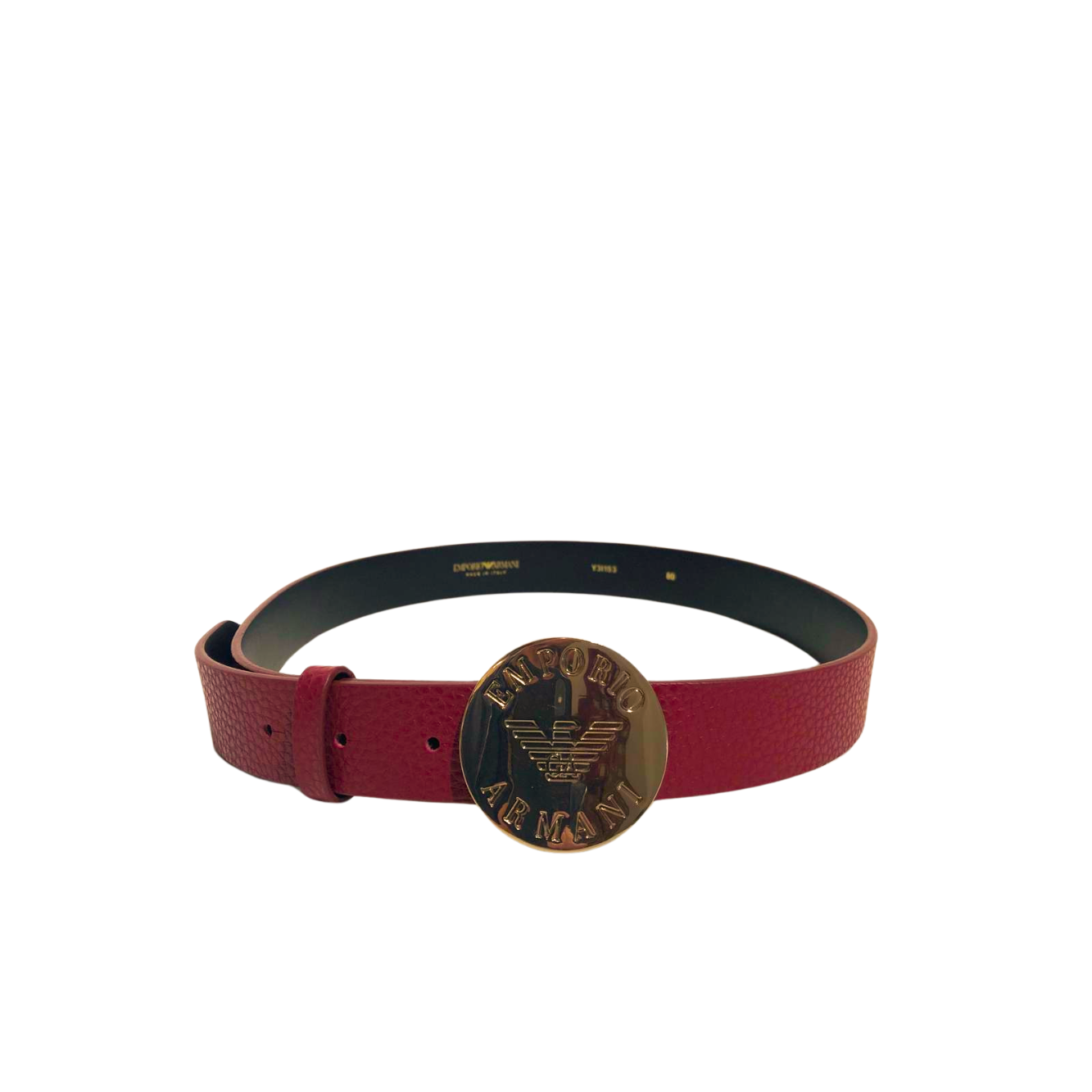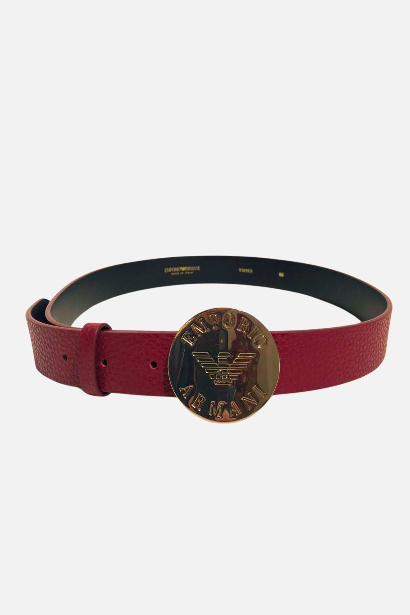 Brodowy pasek w pasek Emporio Armani z okrągłą logowaną klamrą w kolorze delikatnego złota.
