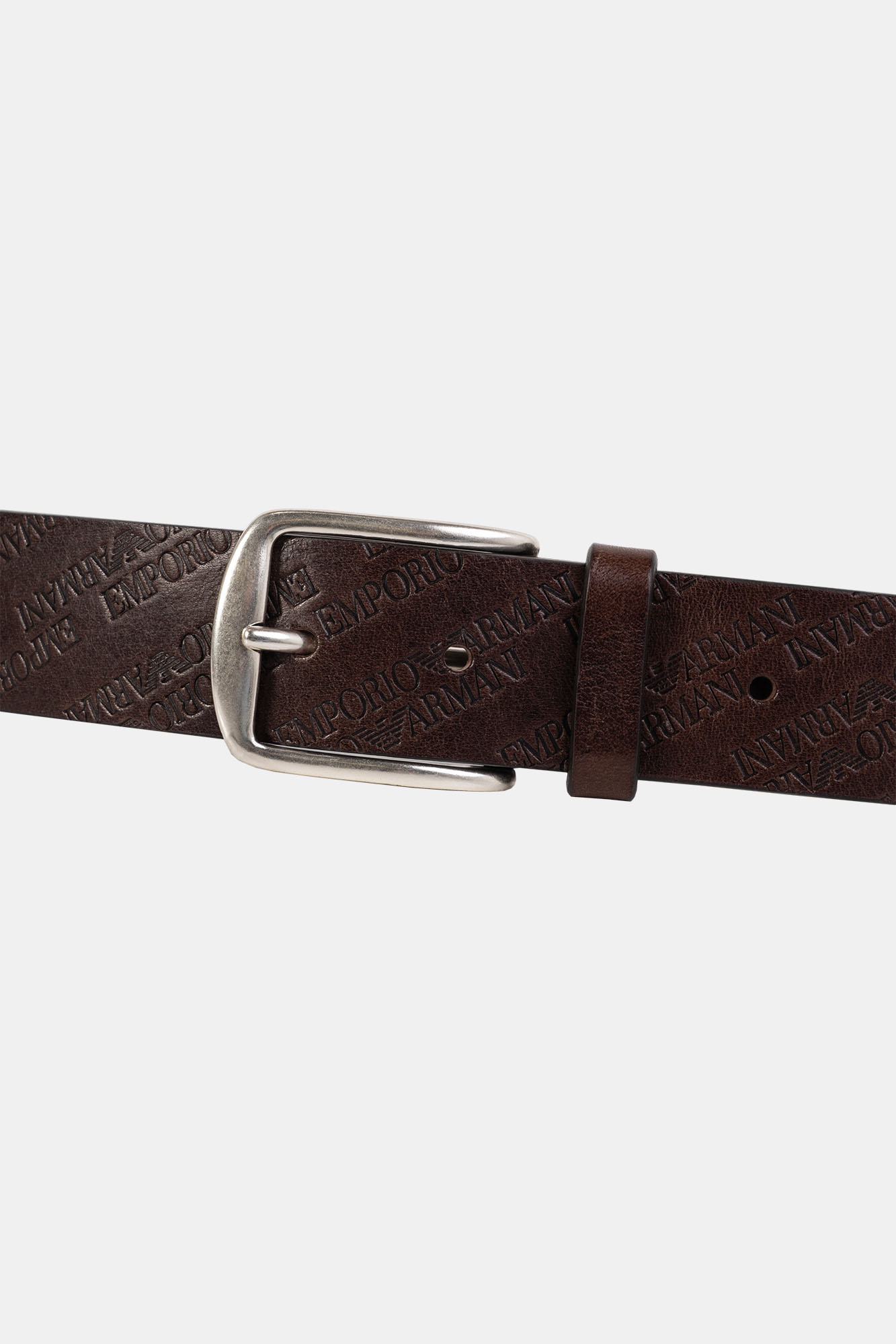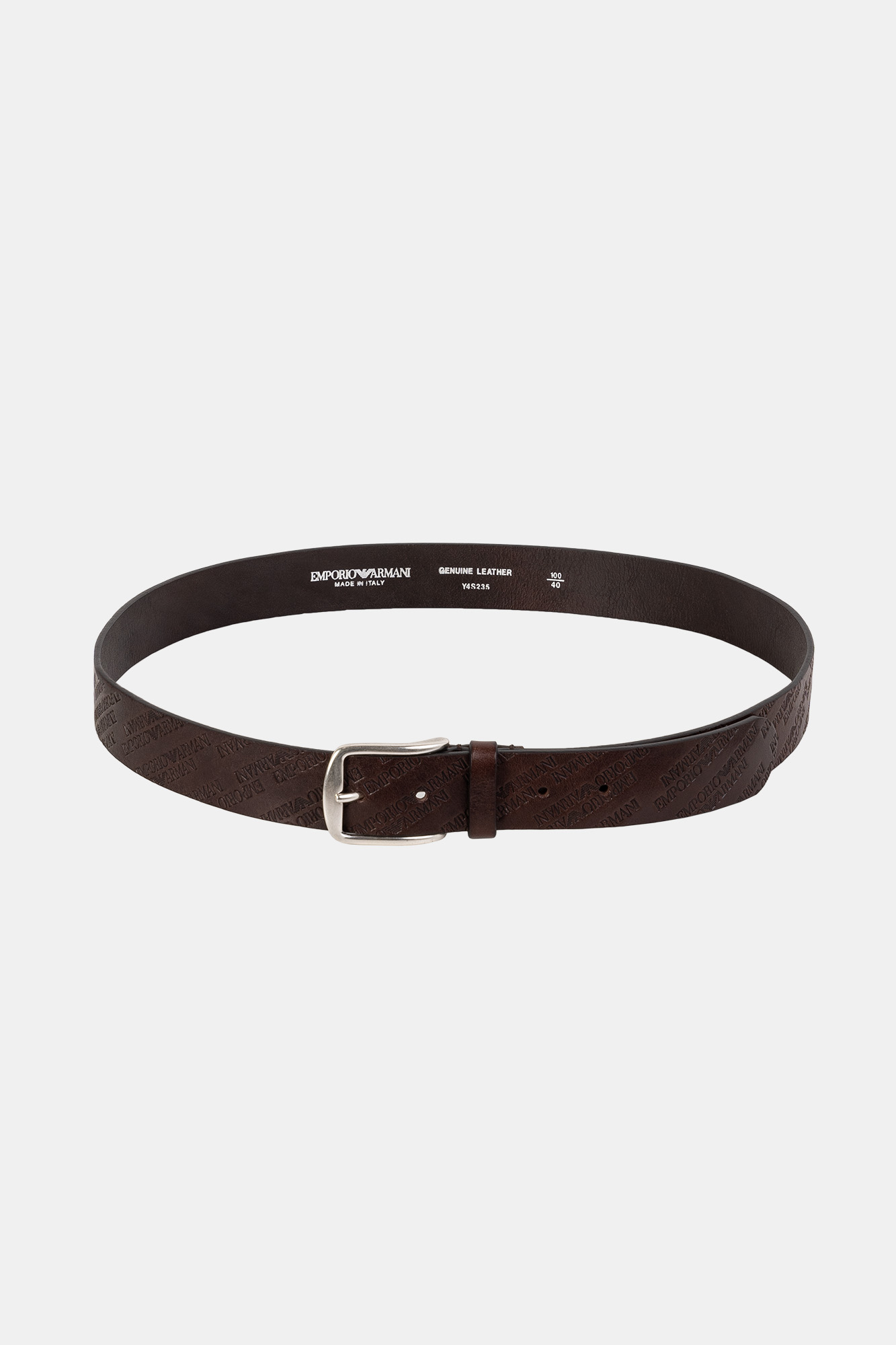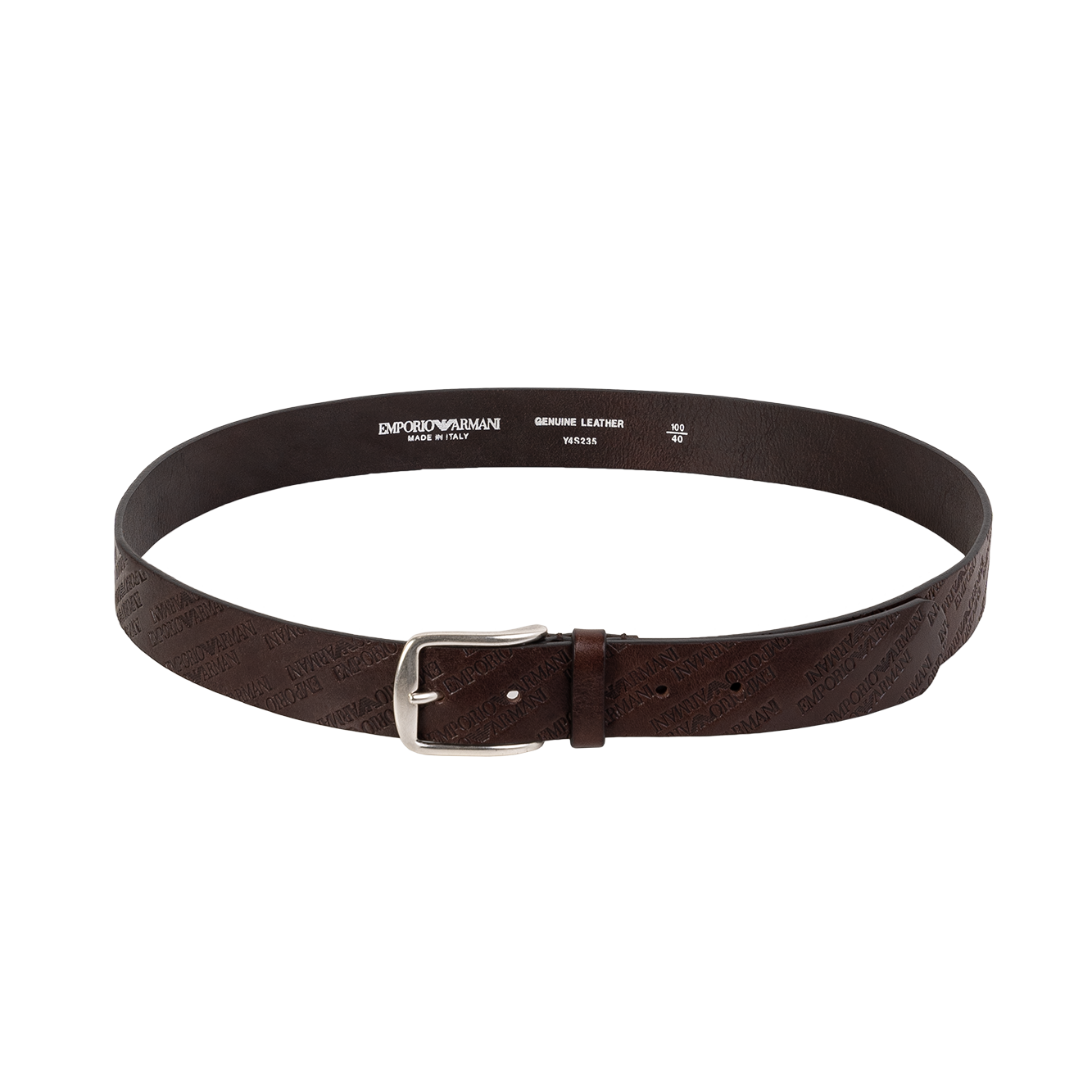 Brązowy pasek Emporio Armani logowany na całości z sprzączką klasyczną w kolorze srebrnym.