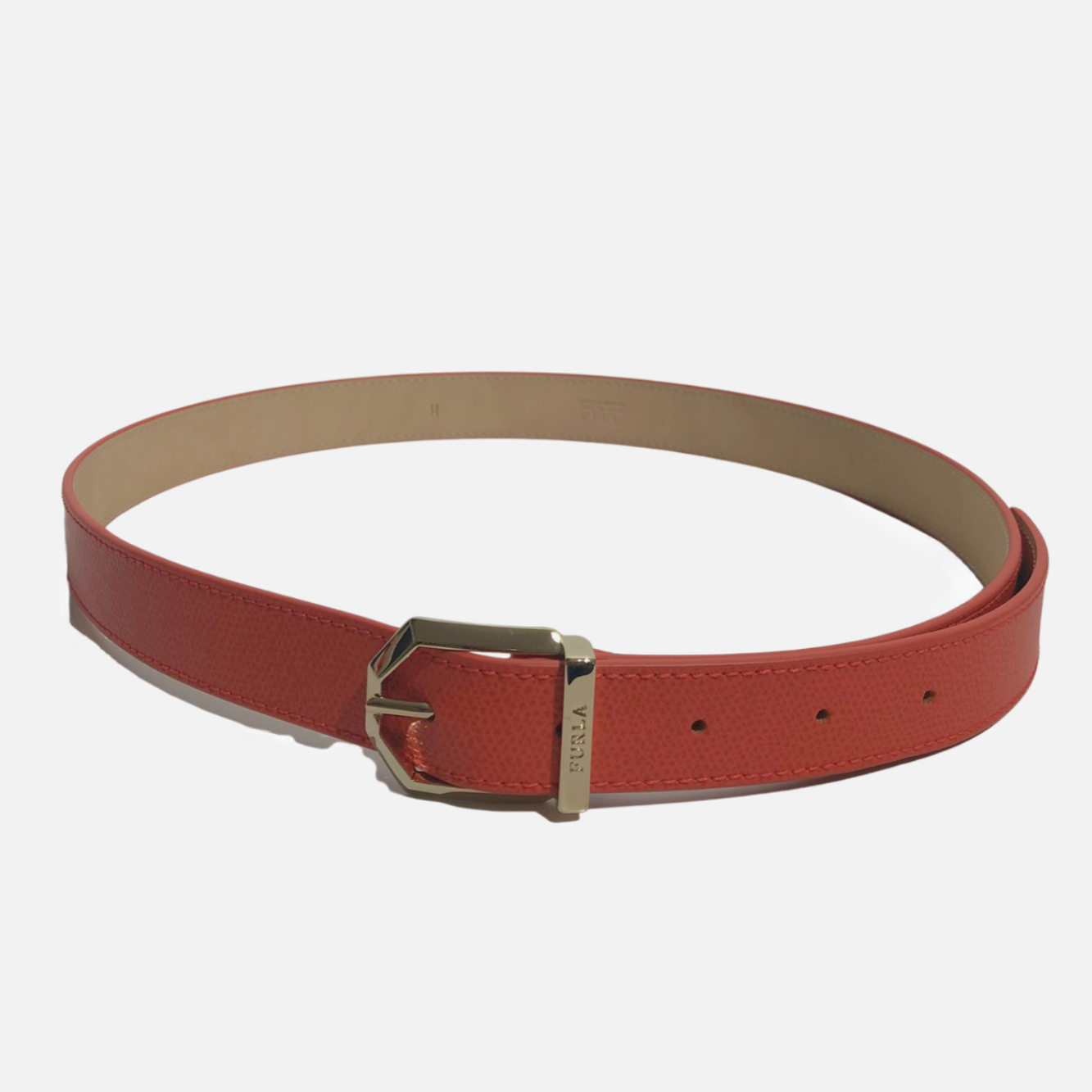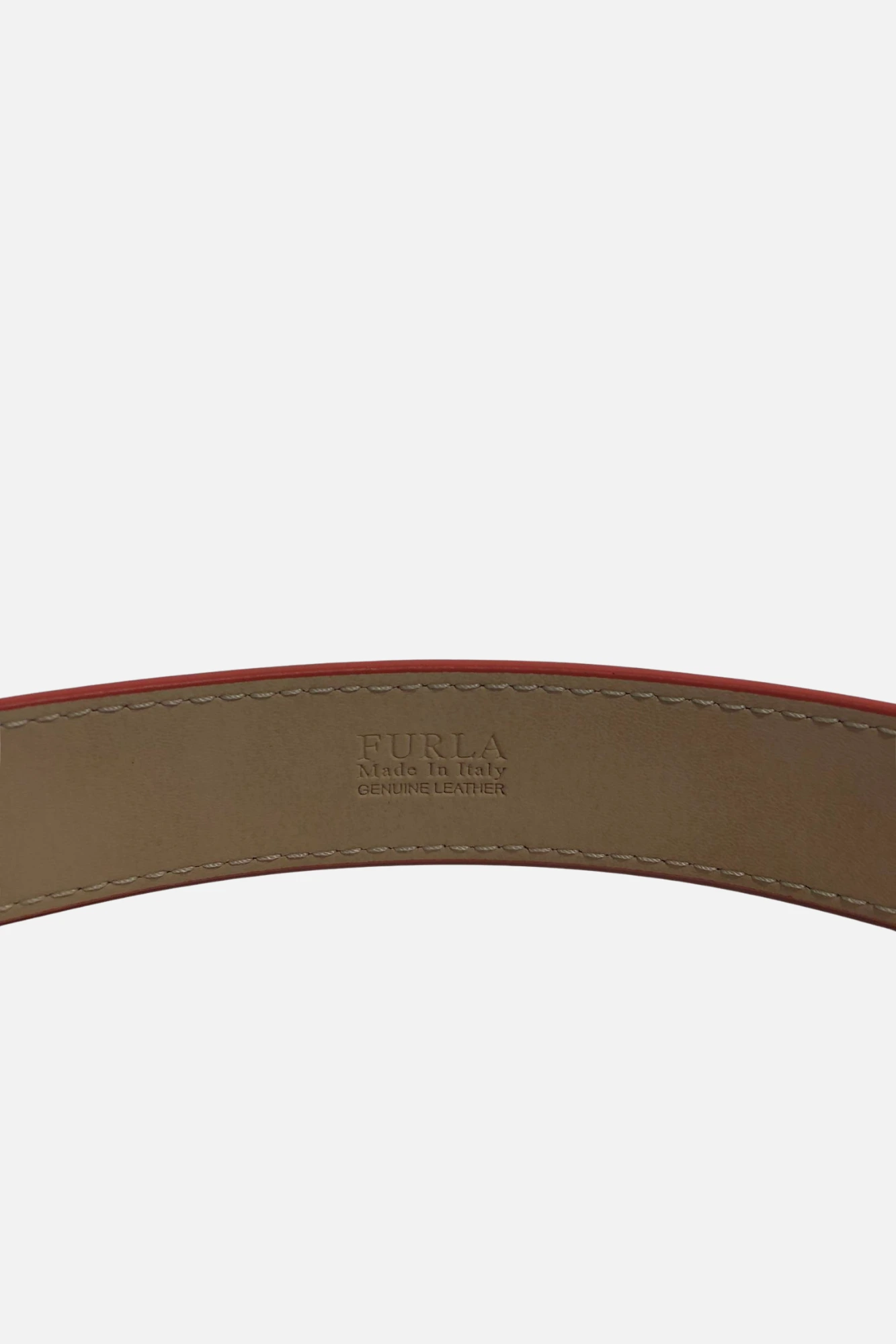 Pasek skórzany pomarańczowy marki FURLA, wykonany z naturalnej skóry, z piękną logowaną klamrą w kolorze złotym. Pasek idealnie sprawdzi się w codziennych i eleganckich stylizacjach.