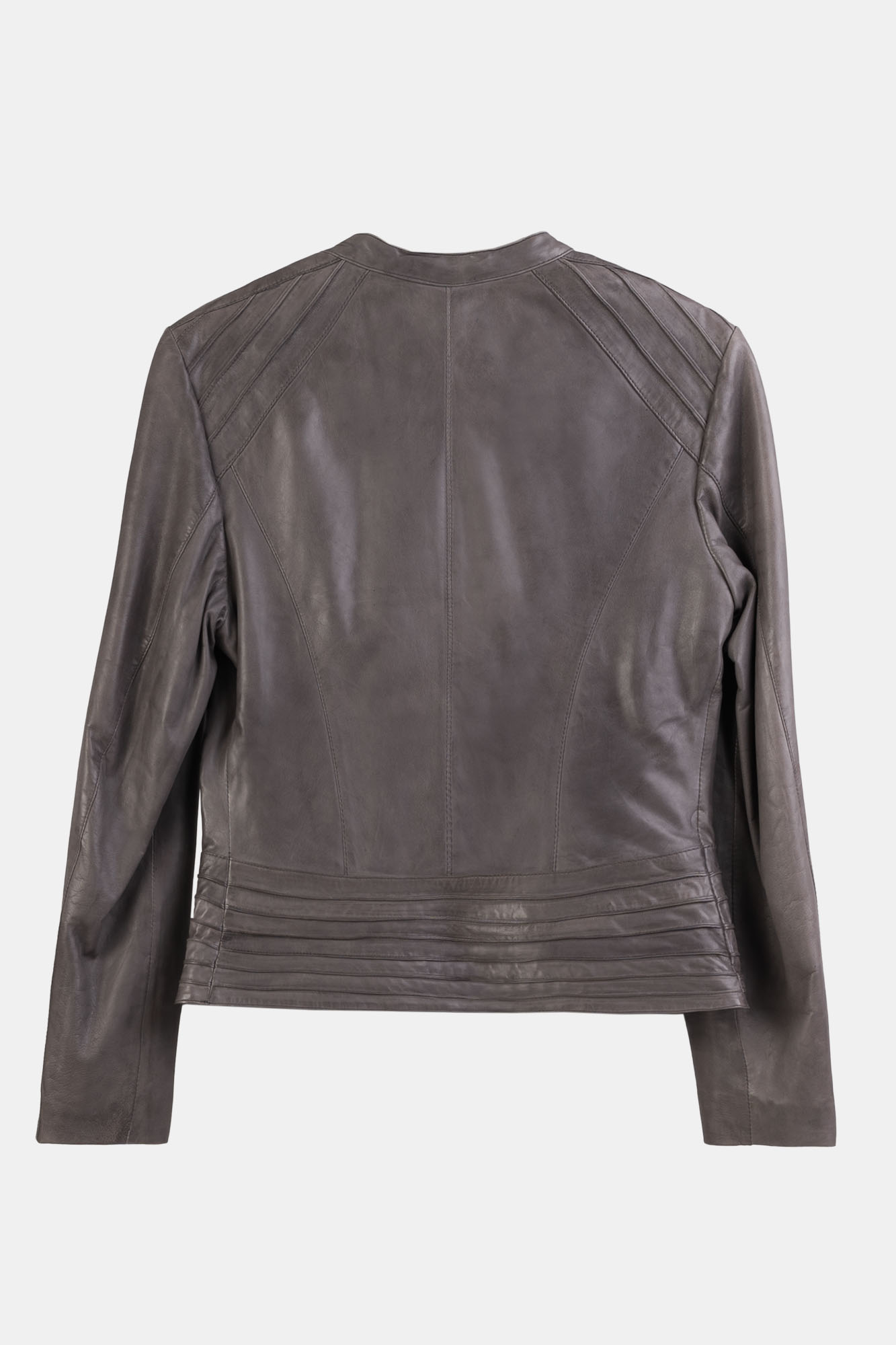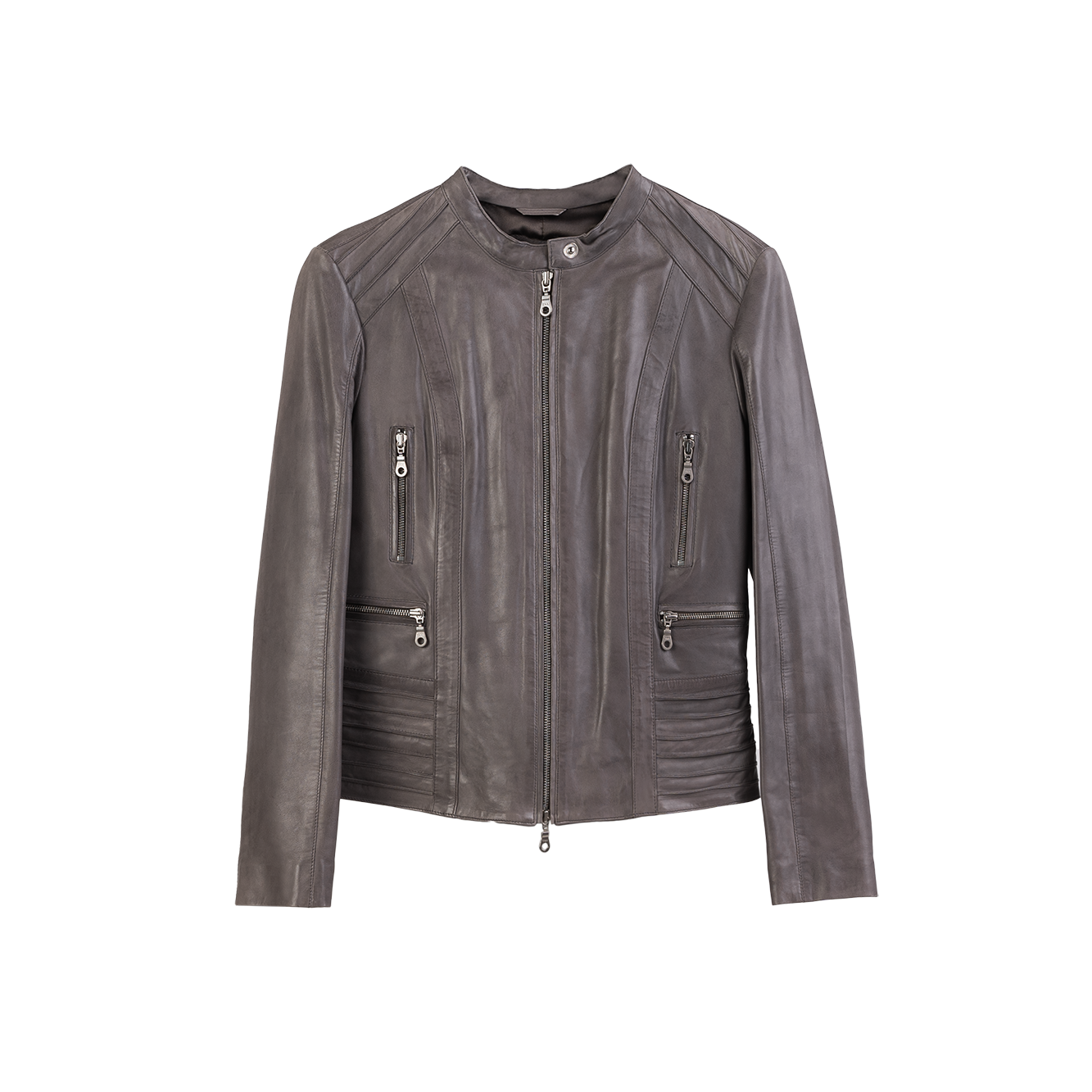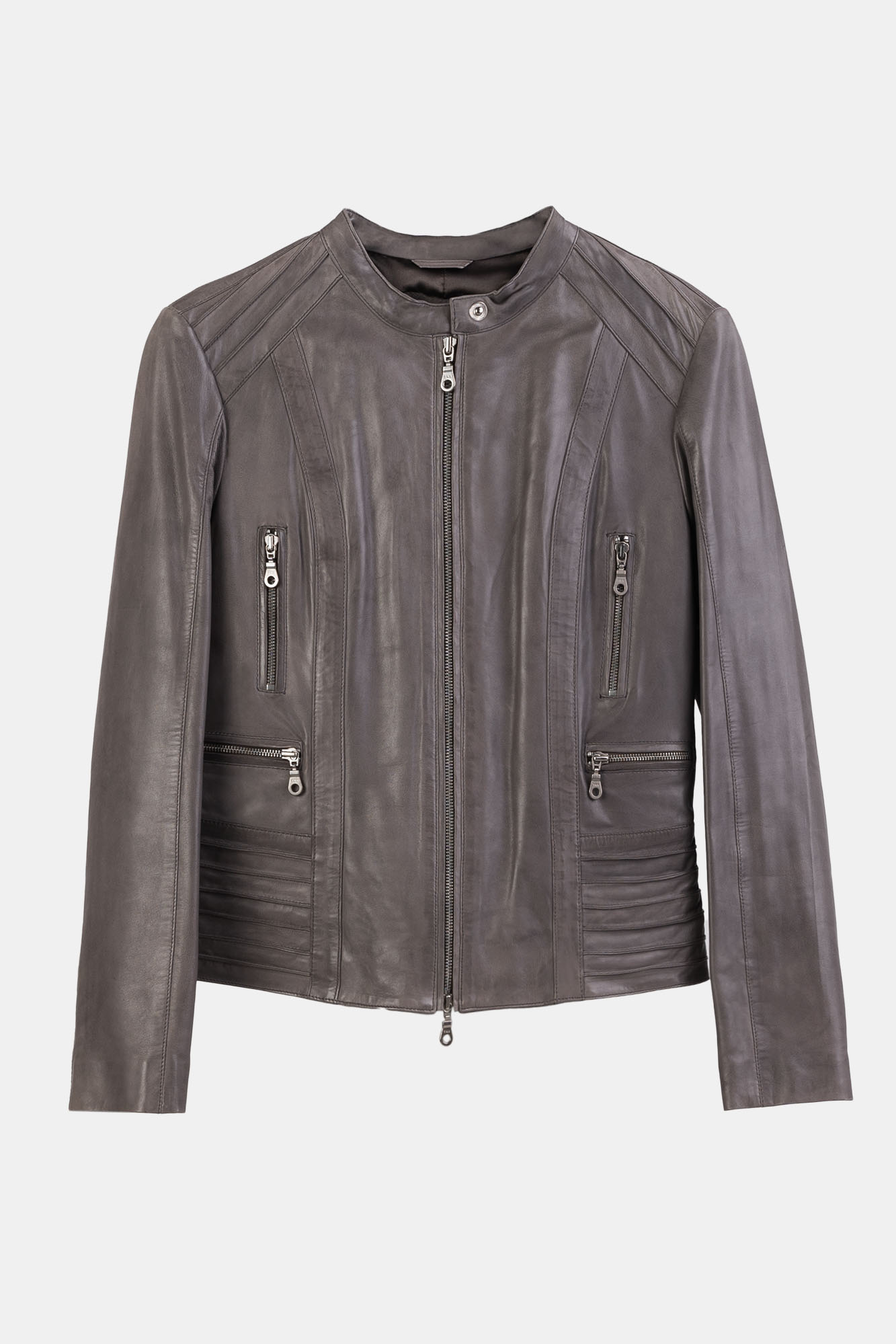 Bardzo ciekawy model kurtki skórzanej damskiej w szarym kolorze francuskiej firmy Giovanni . Na ramionach i z tyłu zaszewki ze skóry, w połączeniu z zamkami w kolorze srebrnym nietuzinkowy look.