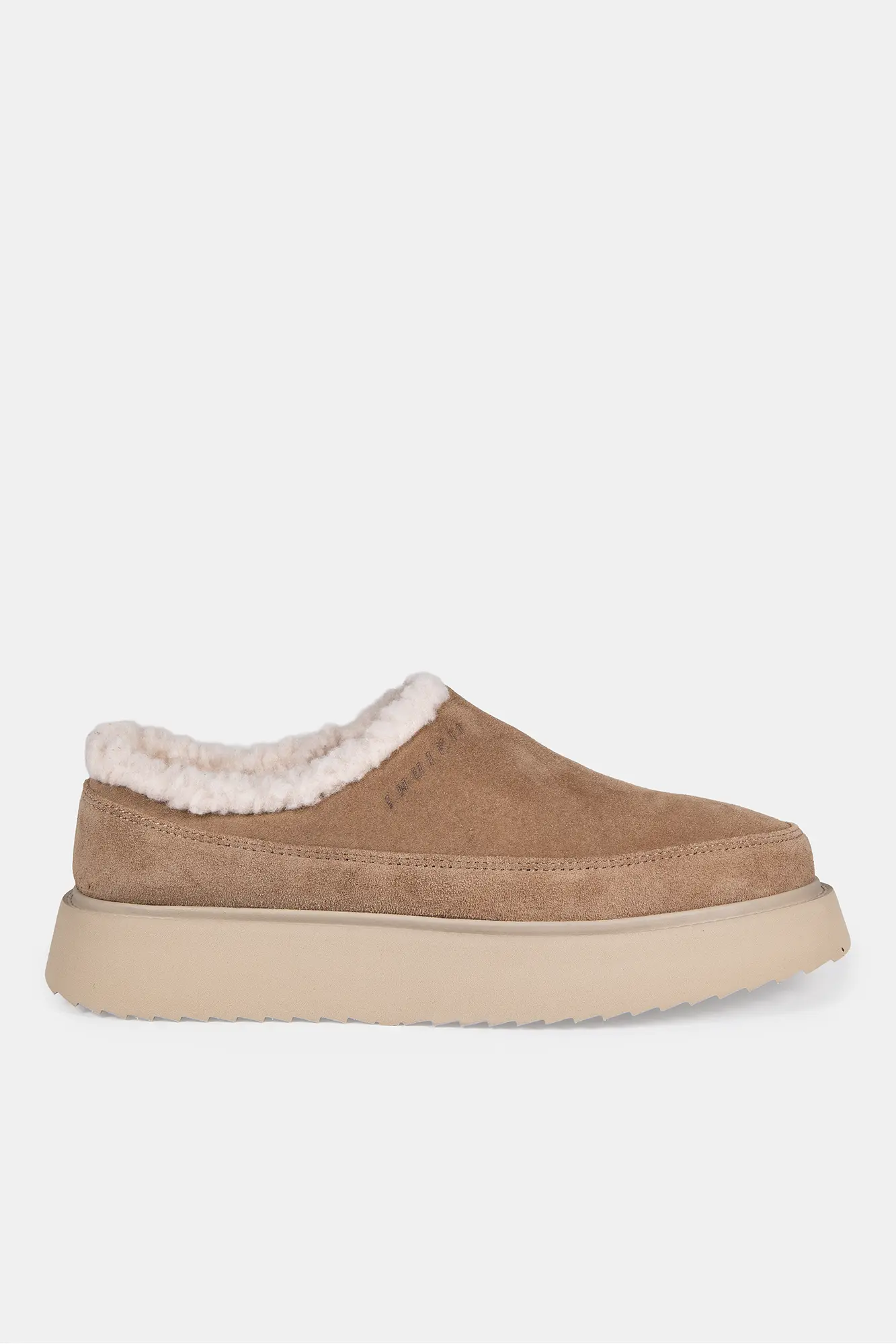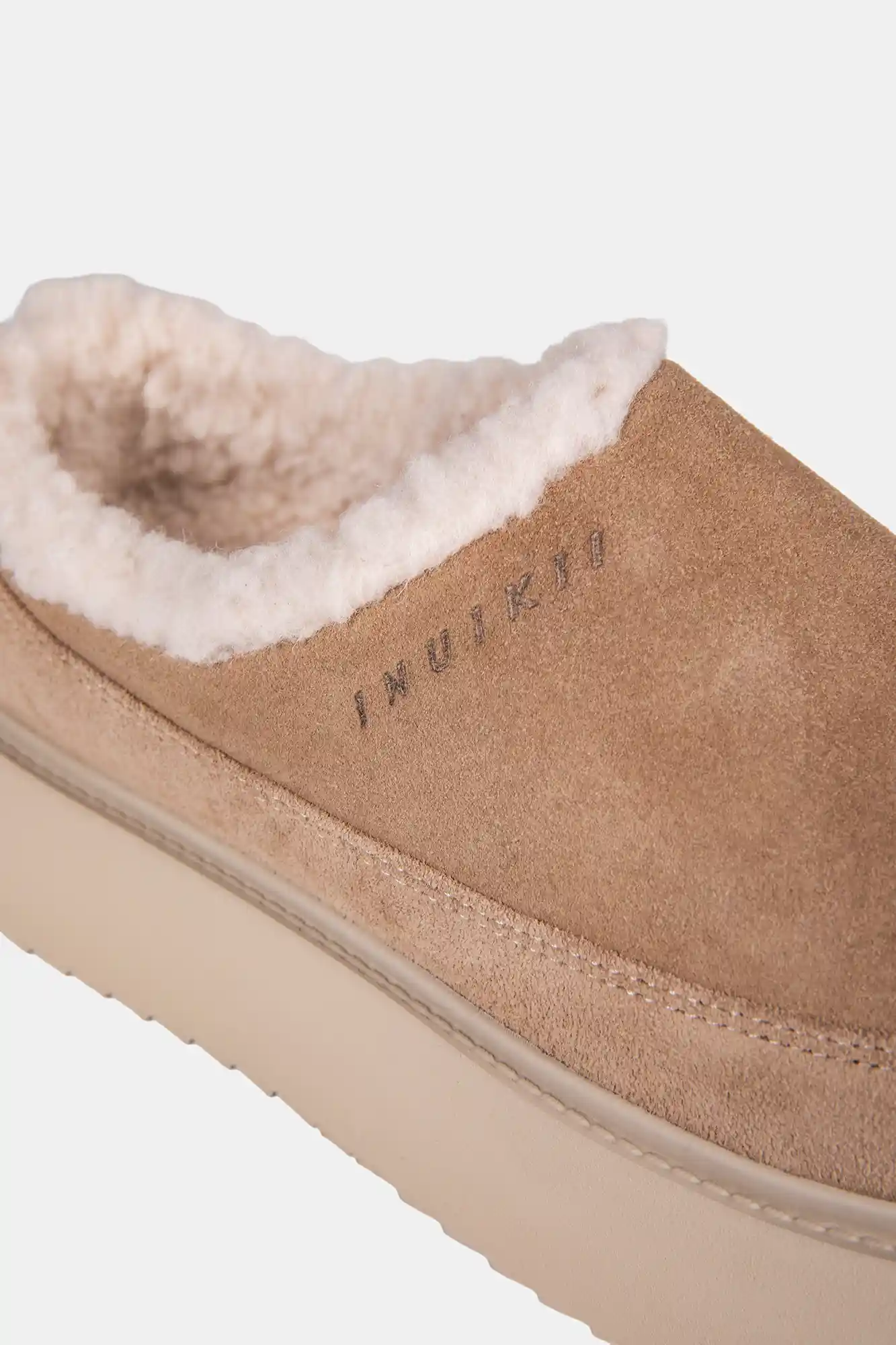 Brązowe wsuwane klapki Inuikii. Ręcznie wykonane buty damskie ze skóry zamszowej naturalnej w kolorze ciepłego beżu.
