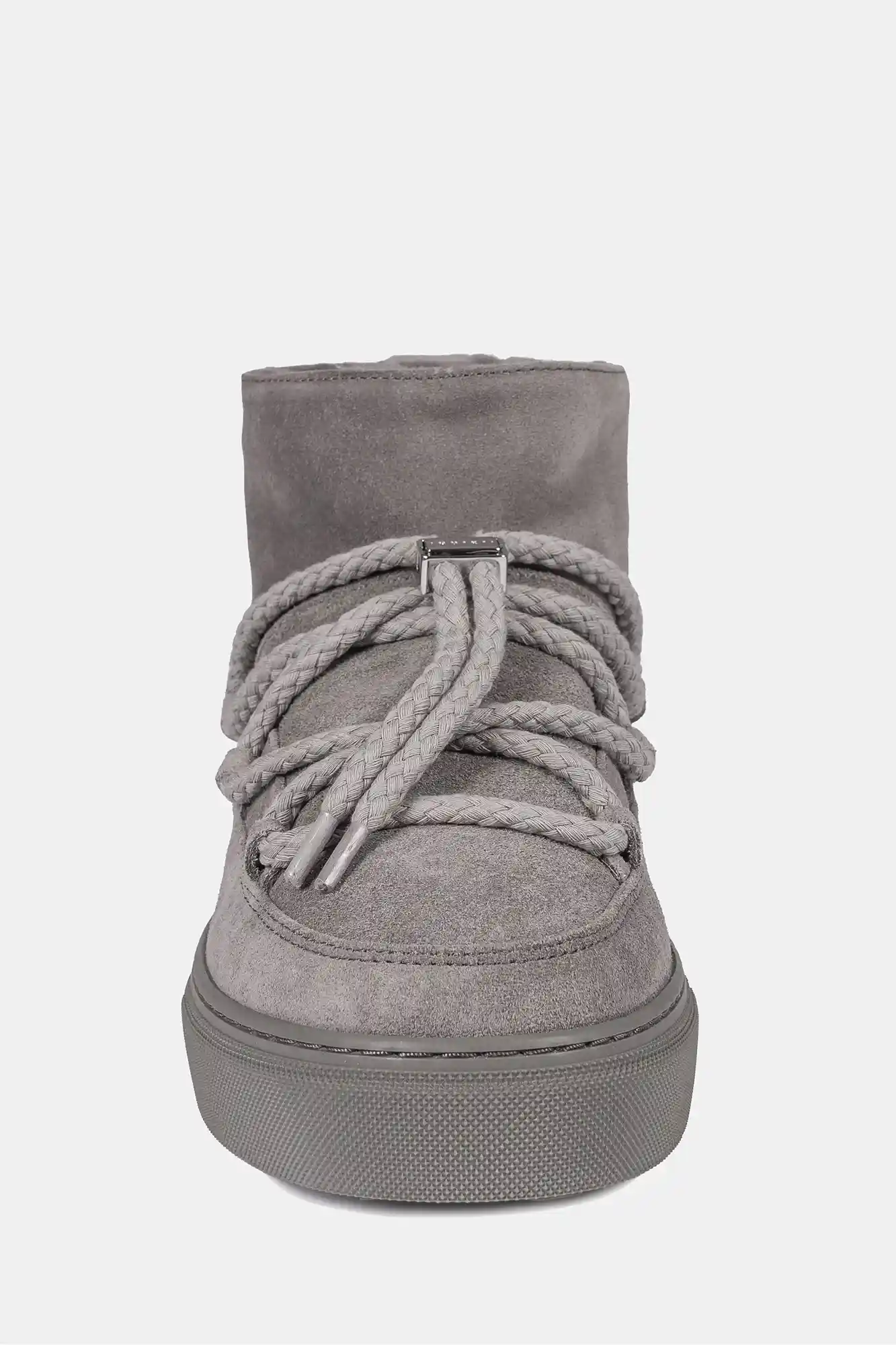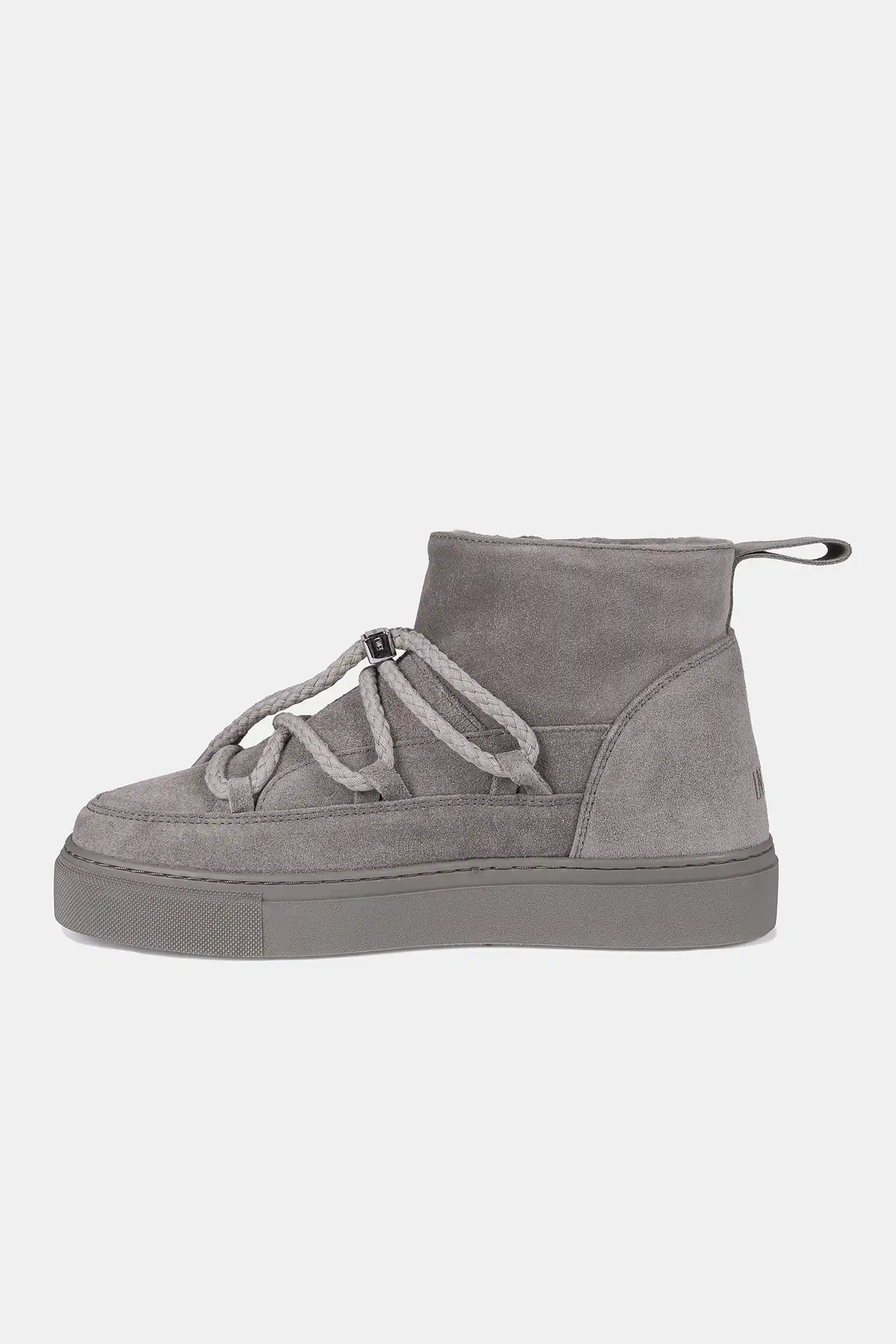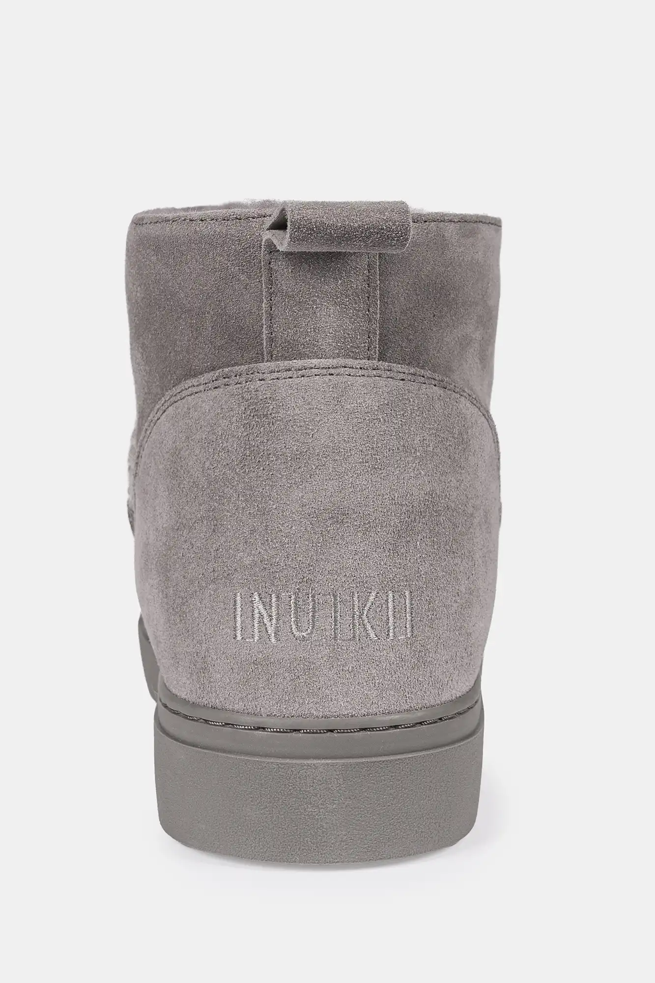 Szare śniegowce Inuikii Classic Low wykonane z naturalnej owczej skóry, z wierzchu zamszowej. Eleganckie i wygodne, futrzane wnętrze umożliwia chodzenie na gołą stopę. Gruba platforma dodaje charakteru i zapewnia dobrą izolację od zimnego podłoża.