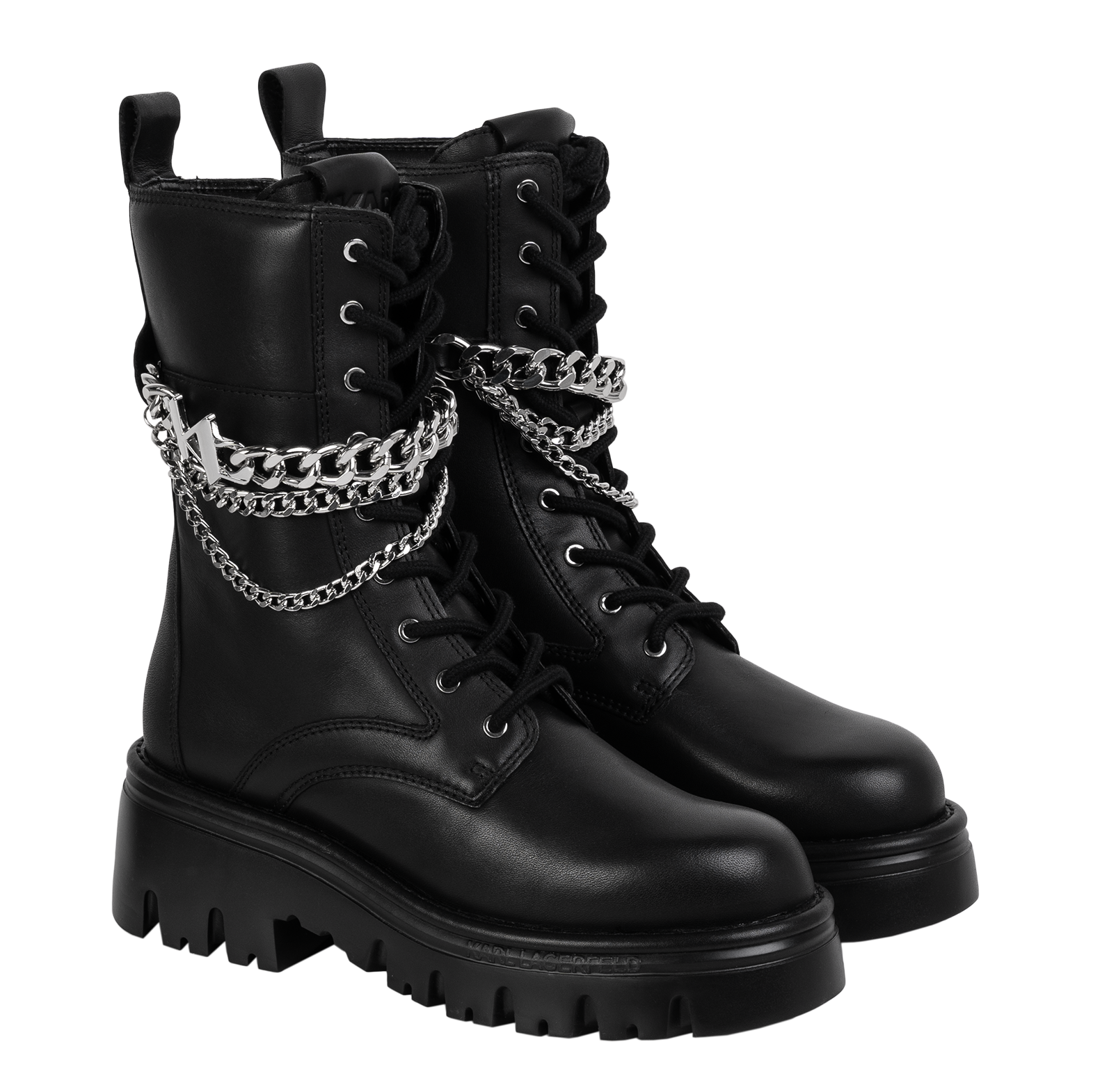 Czarne buty z wysoką podeszwą, wysokie, sznurowane z ozdobnym łańcuchem Karl Lagerfeld.