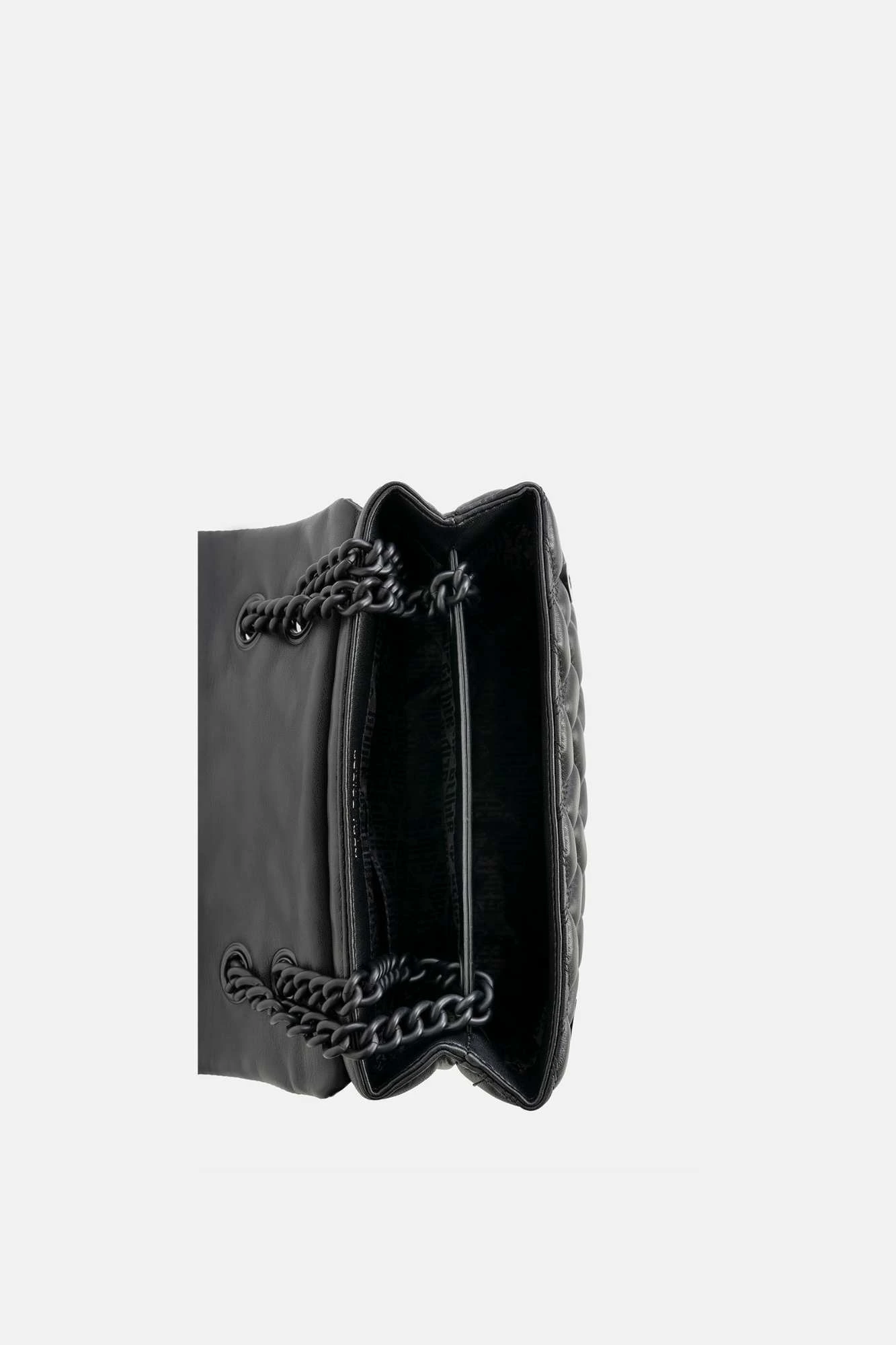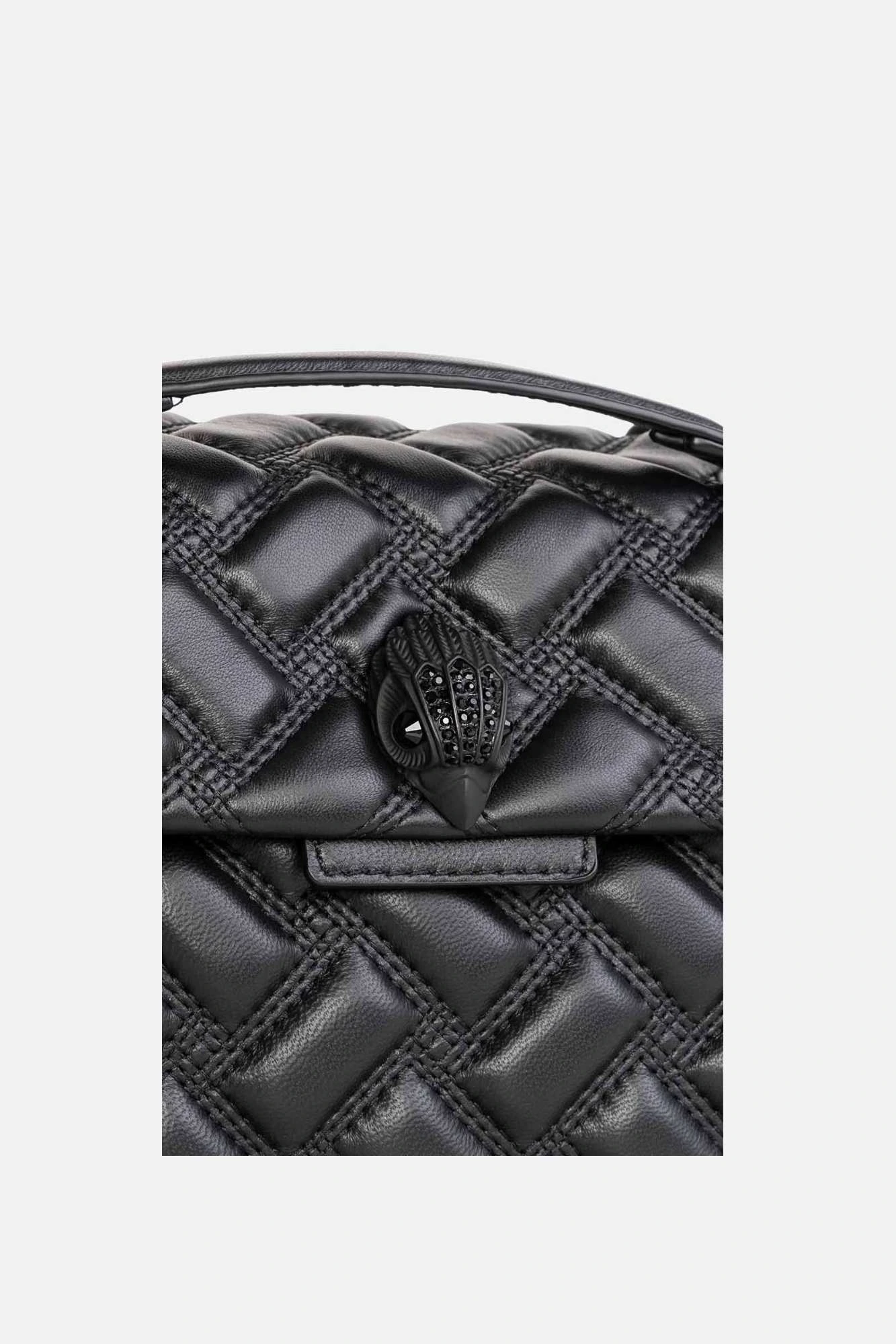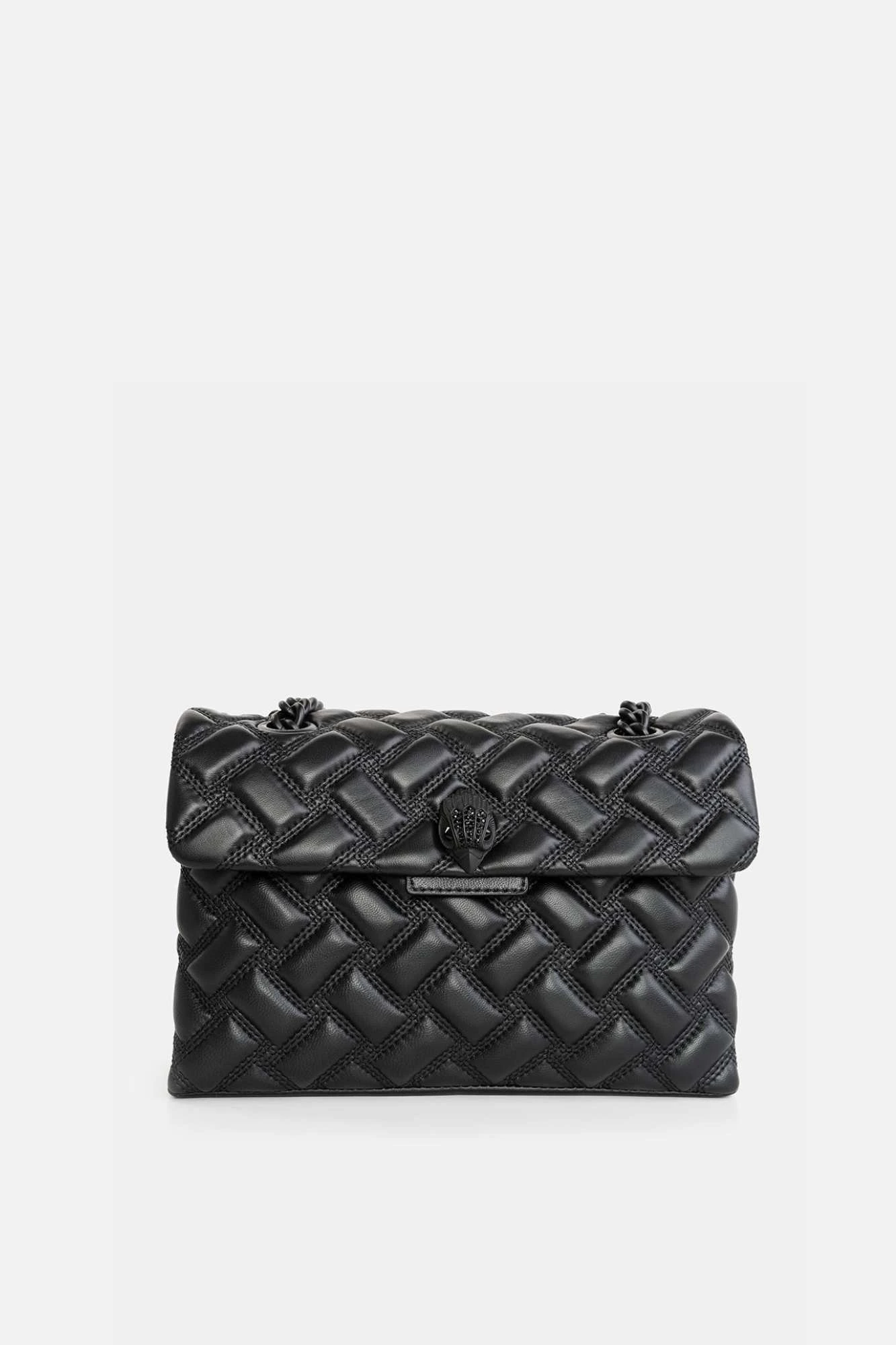 Czarna skórzana torebka Kurt Geiger. Pudełkowaty kształt, czarny odcień i pikowany krój emanuje klasycznym stylem a kultowe zdobienie w kształcie dużej głowy orła z cyrkoniami dodają mu ostrości. Zamykana na klapę z zapięciami magnetycznymi. Wnętrze wyszywane logowanym materiałem z przegrodą oraz boczną kieszenią. Rączki czarne, łańcuszkowe z skórzanymi naramiennikami o regulowanej długości 28 cm.