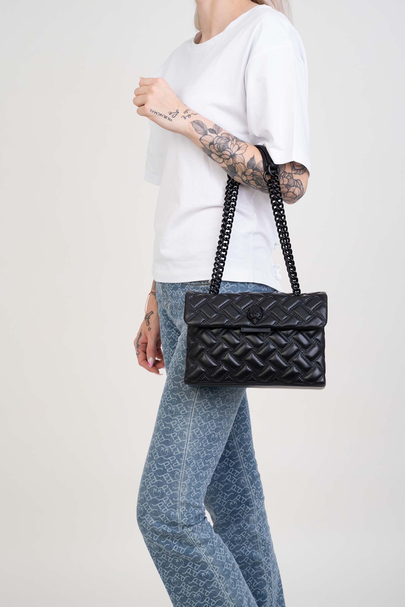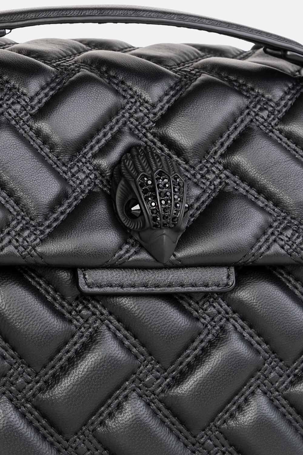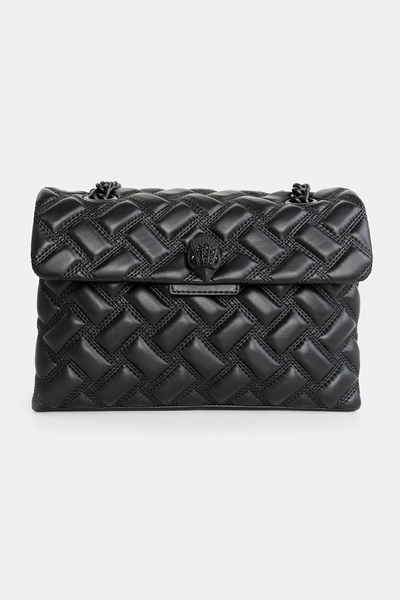 Czarna skórzana torebka Kurt Geiger. Pudełkowaty kształt, czarny odcień i pikowany krój emanuje klasycznym stylem a kultowe zdobienie w kształcie dużej głowy orła z cyrkoniami dodają mu ostrości. Zamykana na klapę z zapięciami magnetycznymi. Wnętrze wyszywane logowanym materiałem z przegrodą oraz boczną kieszenią. Rączki czarne, łańcuszkowe z skórzanymi naramiennikami o regulowanej długości 28 cm.