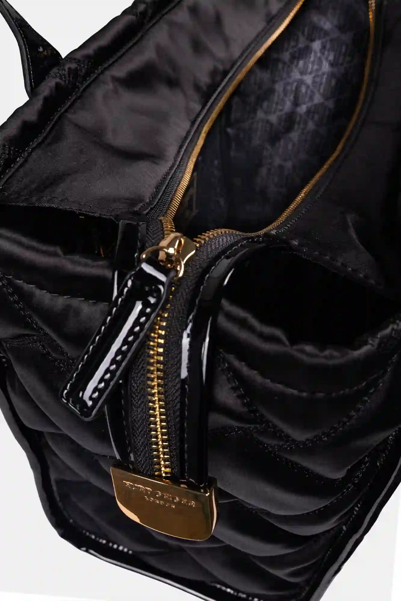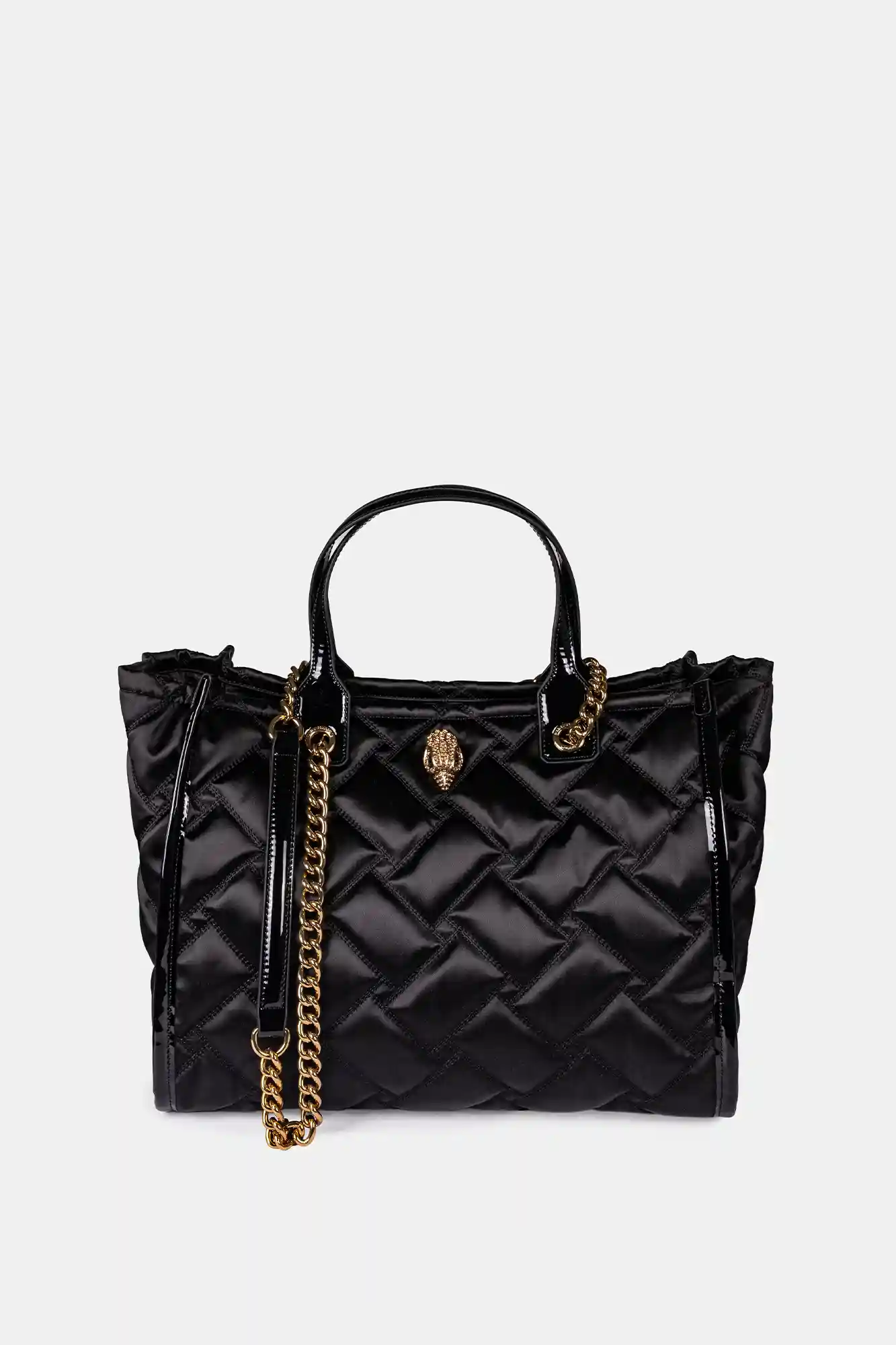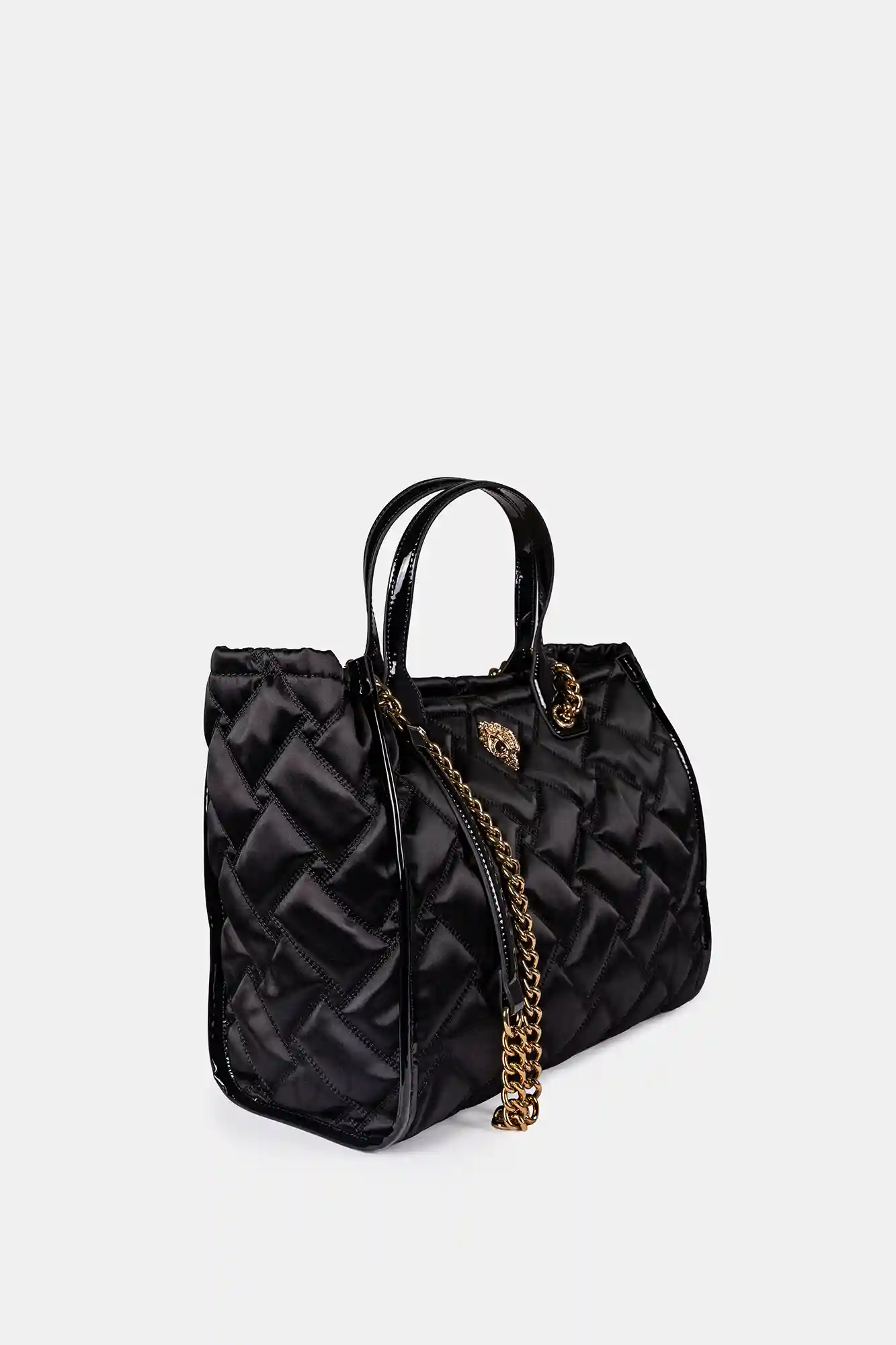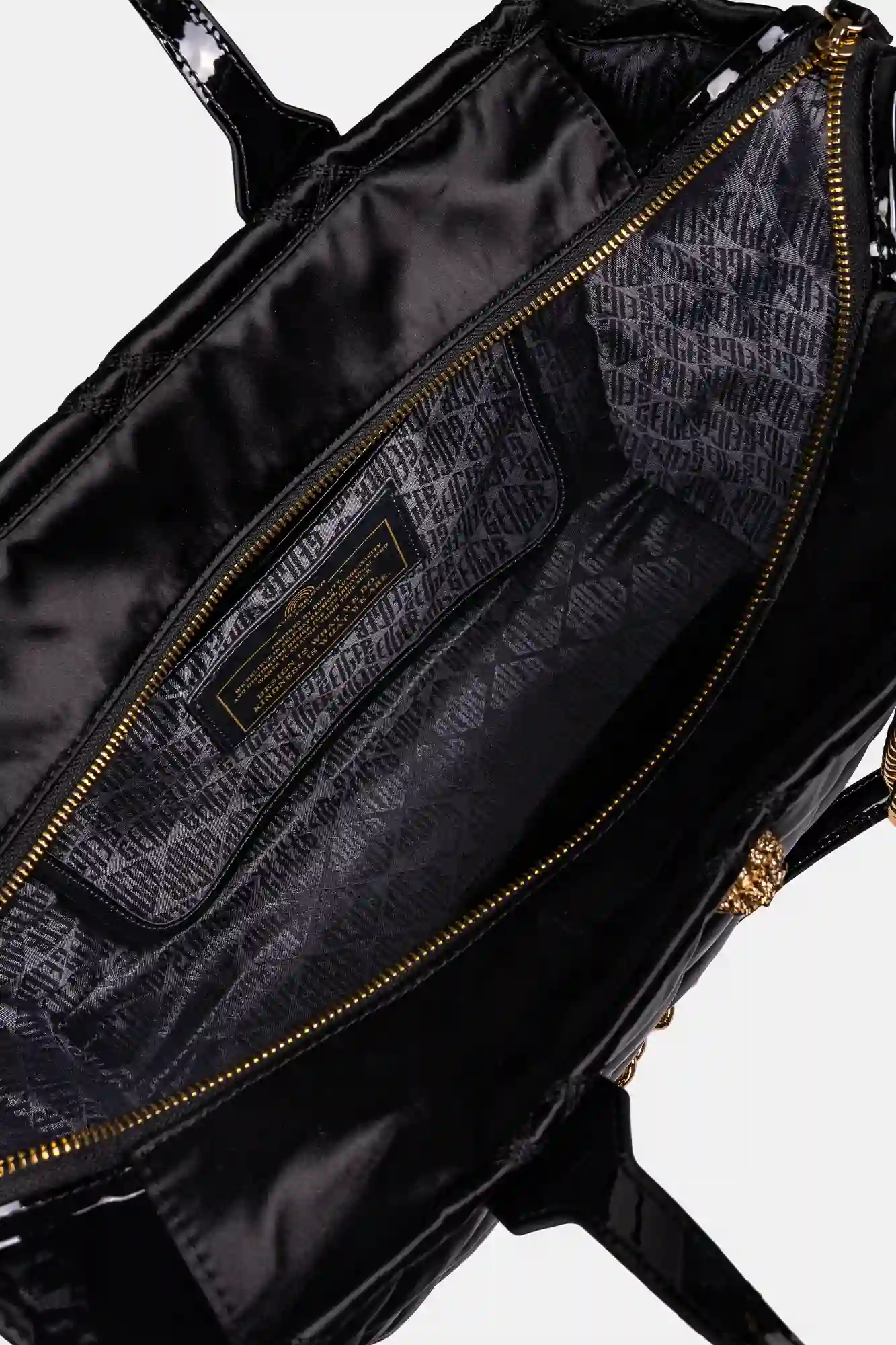 Torebka szoperka firmy Kurt Geiger London, wykonana z połączenia skóry ekologicznej i materiałów tekstylnych. Bardzo funkcjonalna, pojemna idealna na zakupy, zapinana na zamek, w środku jest dodatkowa kieszonka przeznaczona na telelon, klucze lub portfel. Długie rączki ułatwiają noszenie podczas zakupów, a metalowe nóżki na spodzie chronią dno przed uszkodzeniem i zabrudzeniem.