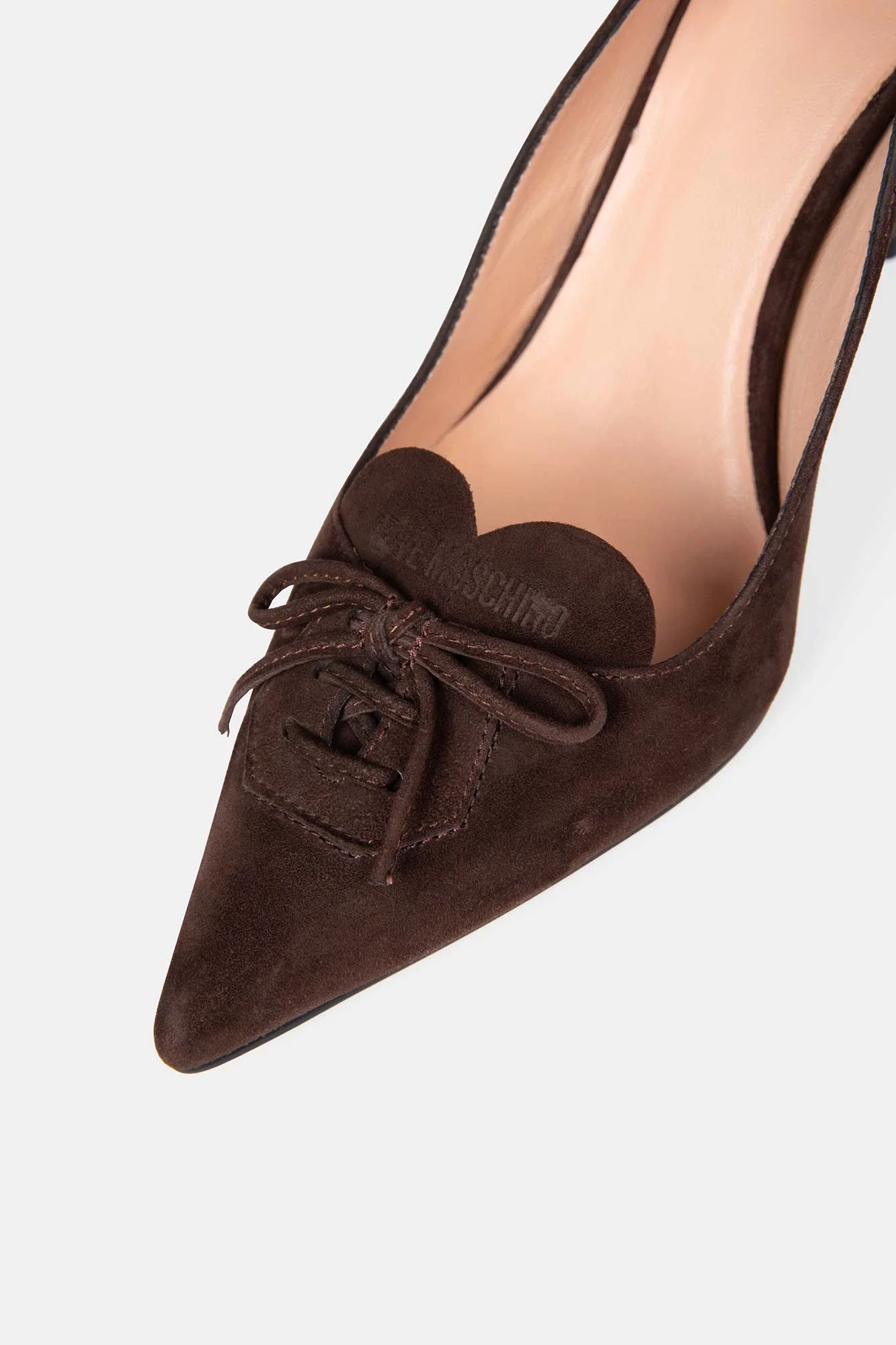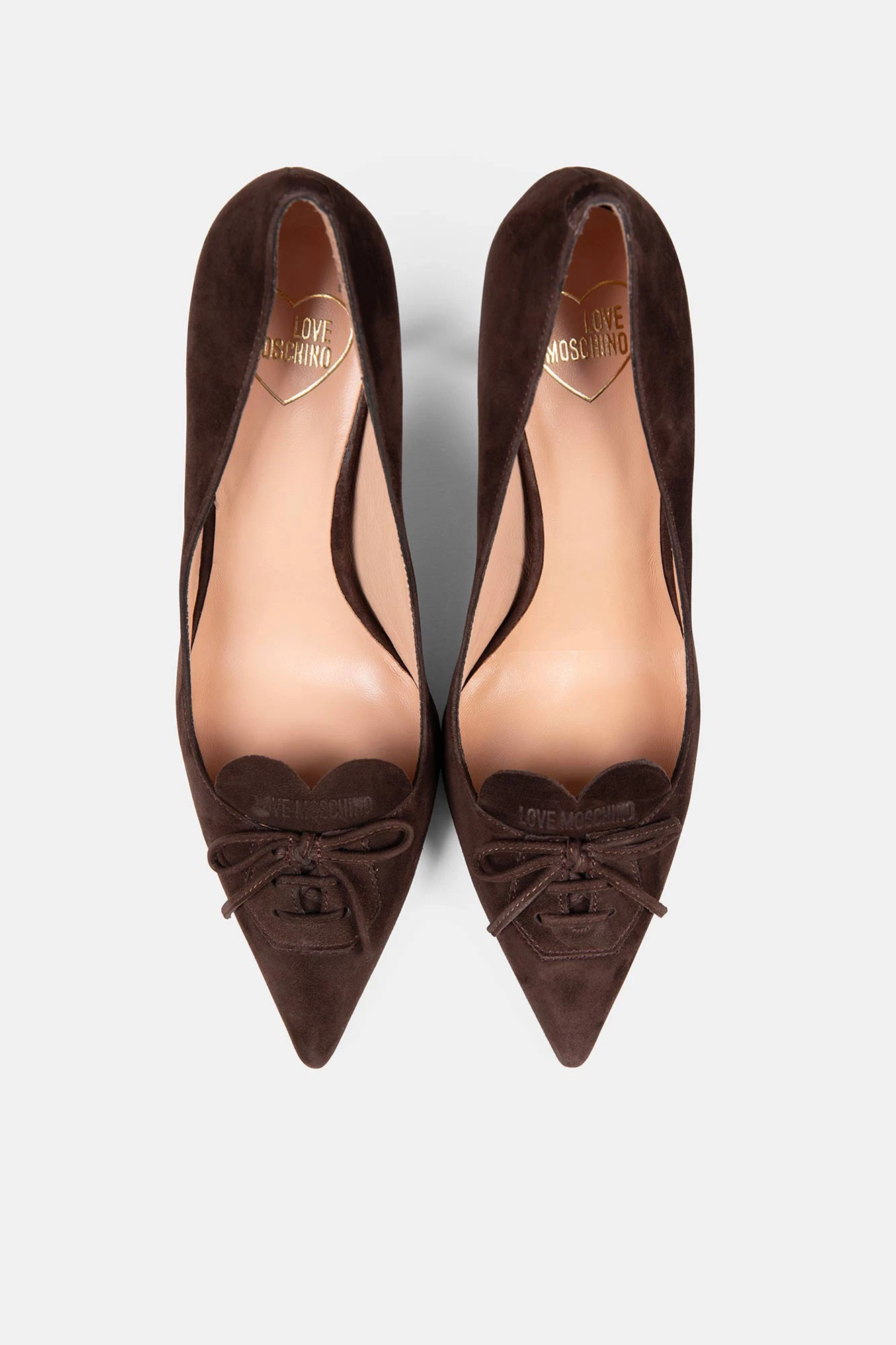 Szpilki damskie brązowe marki Love Moschino, wykonane z naturalnej skóry zamszowej. Buty damskie na obcasie 9 cm, który w połączeniu z szpiczastym noskiem idealnie wysmukla stopę. Górę buta ozdobiono sercem, które jest logiem marki i subtelką kokardką, która jest niestandardowym akcentem i w przemyślany sposób przełamuje formalny styl dodaje im niepowtarzalnego uroku. Szpilki doskonale sprawdzą się zarówno w biurze, jak i podczas wieczornego wyjścia.
