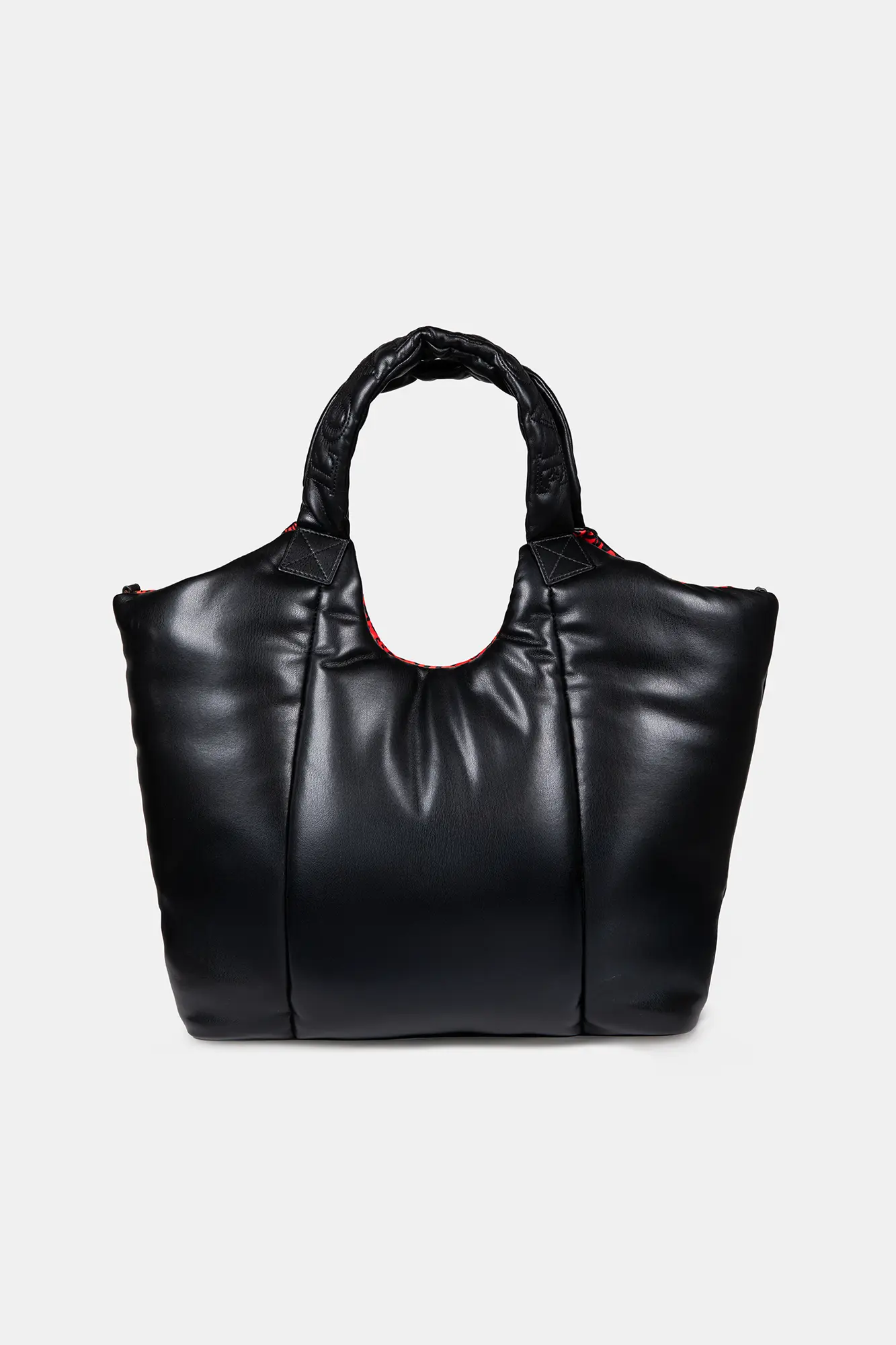 Piękna, przyciągająca uwagę czarna torebka shopperka Love Moschino. Ma miękką strukturę, a z przodu zdobi ją złoty napis, który dodaje jej elegancji. Zauważalnym akcentem jest zawieszka w kształcie serca. Wnętrze torby wyściela logowana podszewka w czarno-czerwonych kolorach. Do zestawu dołączono kosmetyczkę w tym samym odcieniu, idealną na niezbędne drobiazgi. Torba zamykana jest na magnetyczny klips, można ją nosić w ręku lub na ramieniu.
