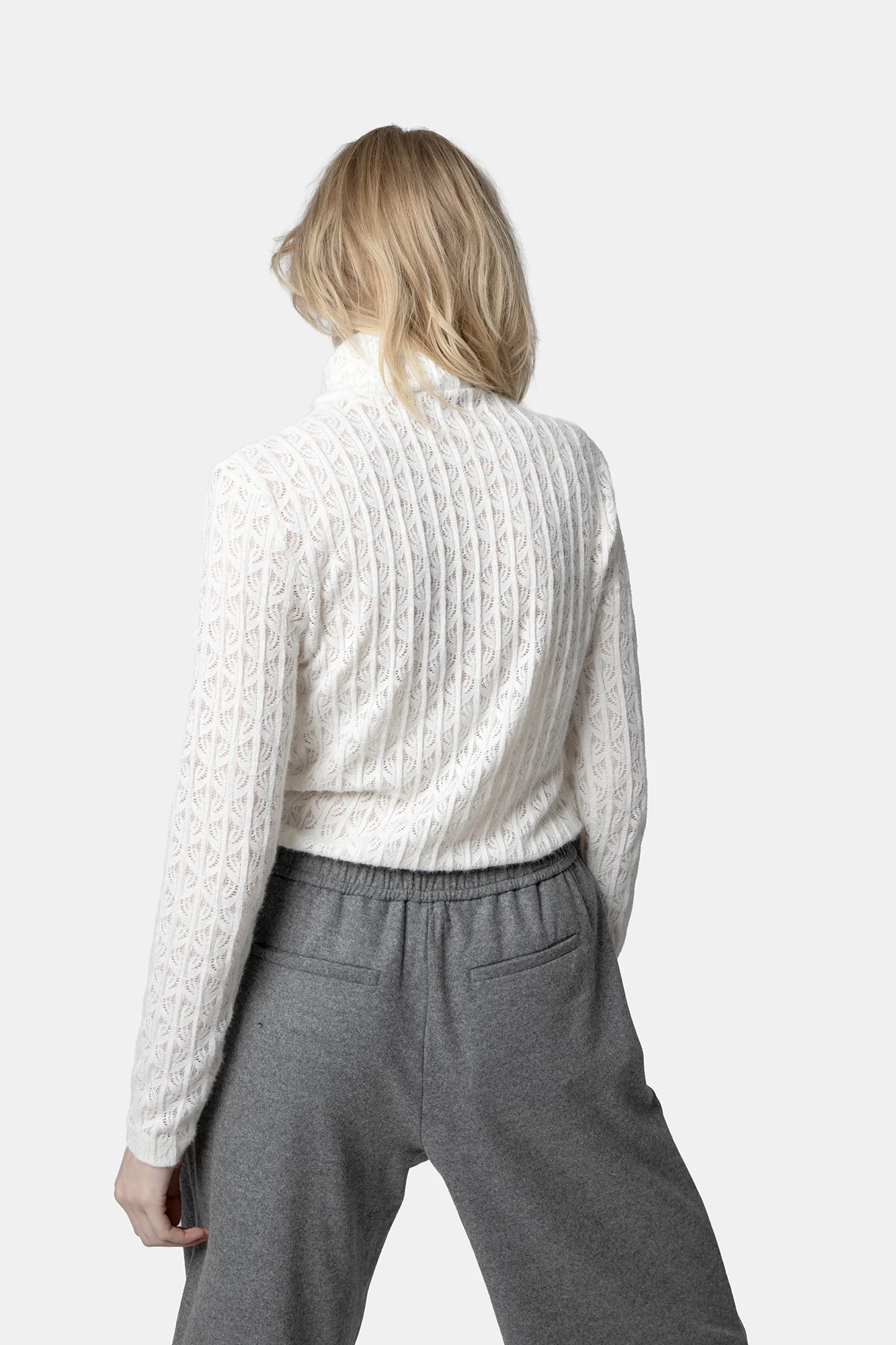 Damski biały ażurowy golf, wykonany z miękkiej lekko rozciągliwej tkaniny. Dopasowany fason, idealnie sprawdzi się do noszenia pod marynarke lub płaszcz.
