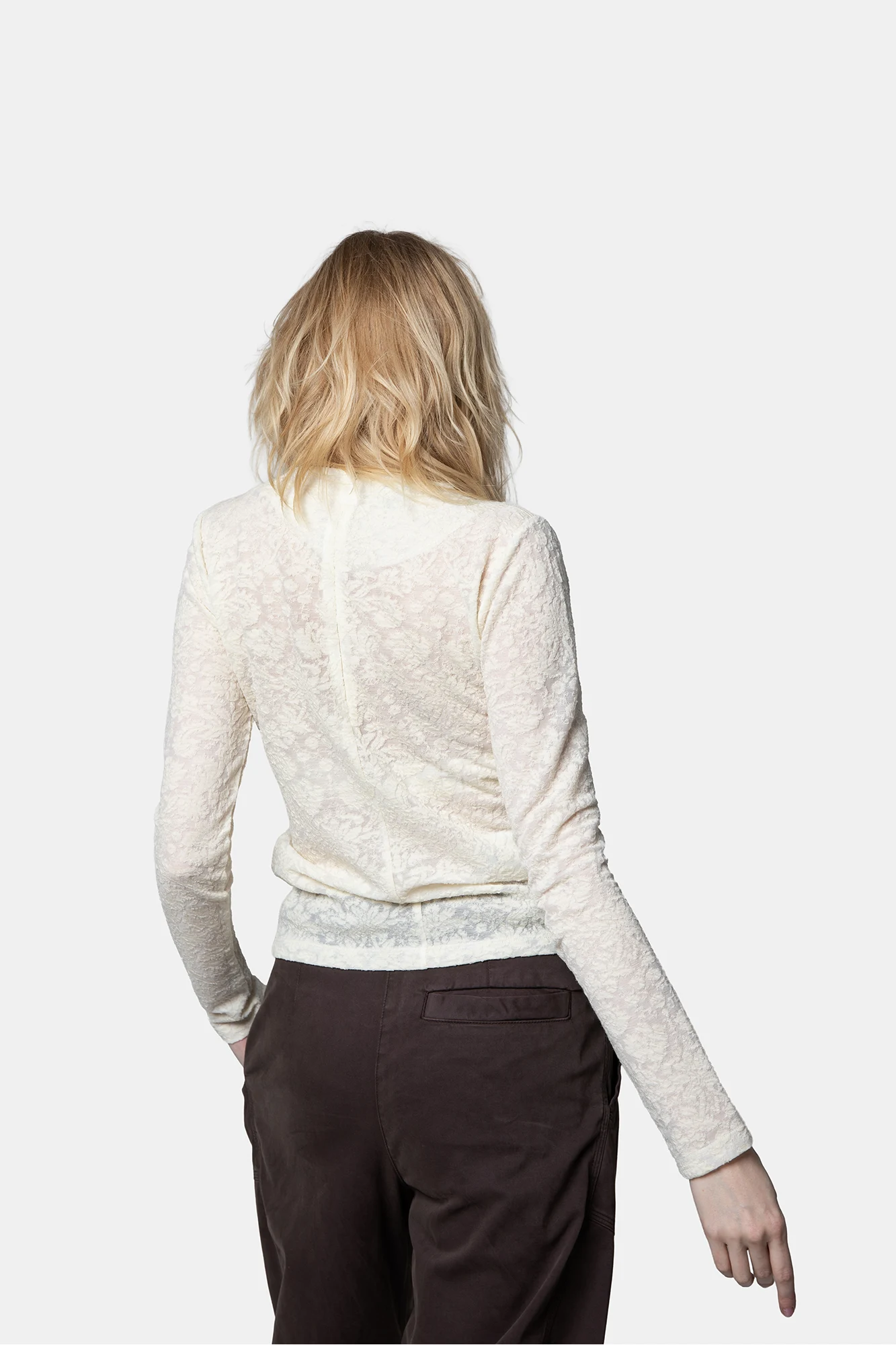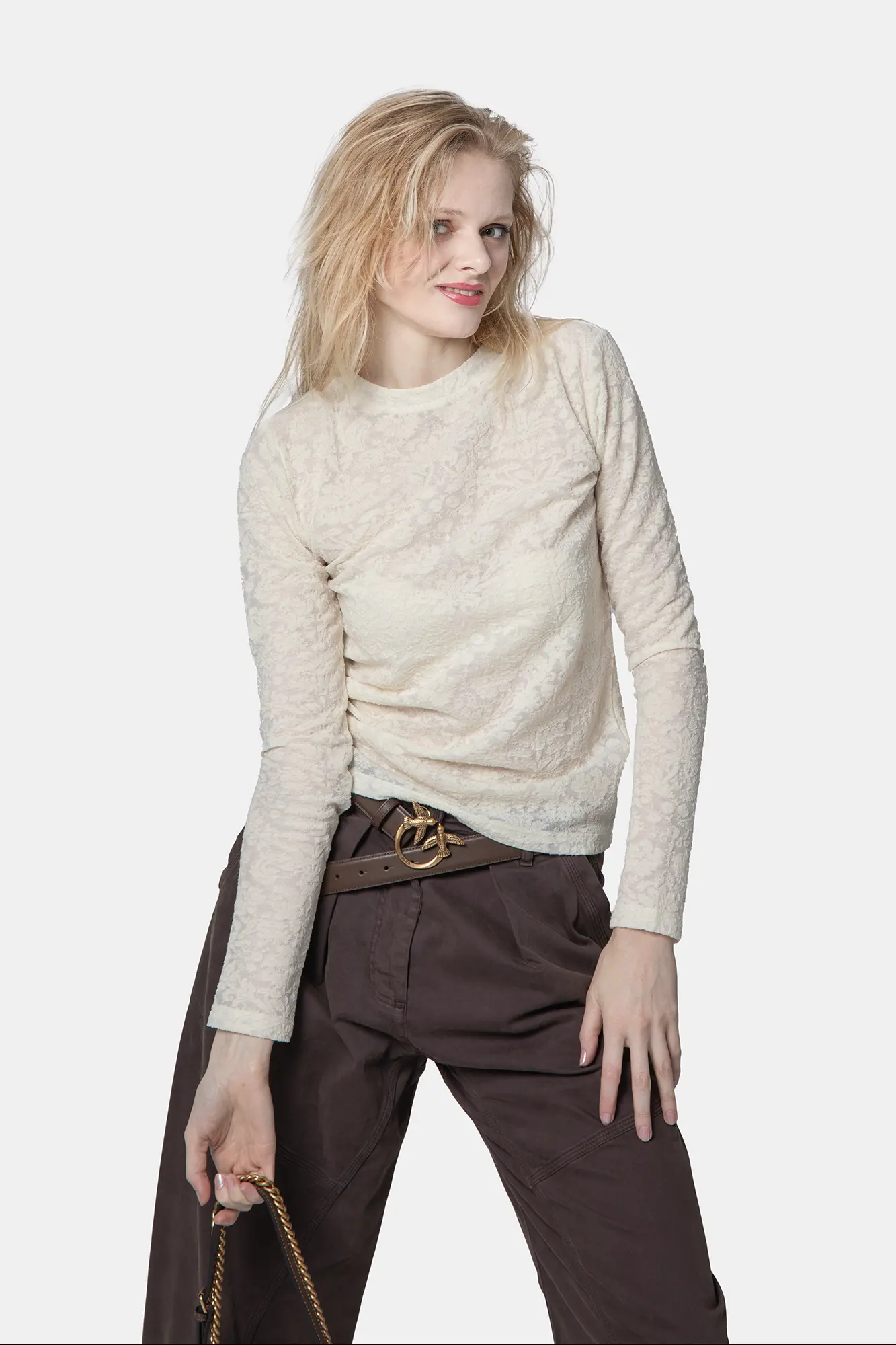 Biała elegancka bluzka koronkowa z subtelnym florystycznym motywem na całości.