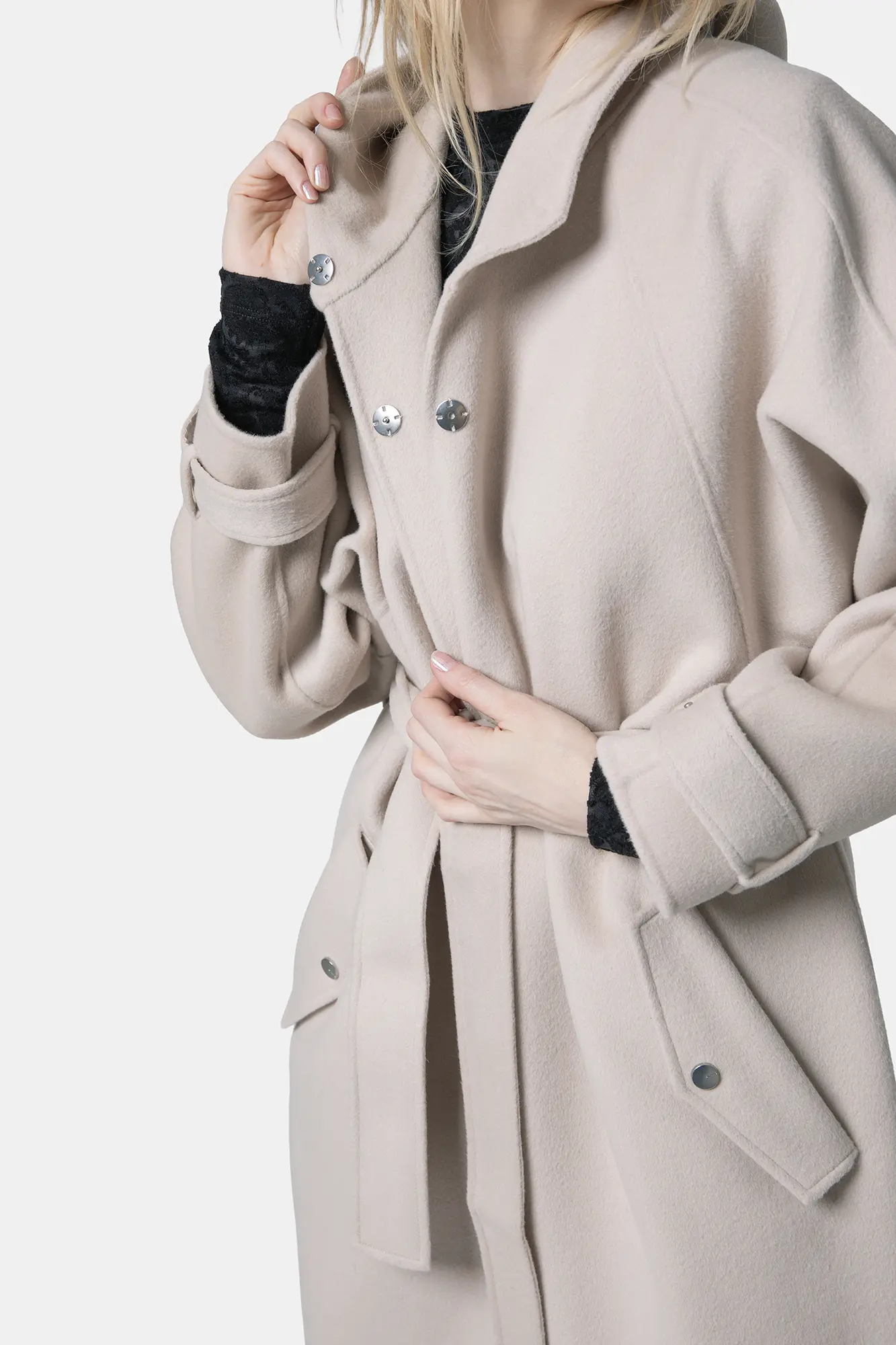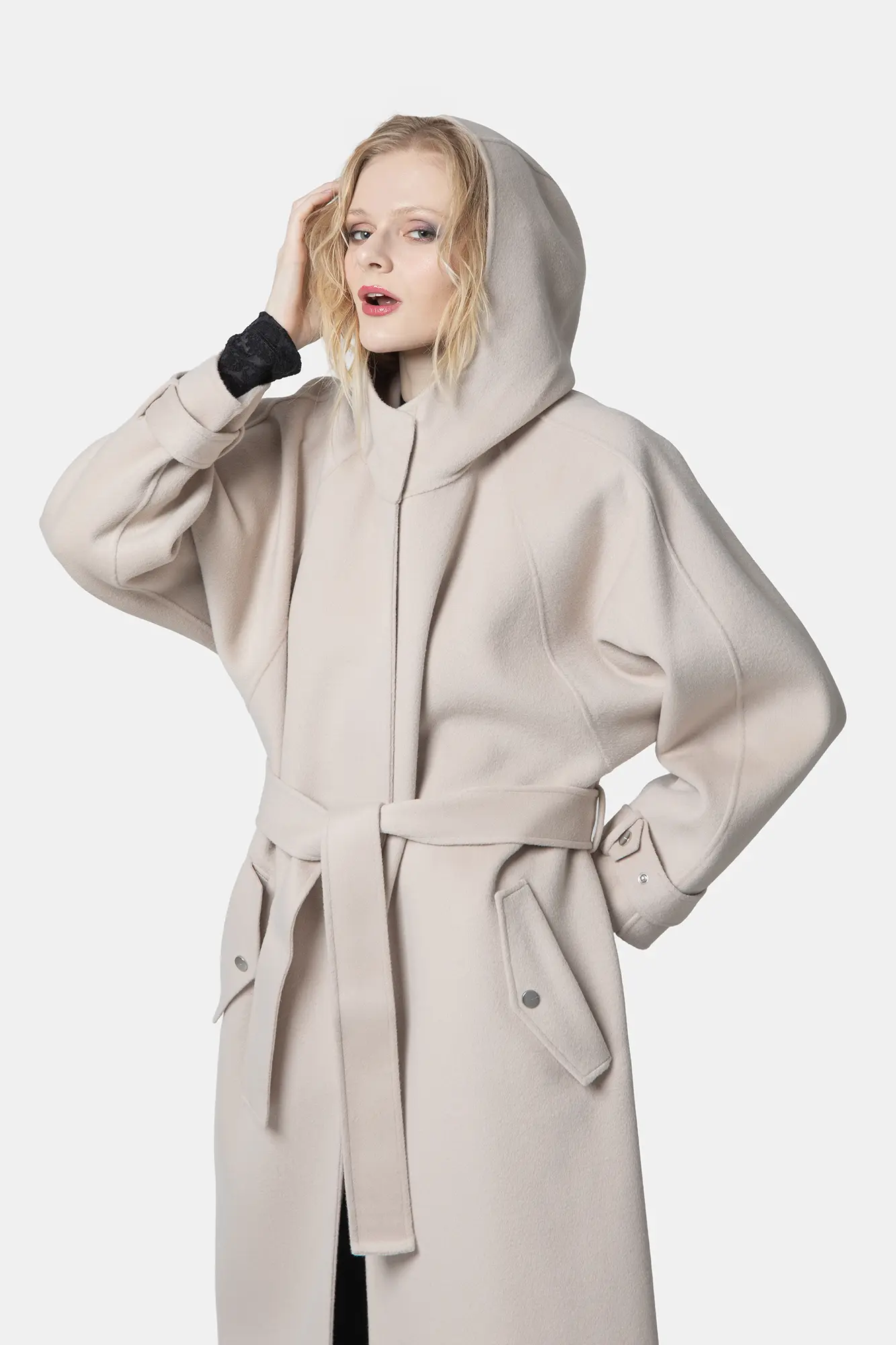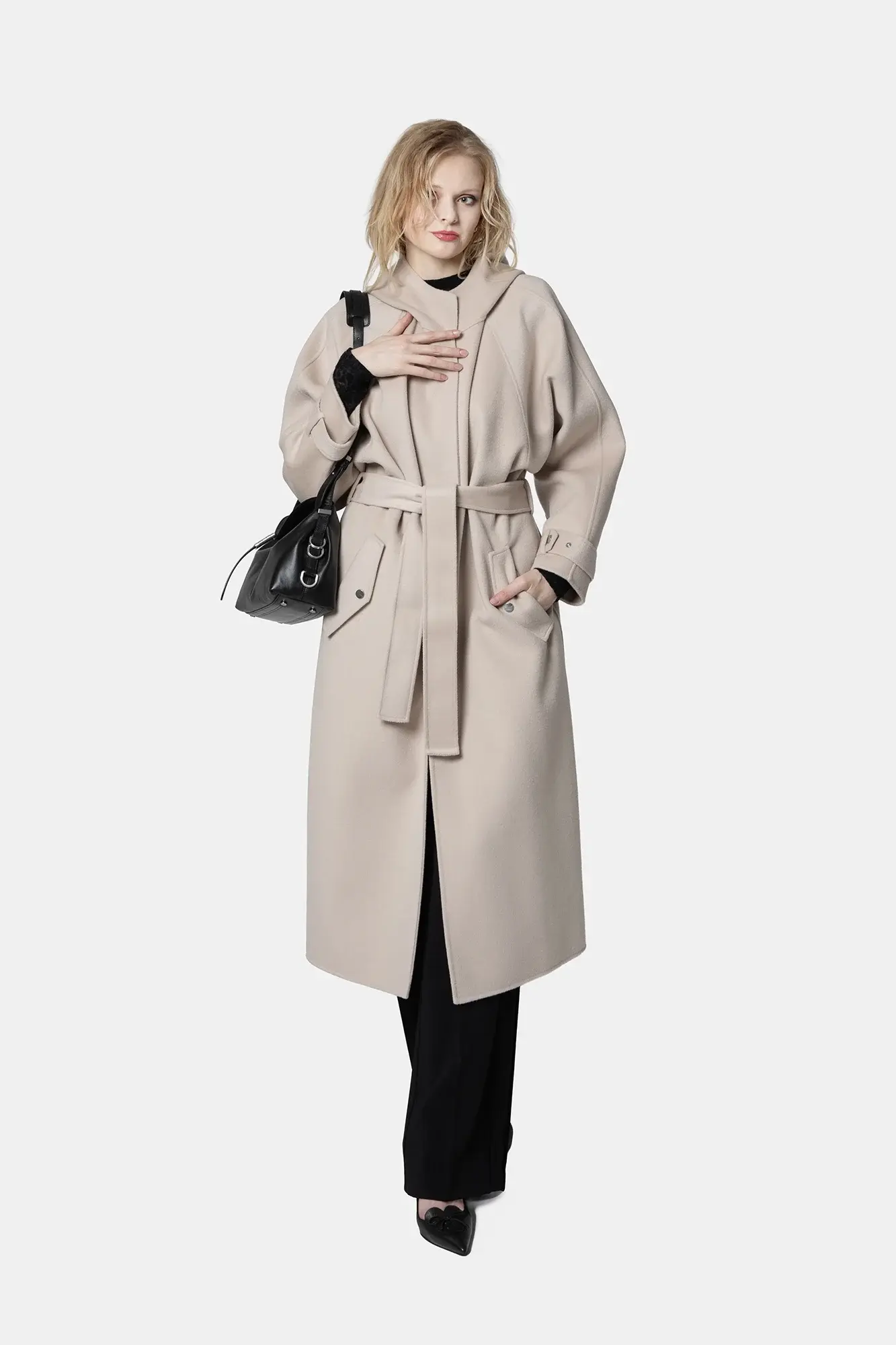Wełniany płaszcz z kapturem o luźnym kroju w kolorze delikatnego beżu, zapinany na zatrzaski z paskiem. Głębokie wpuszczane kieszenie ozdobione listwą, szeroki pasek w kolorze płaszcza oraz swobodny krój świetnie sprawdzi się w jesienno-zimowych stylizacjach, w których możemy założyć gruby sweter czy marynarkę.