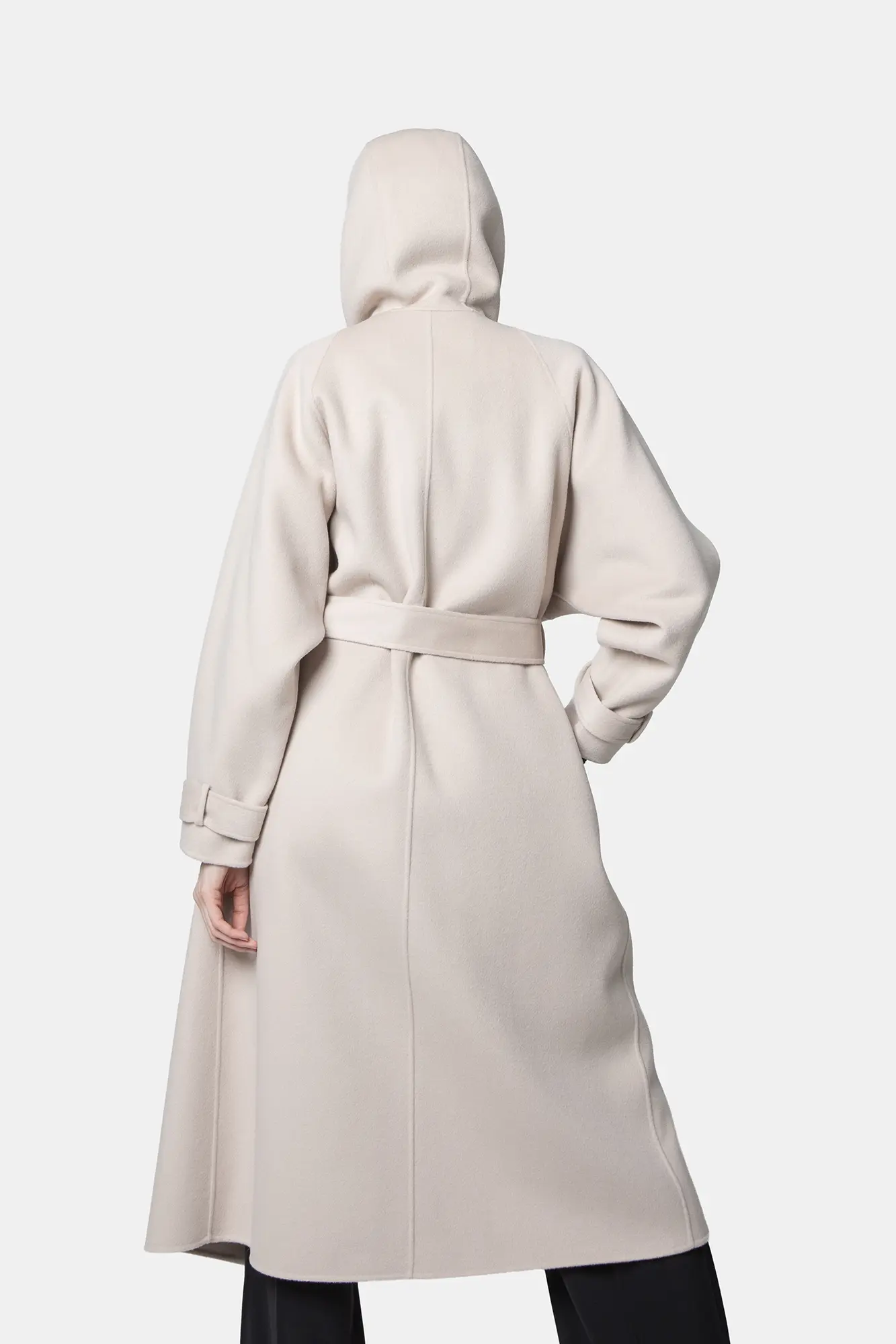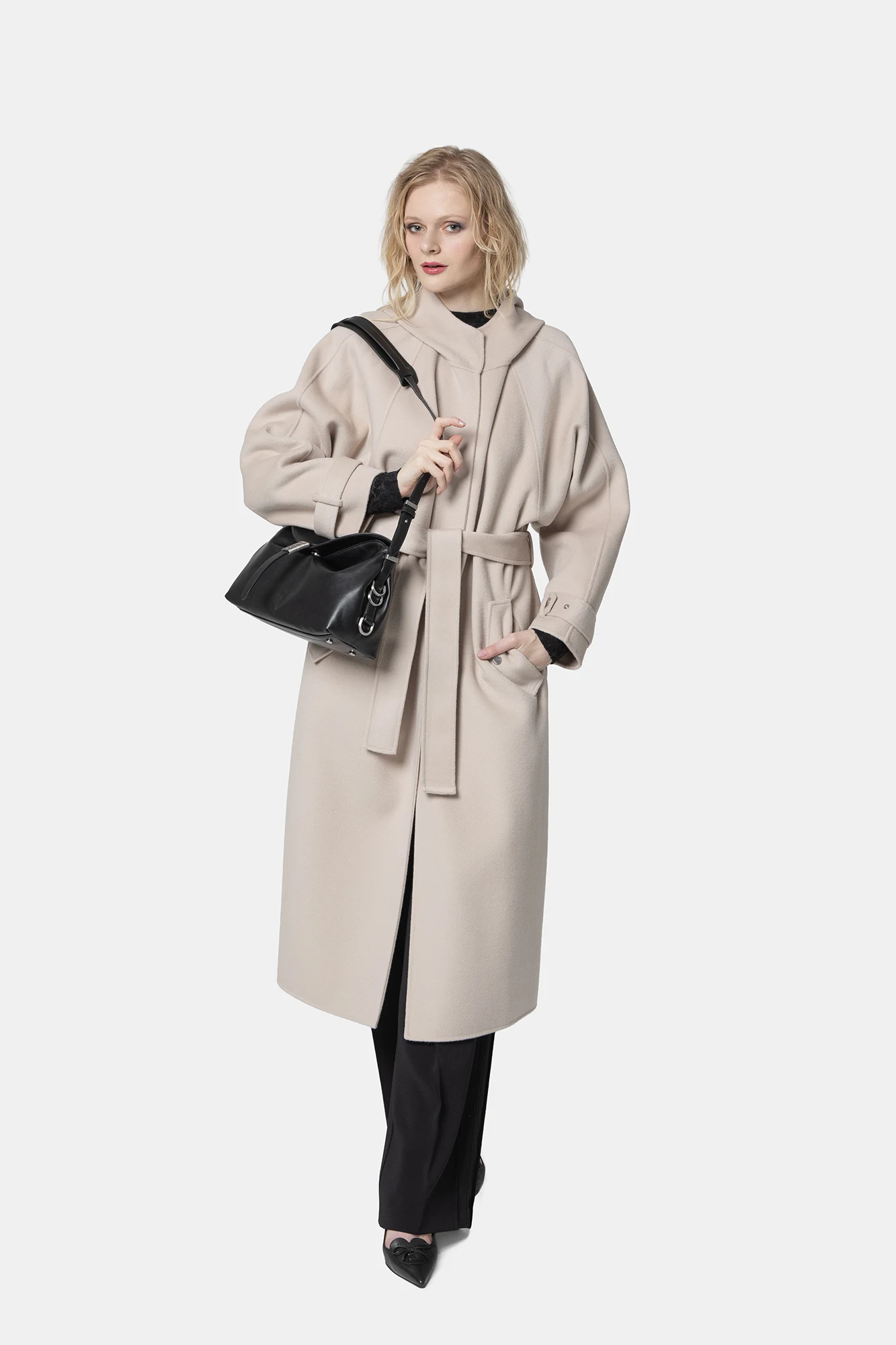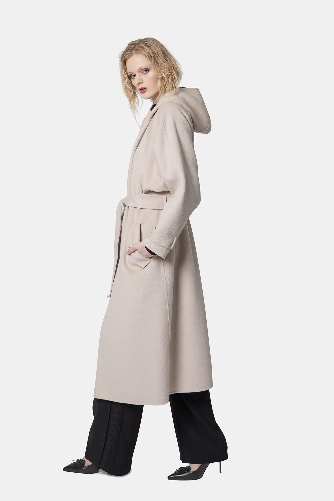Wełniany płaszcz z kapturem o luźnym kroju w kolorze delikatnego beżu, zapinany na zatrzaski z paskiem. Głębokie wpuszczane kieszenie ozdobione listwą, szeroki pasek w kolorze płaszcza oraz swobodny krój świetnie sprawdzi się w jesienno-zimowych stylizacjach, w których możemy założyć gruby sweter czy marynarkę.