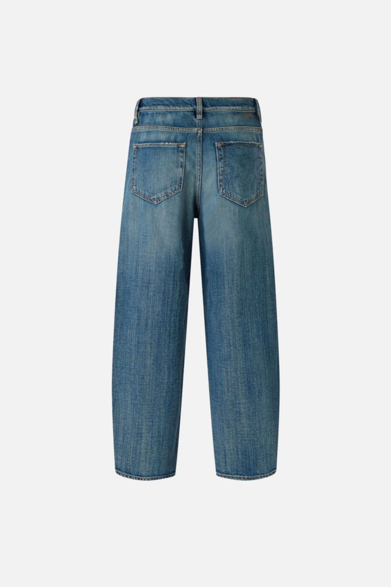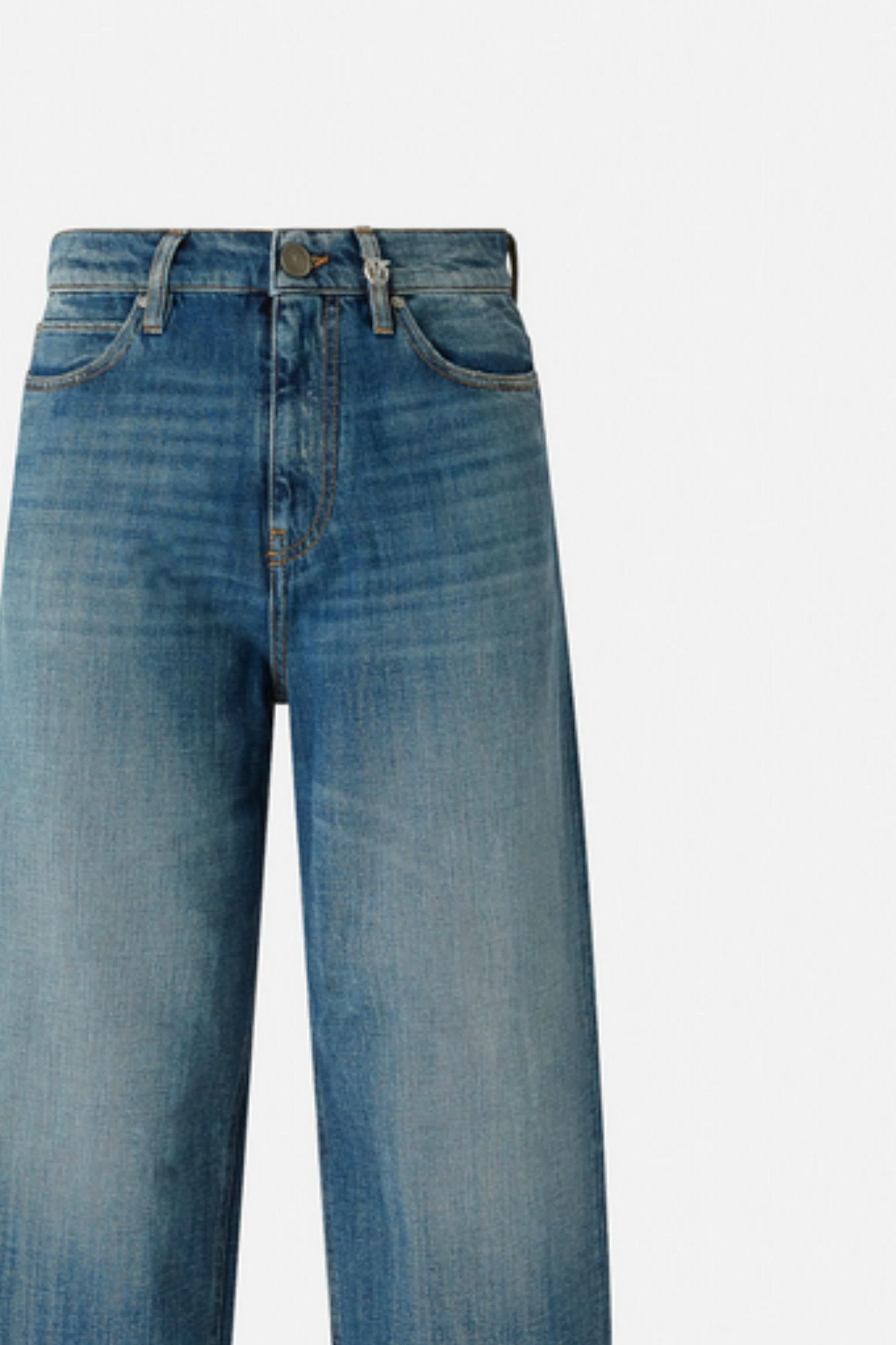 Jeansy z efektem sprania o poszerzanych nogawkach na udach i na dole, wykonane z najwyższej jakości bawełny.