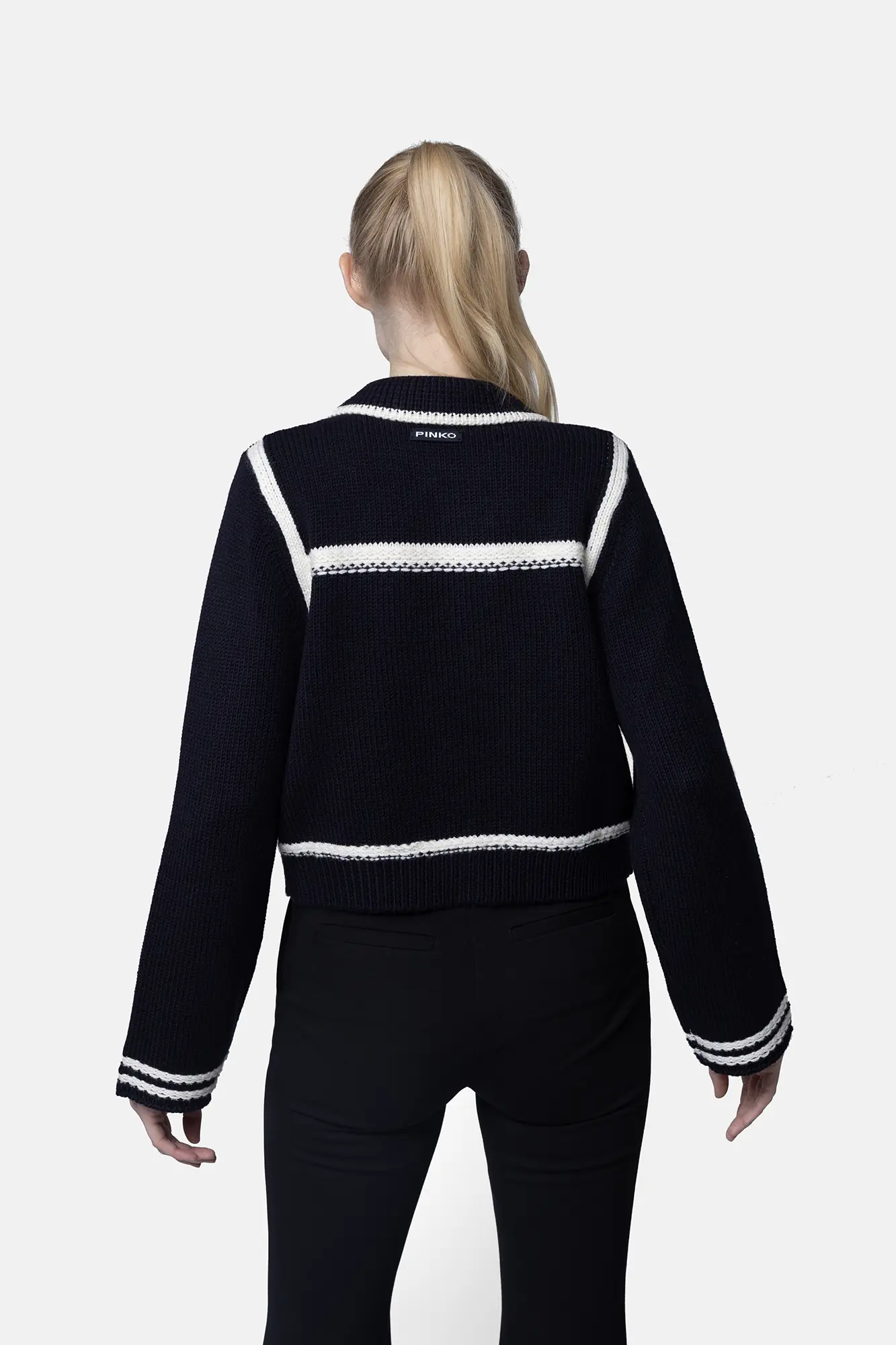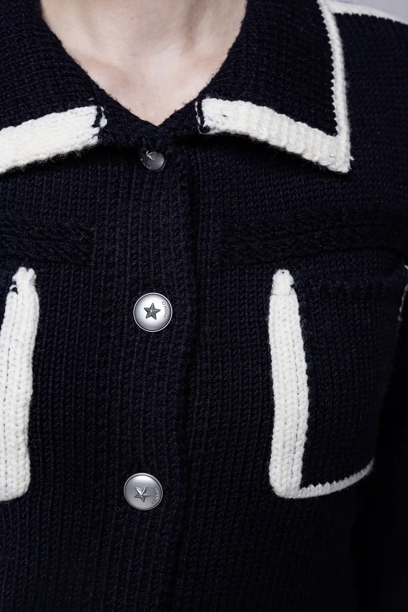 - Ozdoba: Ozdobne guziki w kolorze srebrnym, naszywka z nazwą marki PINKO