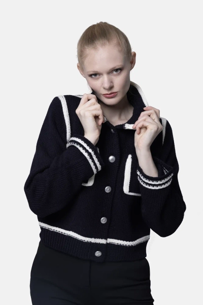 Piękny kardigan damski z wełny merynosów, zapinany na guziki ozdobione gwiazdką w kolorze srebrnym. Ten model to połączenie elegancji w stylu włoskiej Riwiery ze stylem preppy. Wykonany z ciepłej wełny merynosów, gwarantuje wysoki komfort noszenia. Wysoką jakość wykonania i trwałość materiału potwierdzono w testach. Z tyłu, pod kołnierzem, umieszczono naszywkę z nazwą marki.