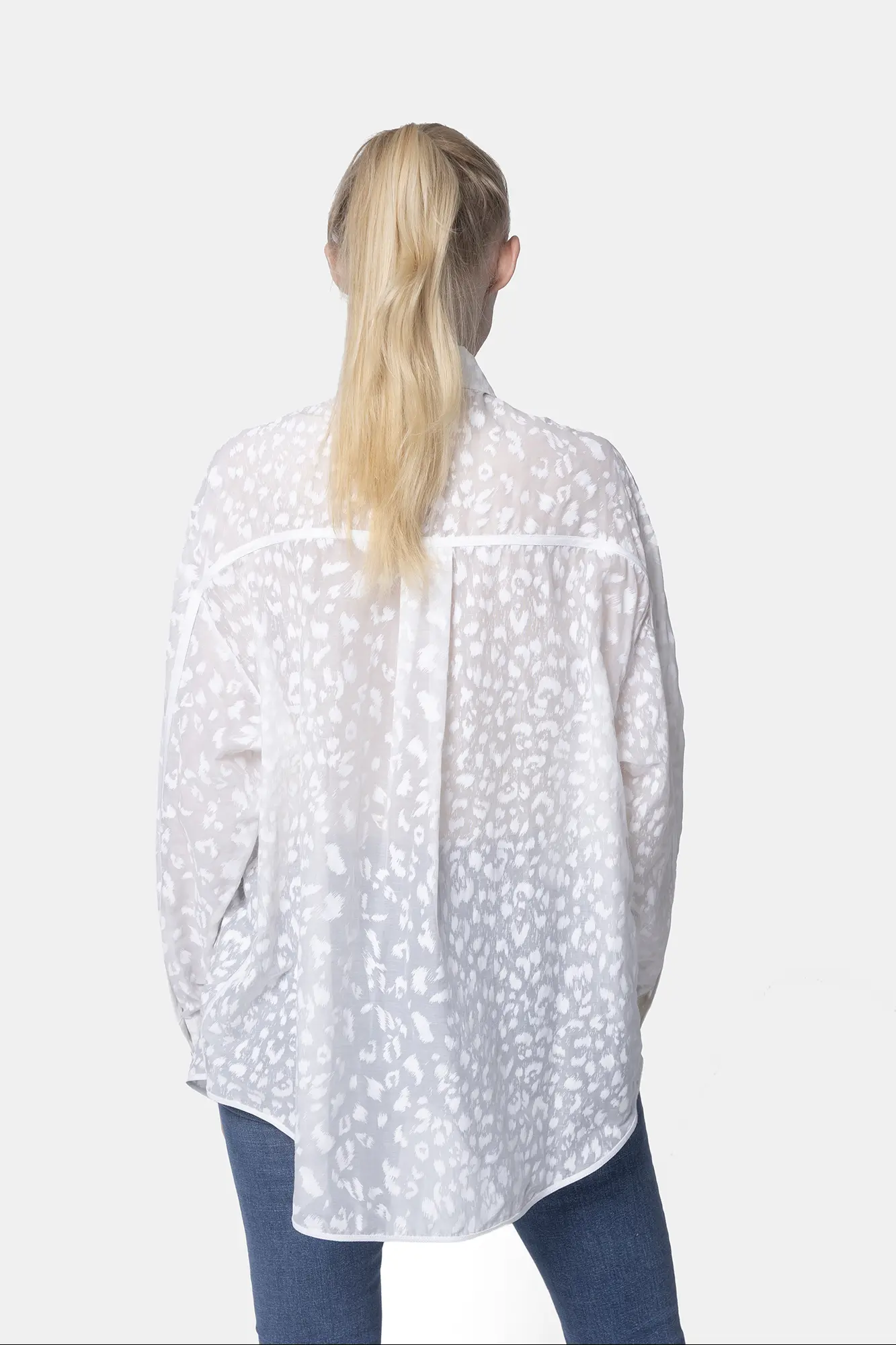 Lekka damska koszula oversize wykonana z bawełny i jedwabiu z printem na całości.