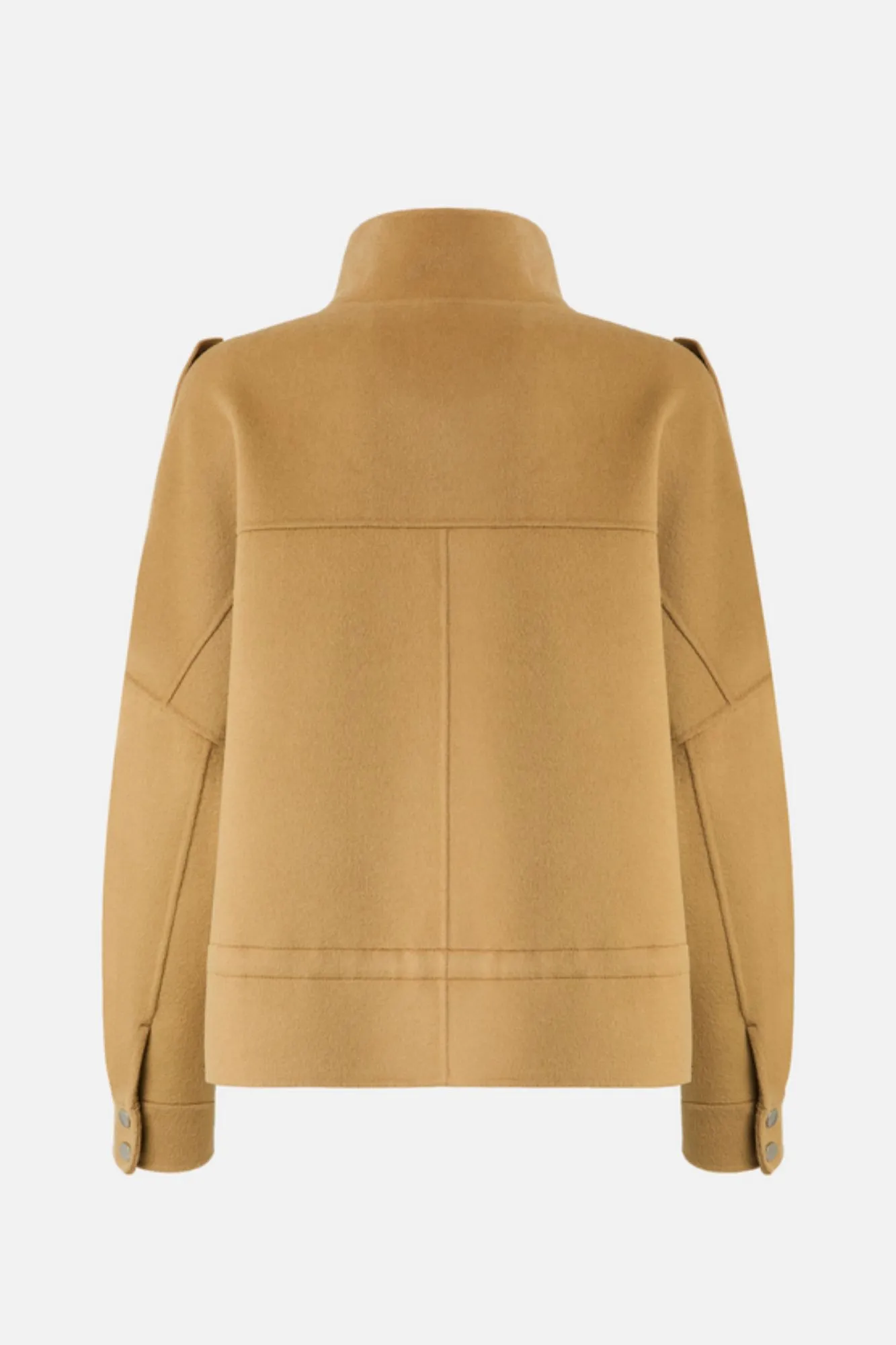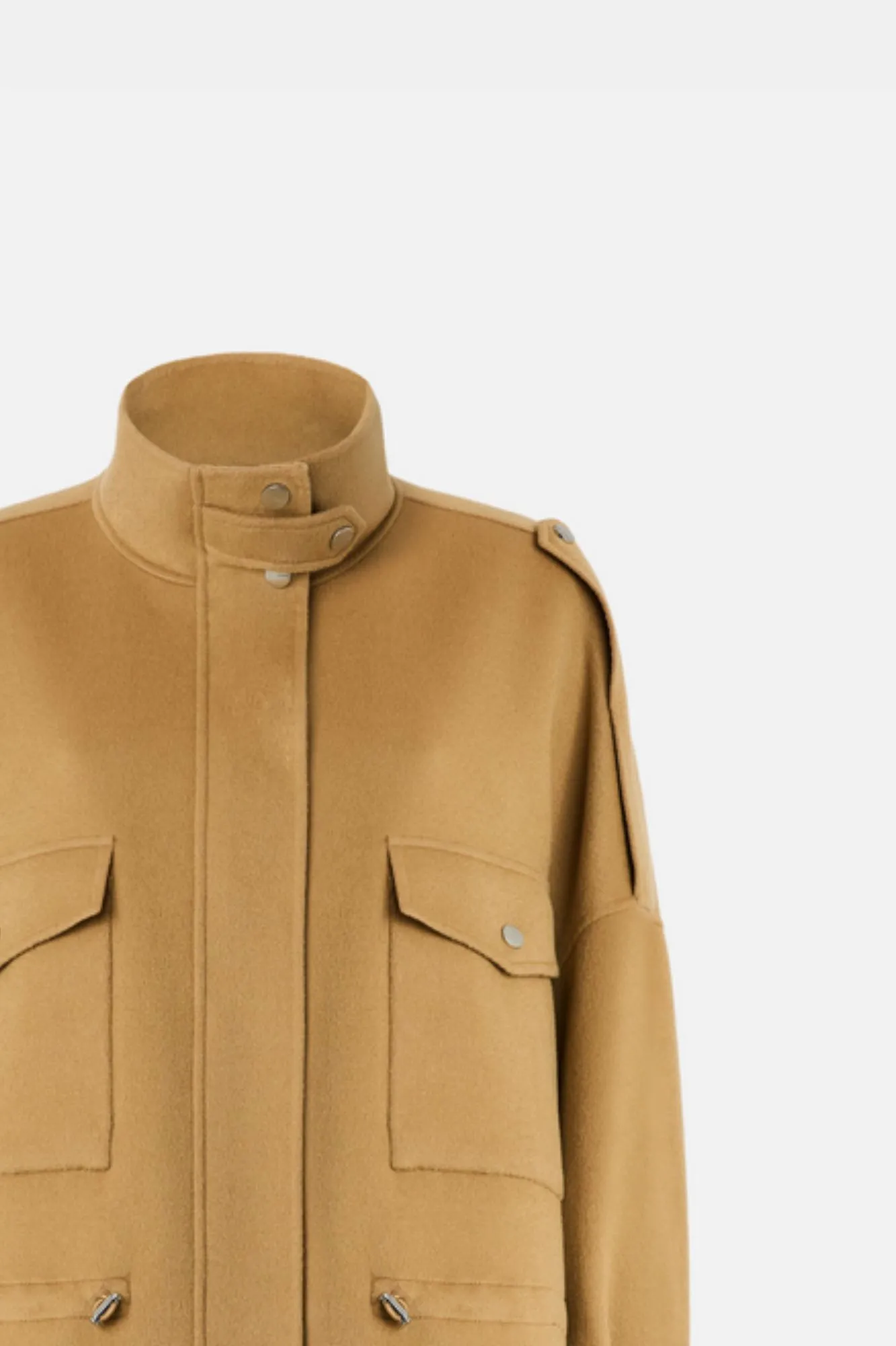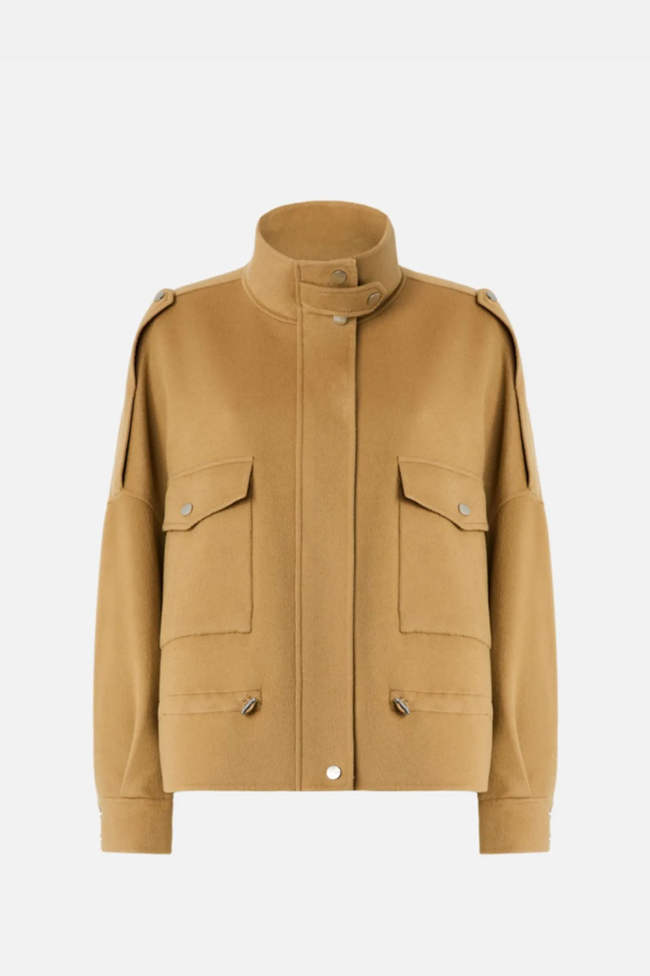 Wełniana kurtka damska PINKO z wysokim kołnierzem, o nowczesnym fasonie z obniżoną linią ramion, krótka z troczkami, które pozwalają na doposowanie do sylwetki.