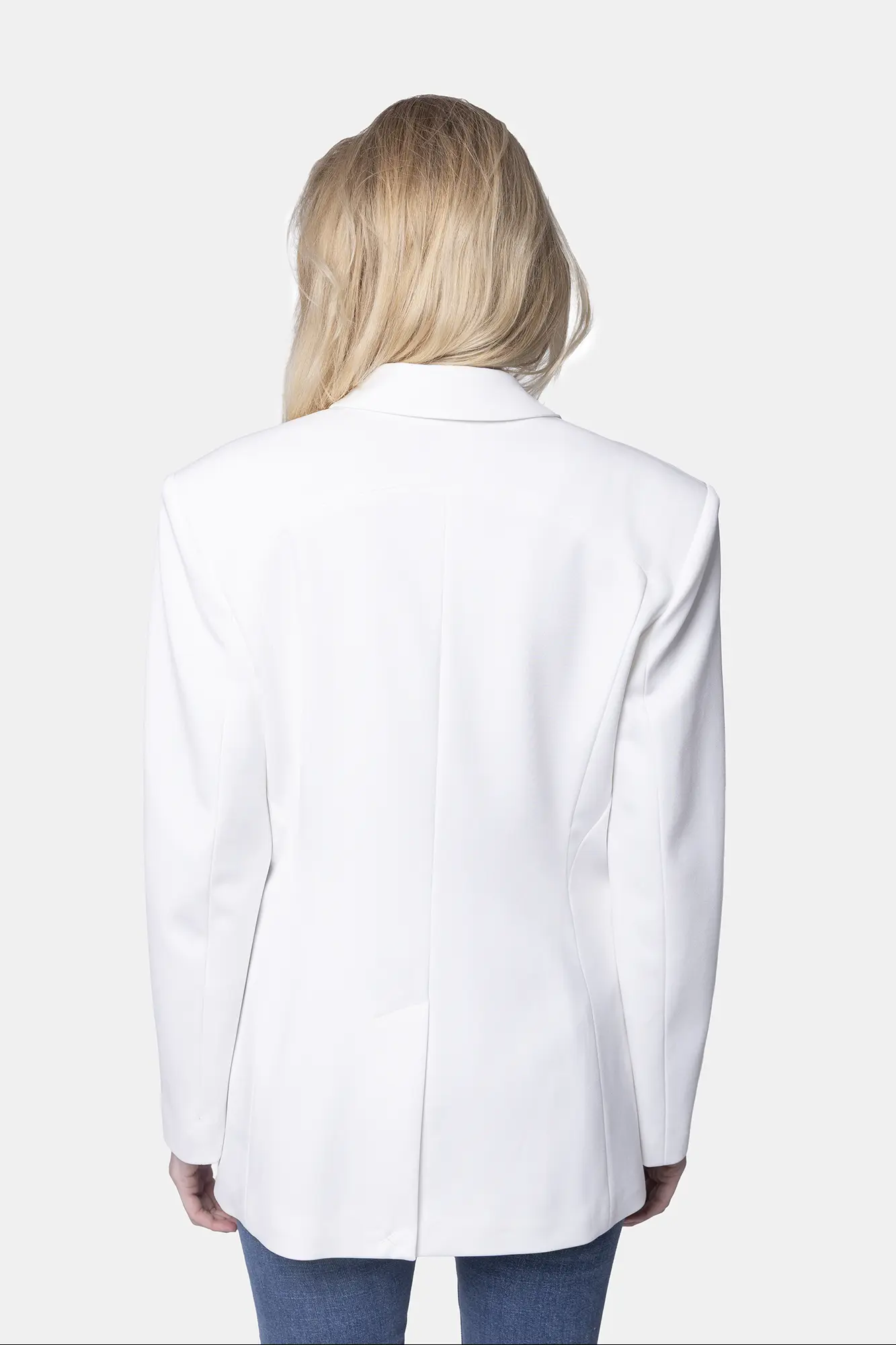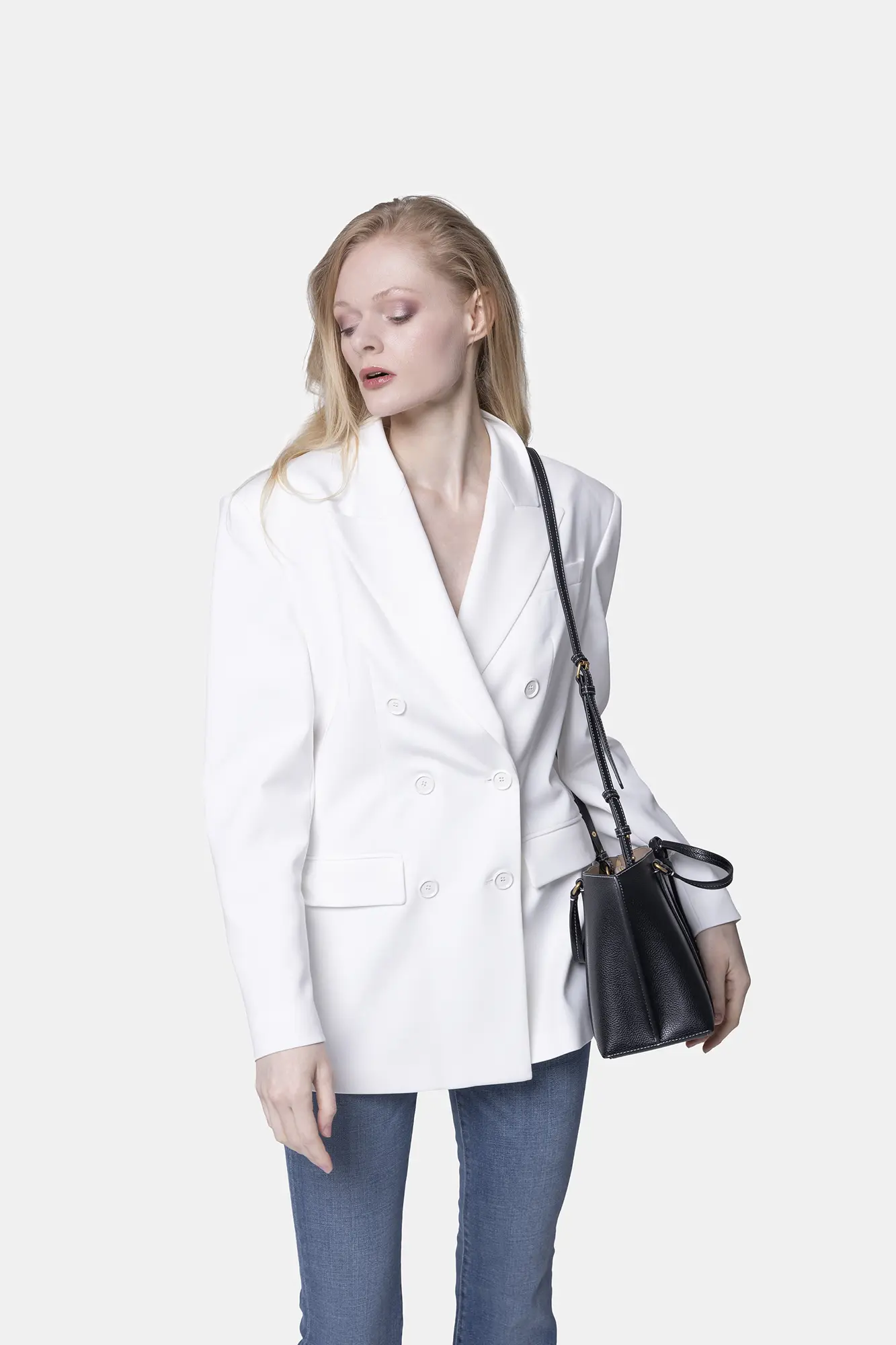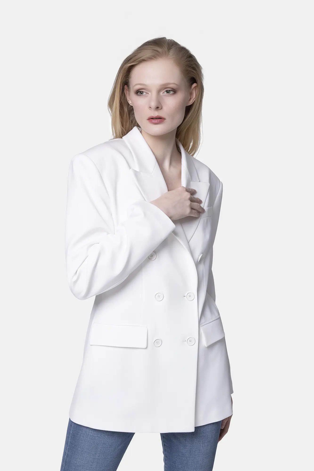 Elegancka marynarka dwurzędowa wykonana z najwyższej jakości materiału wykończona podszewką. Marynarka ma poszerzoną linię ramion. Idealna propozyja do jeansów i materiałowych spodni.