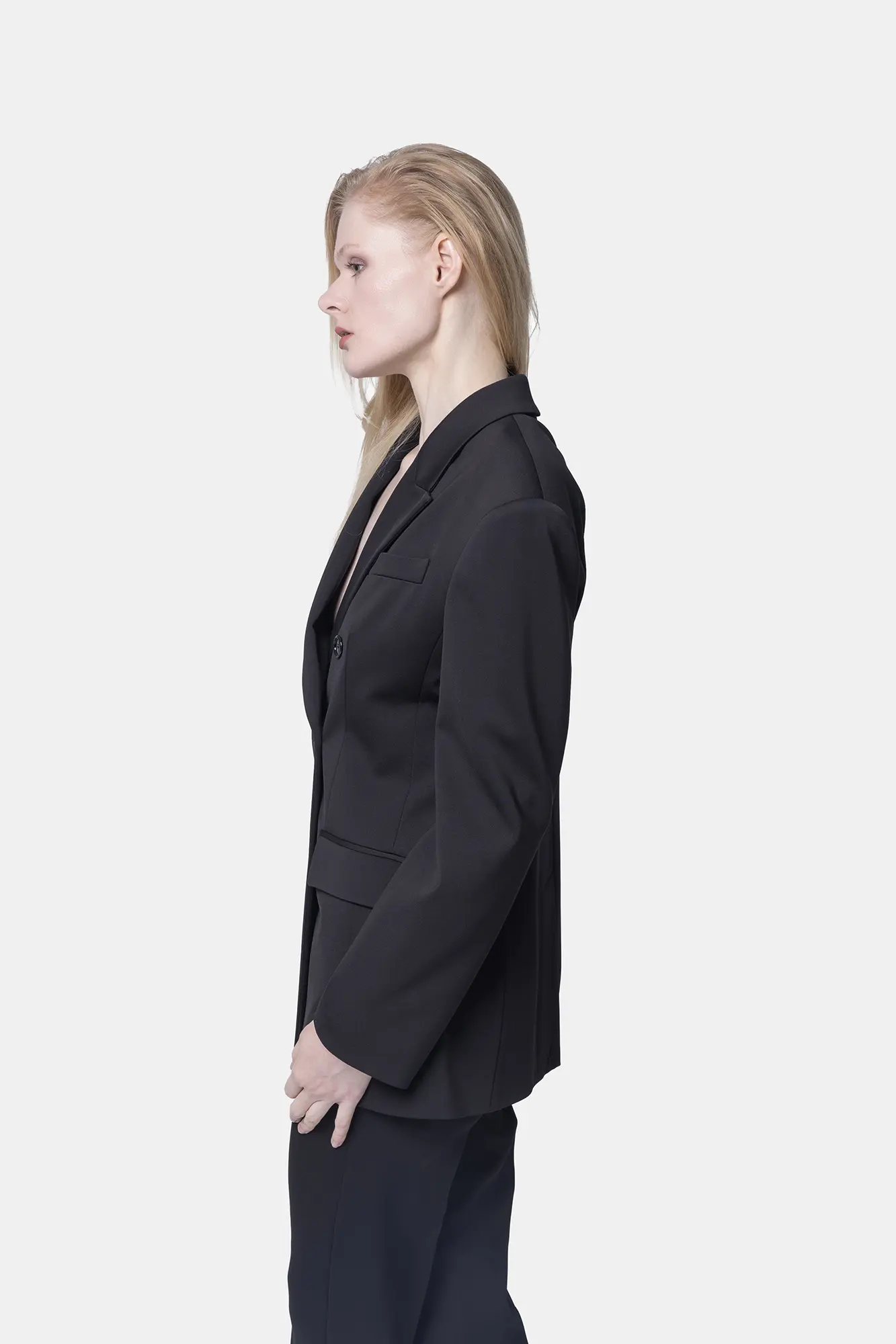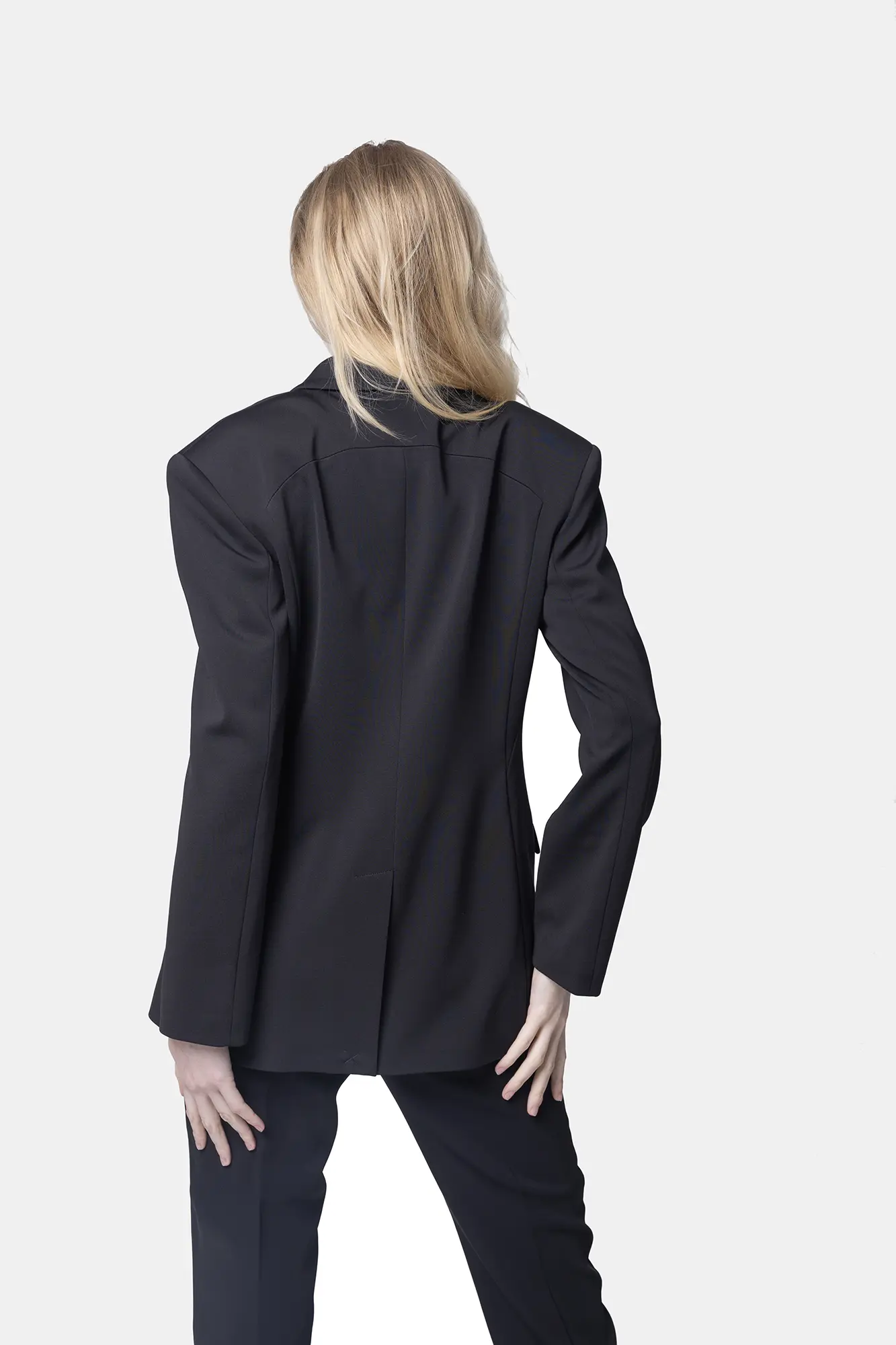 Czarna marynarka damska z poszerzoną linią ramion - szczegóły modelu:
