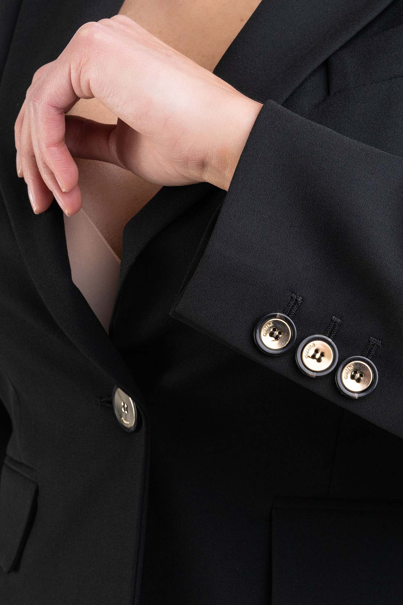 Czarna marynarka PINKO Humahuaca. Krótka, taliowana marynarka z długim rękawem z guzikami. Kieszenie z patką po bokach. Jednorzędowe zapięcie na jeden złoty guzik.
