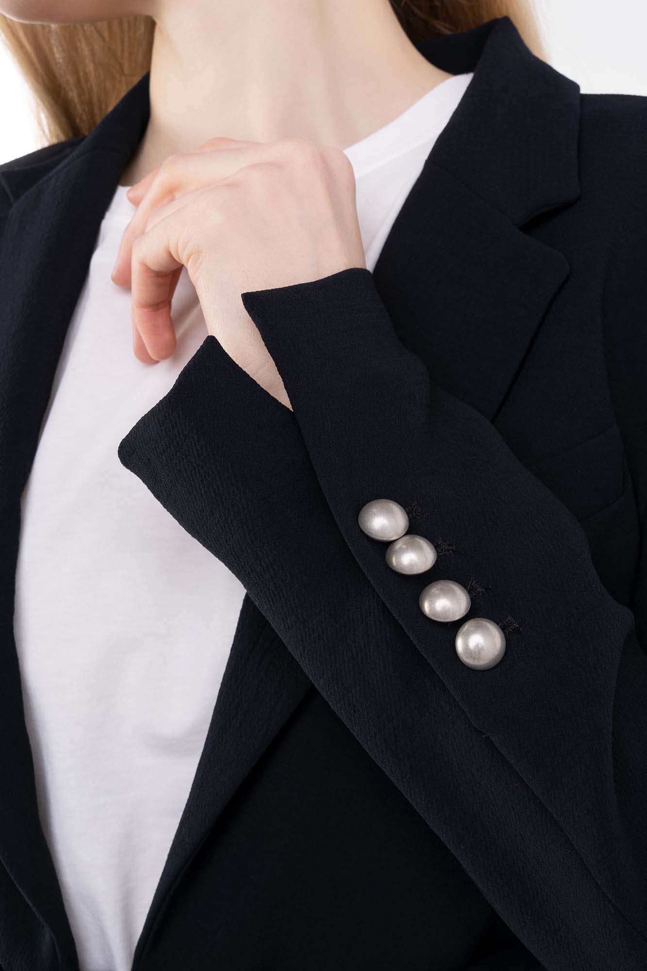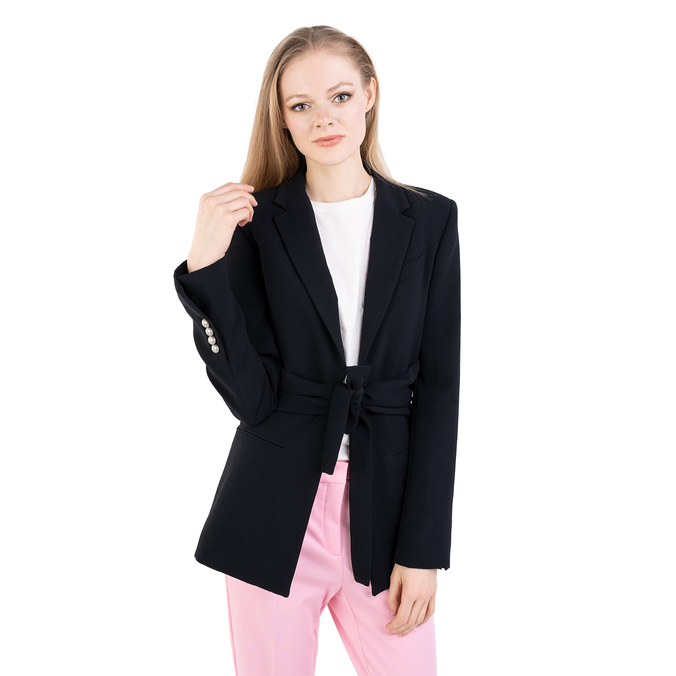 Materiałowa marynarka PINKO, taliowana o luźnym kroju. Wiązana w tali ozdobną szarfą. Z długim rękawem zakończonym guzikami. Z rozcięciem z tyłu u dołu.