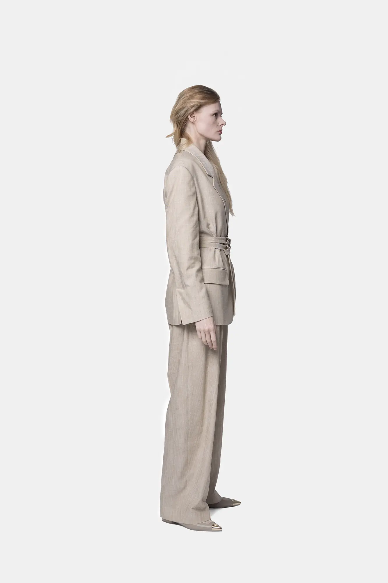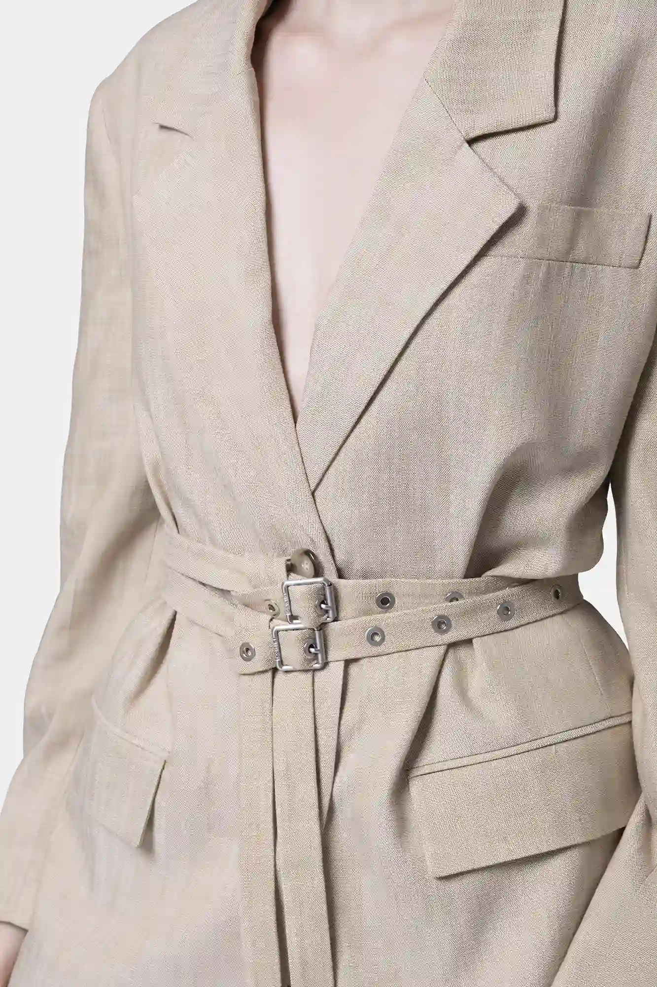 Elegancka marynarka wykonana z płutna, wiskozy i jedwabiu, zapinana na dwa guziki i podwójny pasek, podkreśla talię.