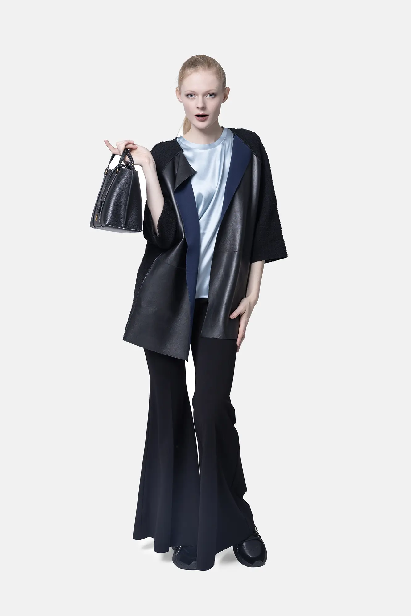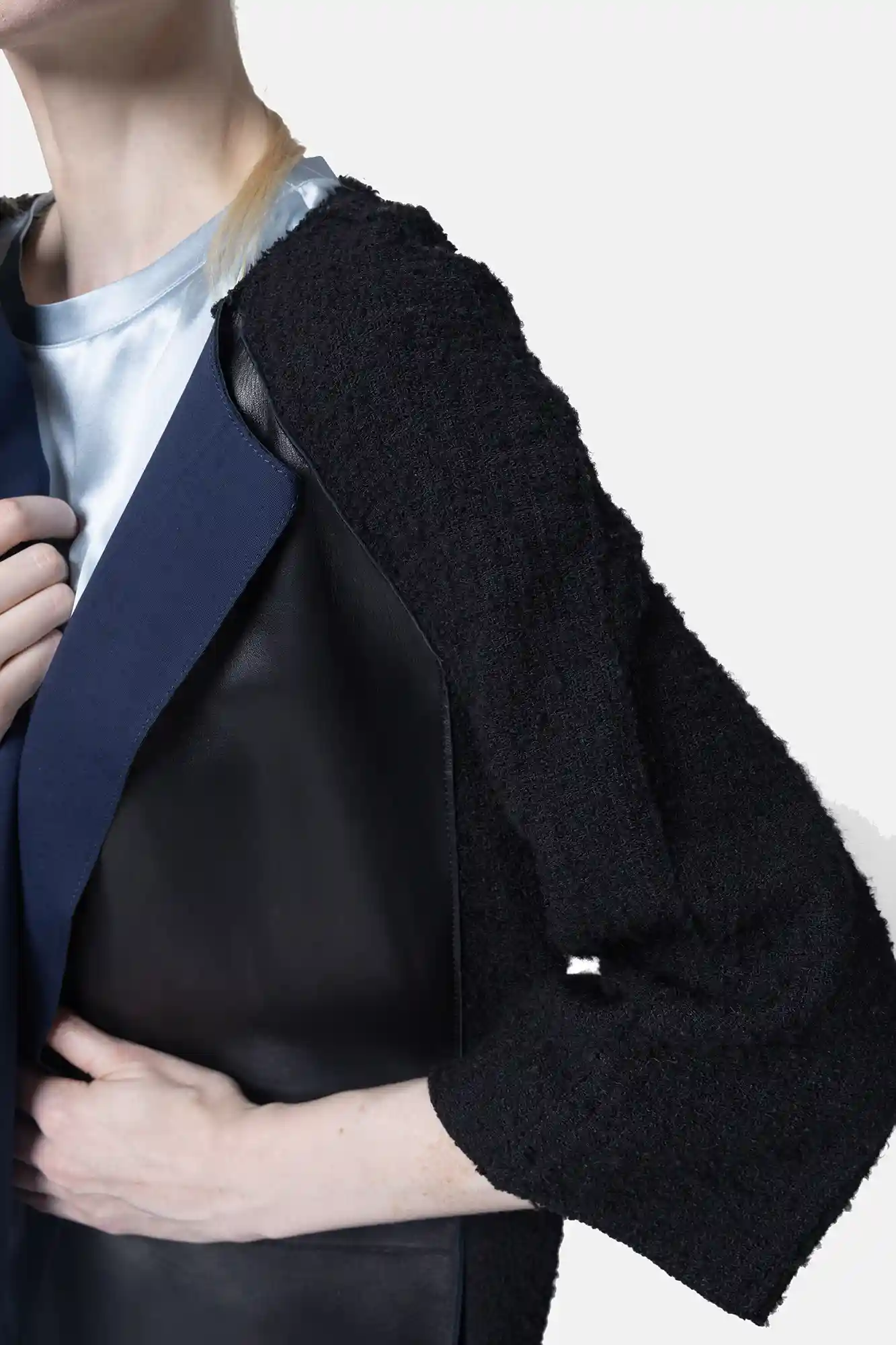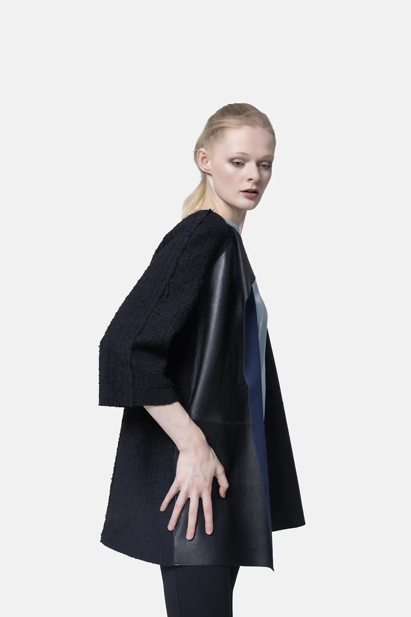 Skórzana narzutka PINKO bez zapięcia o luźny fasonie nadającym sylwetce lekkości. Przód wykonany z naturalnej skóry, który nadaje jej efekt rockowego pazura, rękawy i tył uszyto z wieloskładnikowych miękkich tkanin podnoszący komfort noszenia. Granatowe klapy przełamują czerń i dodają kolorystycznego urozmaicenia, które w całości jest nietuzinkową i zwracającą uwagę propozycją dla odważych kobiet.