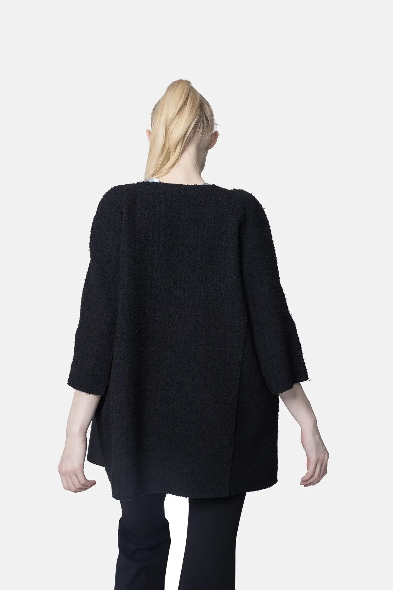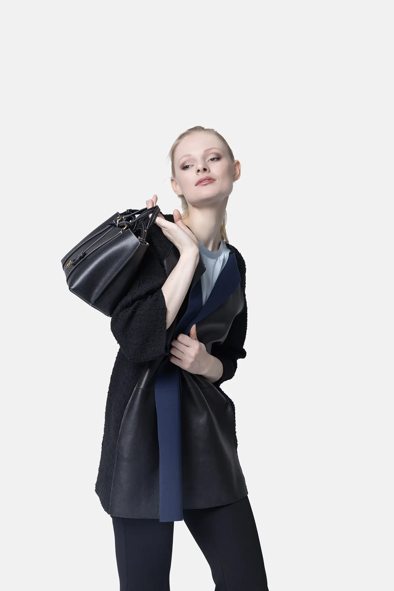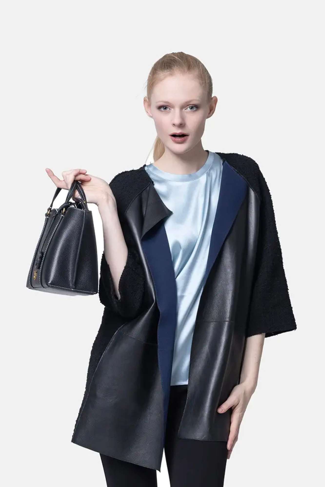 Skórzana narzutka PINKO bez zapięcia o luźny fasonie nadającym sylwetce lekkości. Przód wykonany z naturalnej skóry, który nadaje jej efekt rockowego pazura, rękawy i tył uszyto z wieloskładnikowych miękkich tkanin podnoszący komfort noszenia. Granatowe klapy przełamują czerń i dodają kolorystycznego urozmaicenia, które w całości jest nietuzinkową i zwracającą uwagę propozycją dla odważych kobiet.