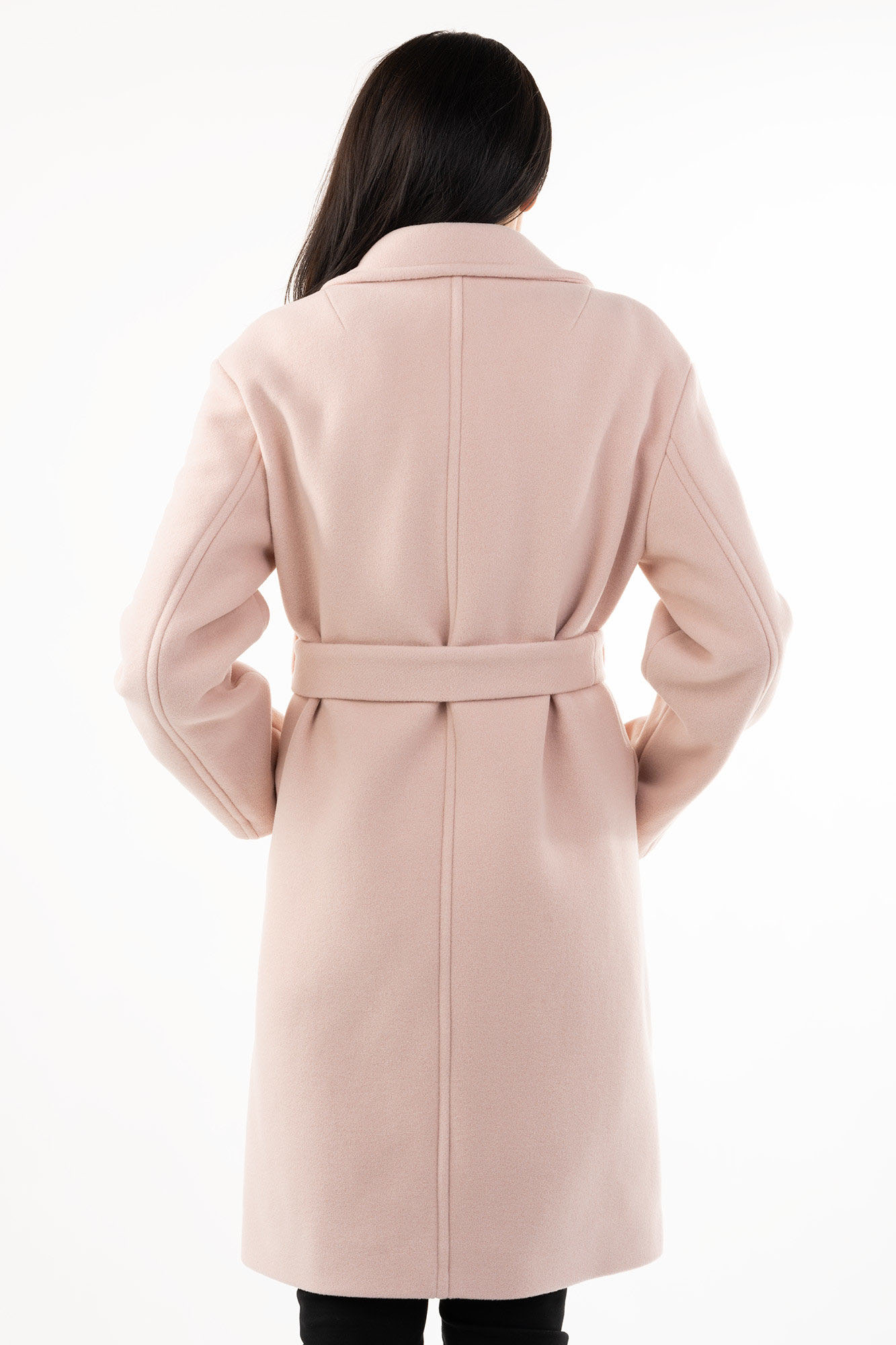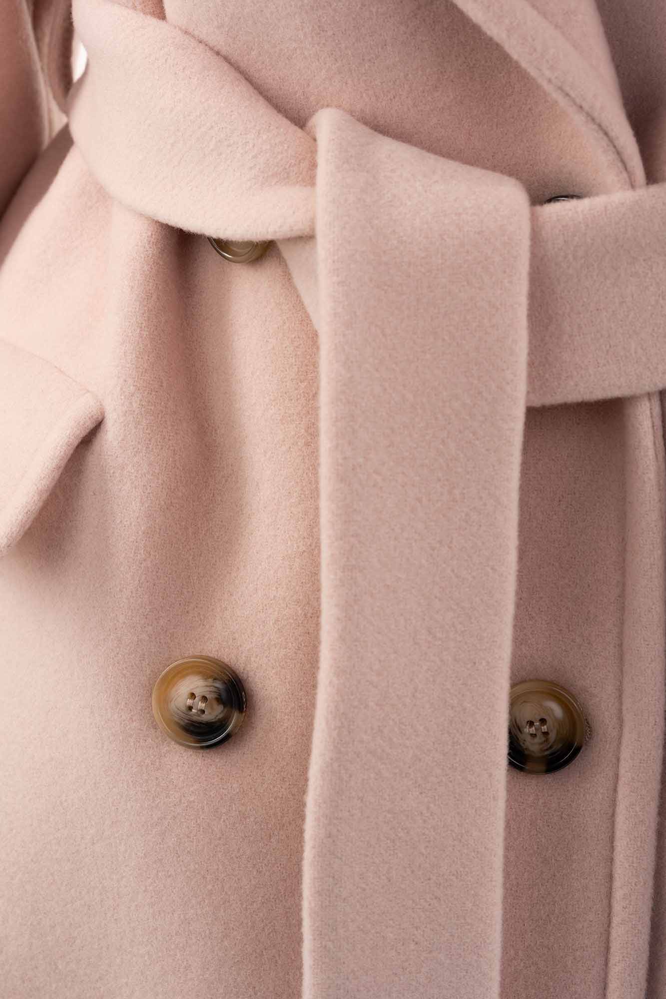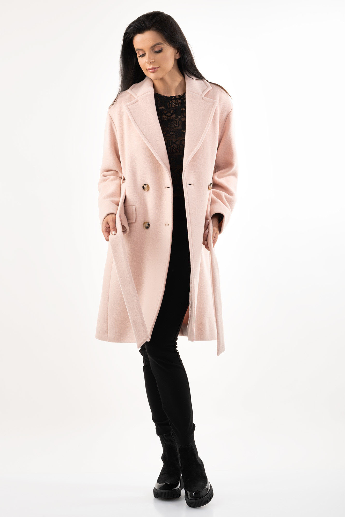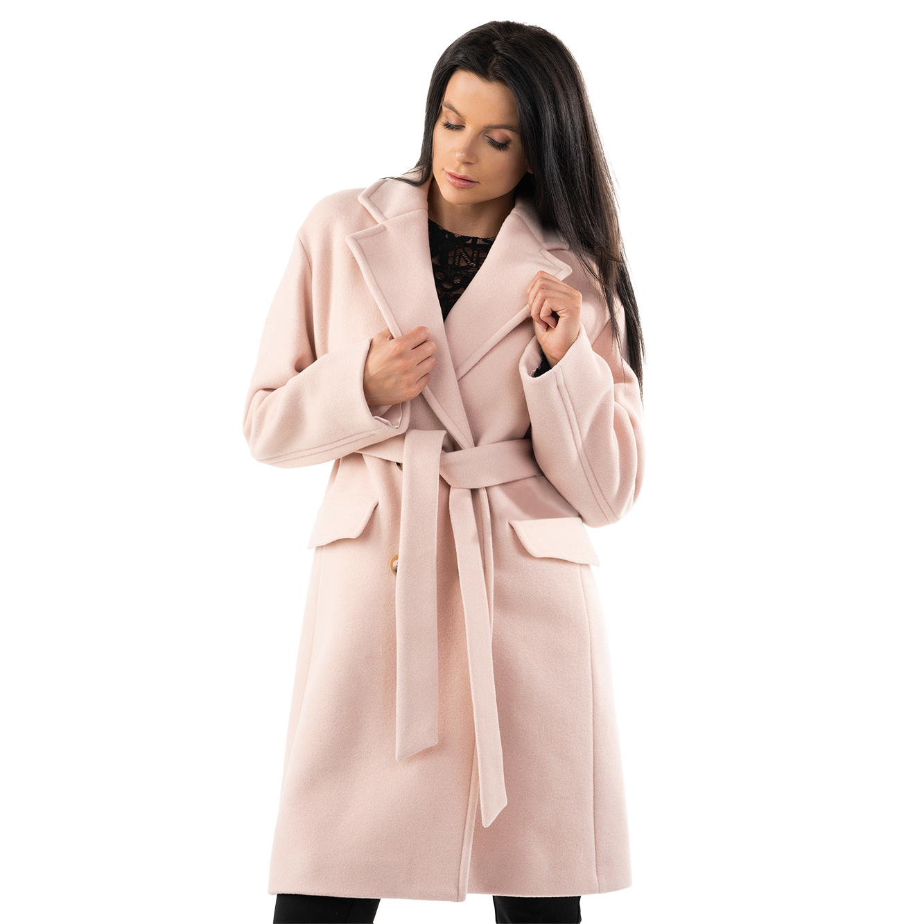 Damski płaszcz w kolorze delikatnego różu. Szerokie klapy typu otwartego, z przodu dwa rzędy dużych dwukolorowych guzików. Rozkloszowany fason, w pasie zdobiony wiązanym paskiem subtelnie podkreślający talię. Z przodu kieszenie, nad nimi patki. Pod spodem podszewka w tożsamym kolorze.