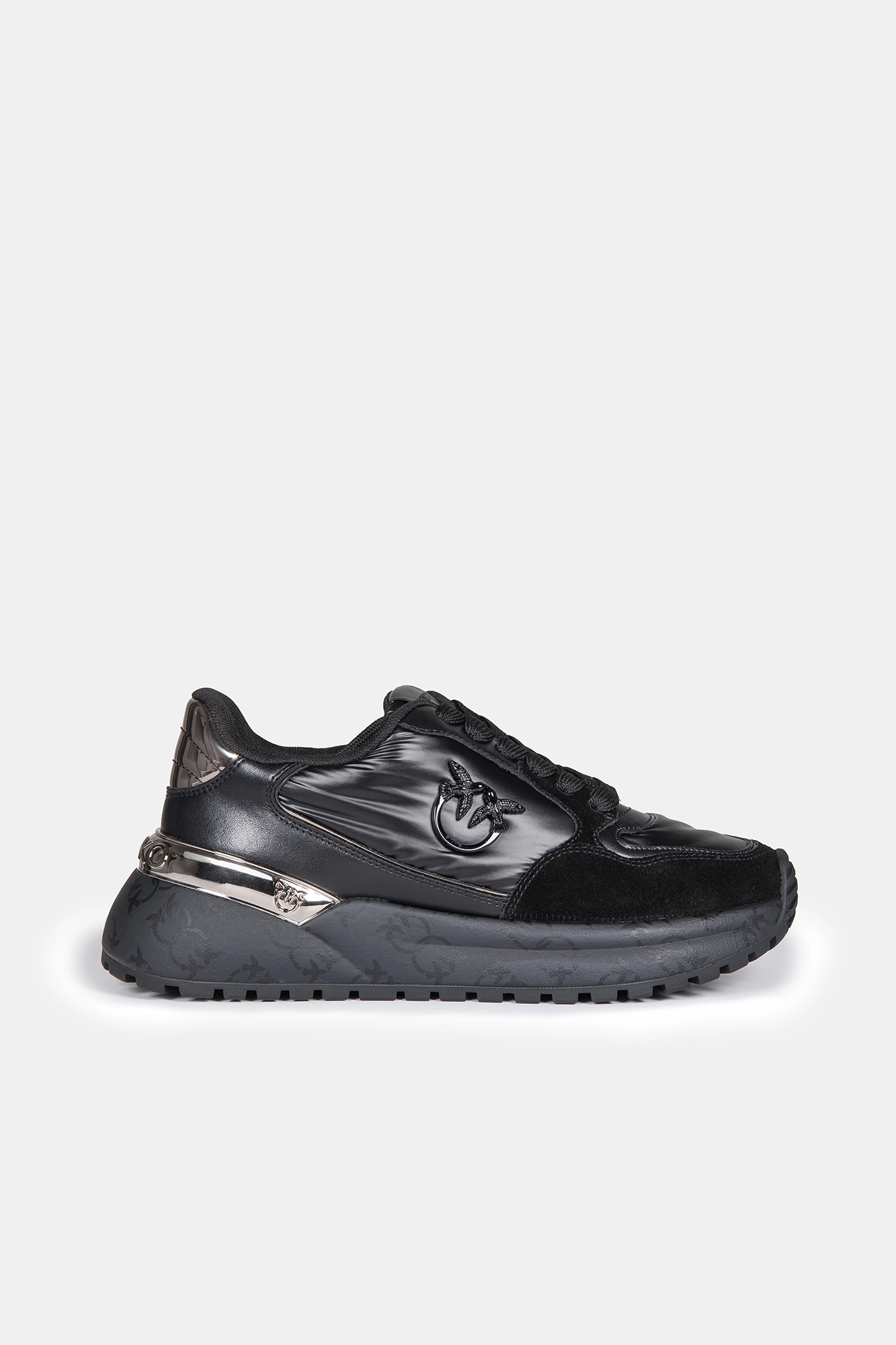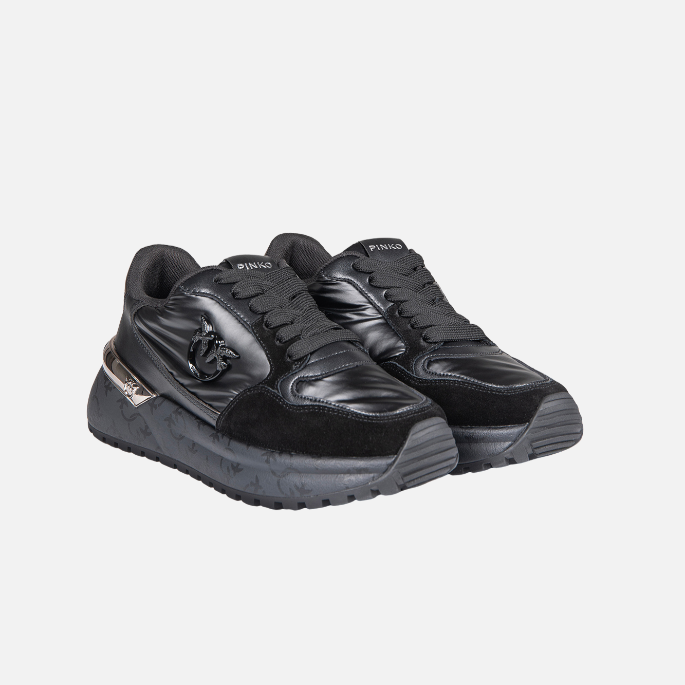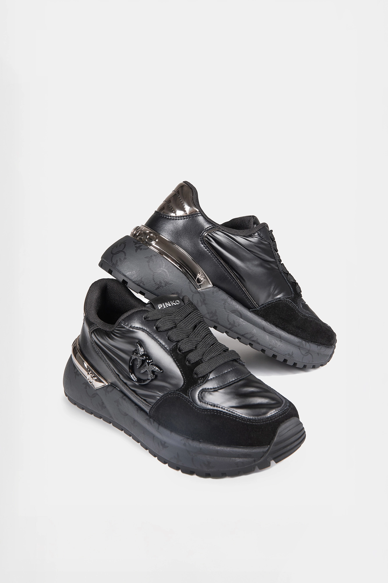 Czarne sneakersy PINKO, które bez kompromisów łączą nowoczesny design, komfort noszenia i wyjątkowy efekt wizualny. Model w klasycznym czarnym kolorze został wykonany z naturalnej skóry, która została połączona z elementami połyskującego materiału oraz eleganckimi detalami. Logo Love Birds zostało subtelnie umieszczone na cholewce oraz na metalicznym elemencie na pięcie, tworząc niepowtarzalny charakter tego modelu. Gruba, mocna wizualnie podeszwa została ozdobiona logami marki, podkreślając unikalny design. Obowiązkowa pozycja w garderobie każdej fanki PINKO.