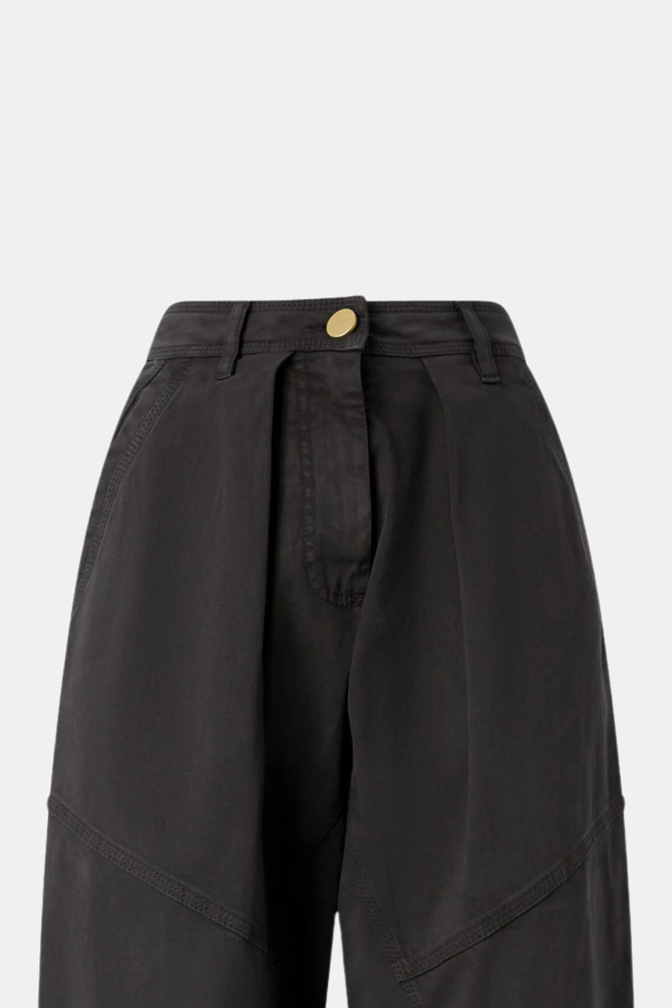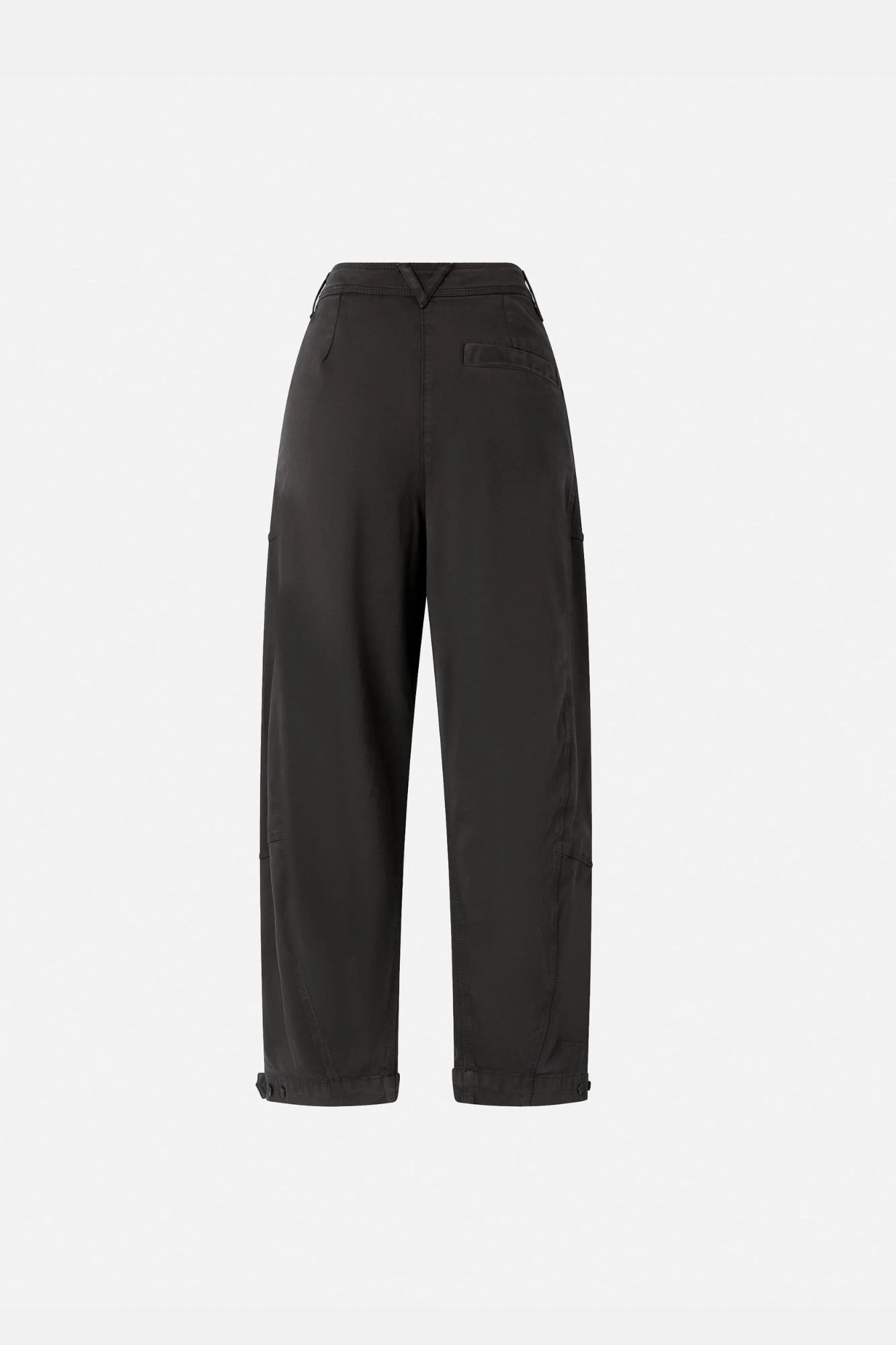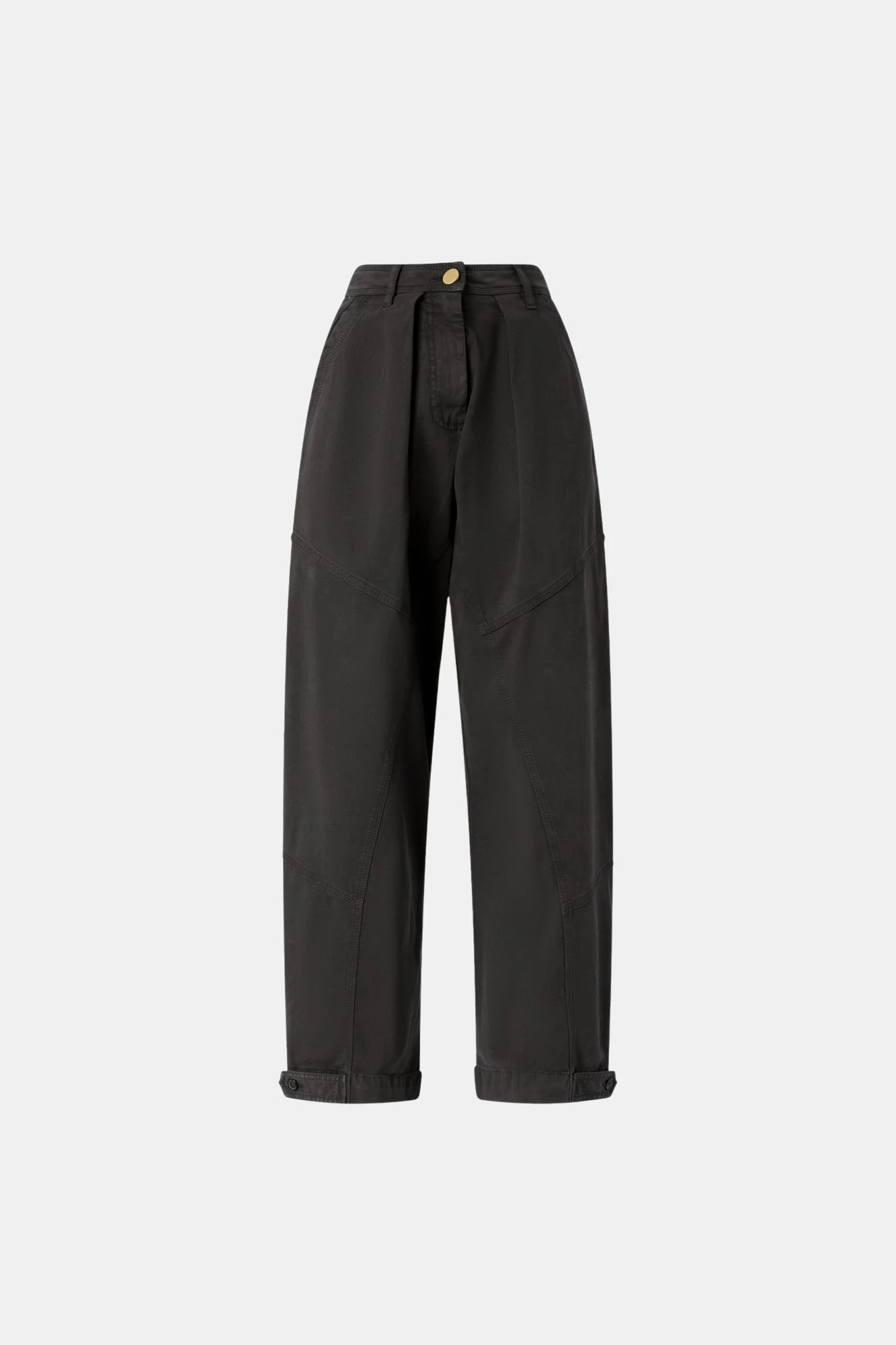 Damskie spodnie wykonane z bawełny z szerokimi nogawkami, zaokrąglonyymi u góry i zwężonymi na dole. Nogawki są zakończone paskami ze stylowym guzikiem i regulacją szerokości. Na udach mają charakterystyczne cięcia i podwójne szwy, tak jak pasek. Kieszenie i dół nogawek nadające temu modelowi większej wyrazistości i charakteru.