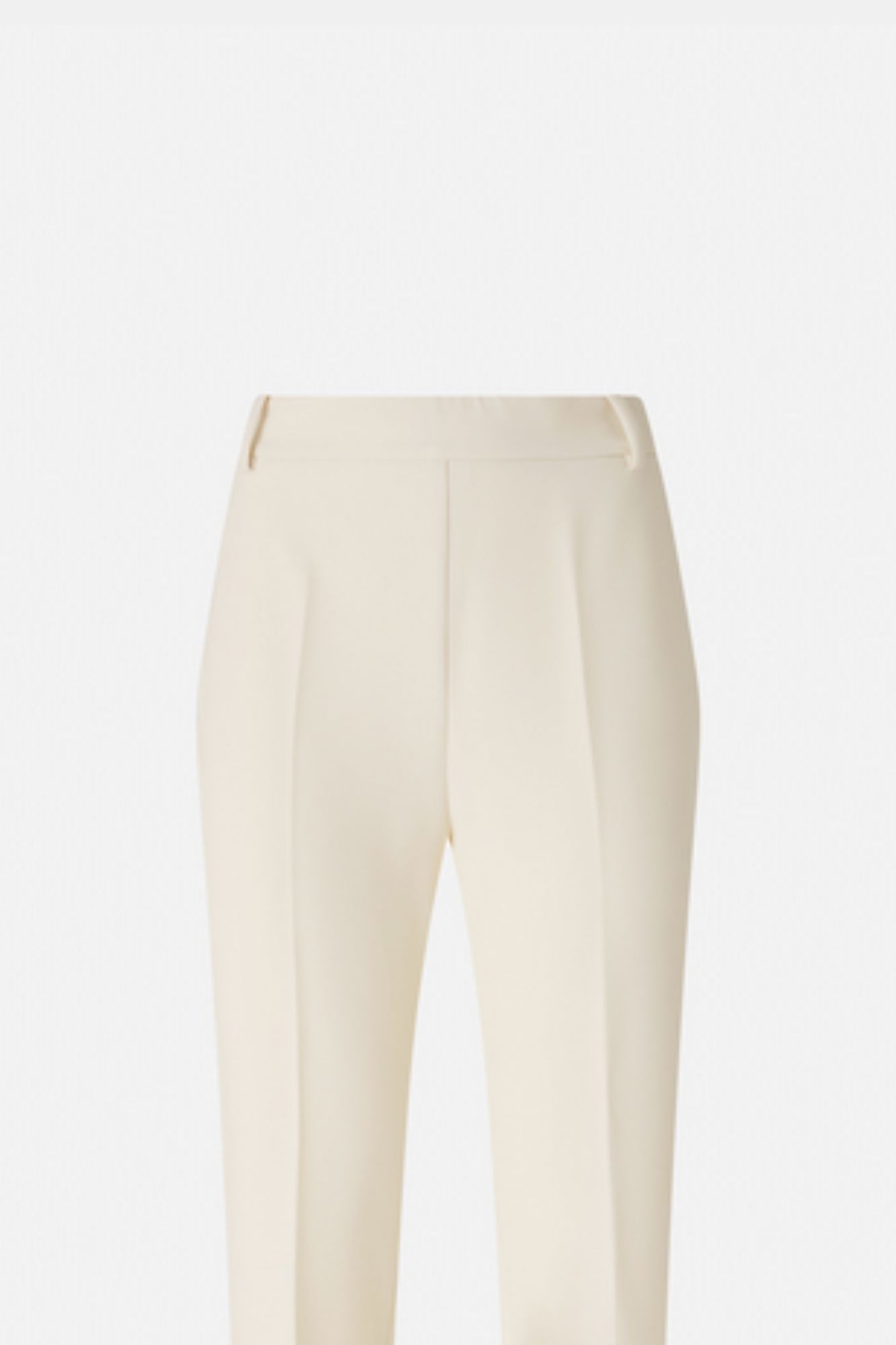 Obcisłe spodnie w białym kolorze z dopasowaną nogawką rozszerzaną ku dołowi. Wykonane z połączenia kilku tkanin, wytrzymałych, przyjemnych w dotyku i rozciągliwych w celu uzyskania efektu zbliżonego do wełny. Na środku nogawki z przodu i z tyłu plisa.