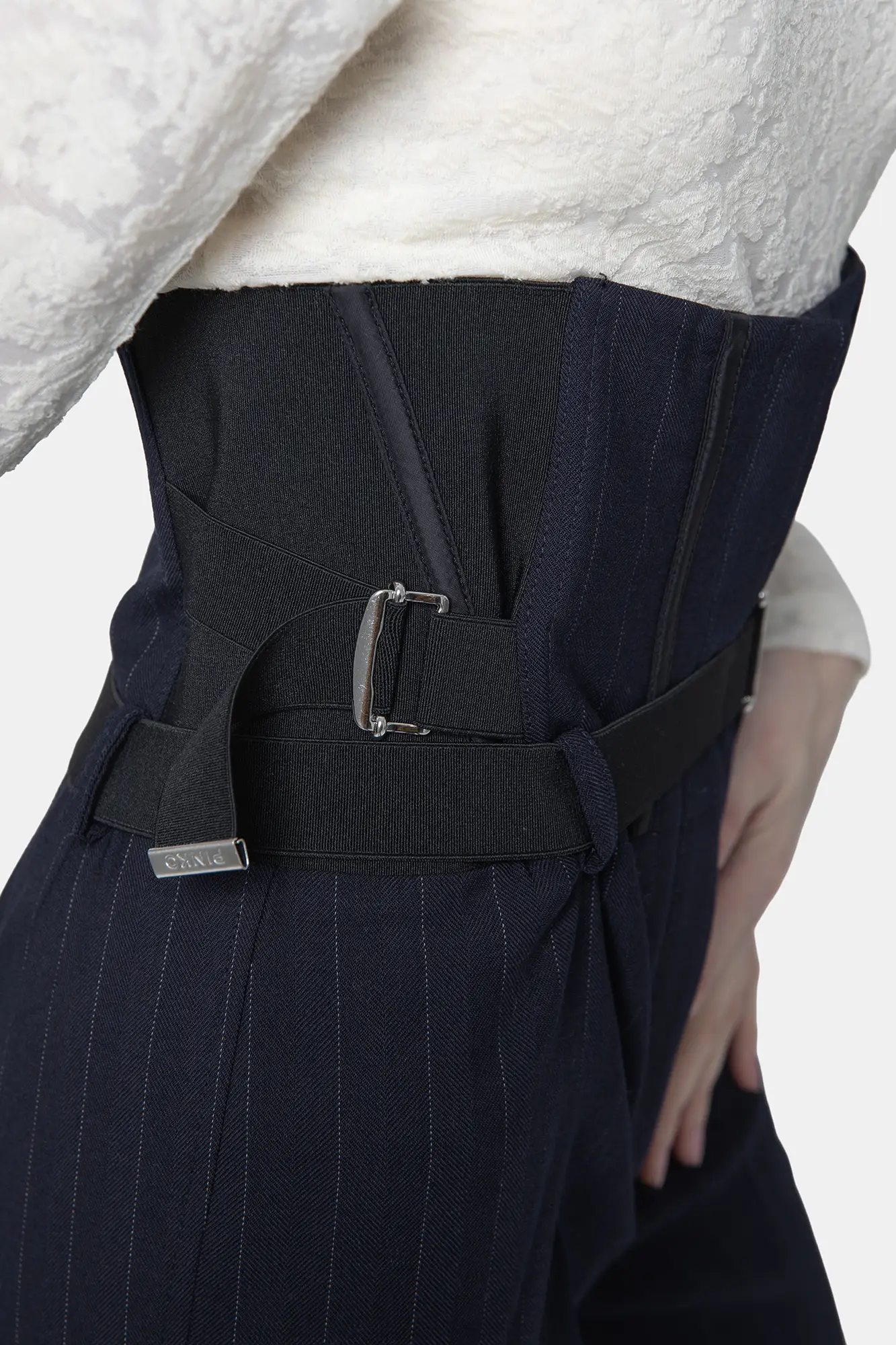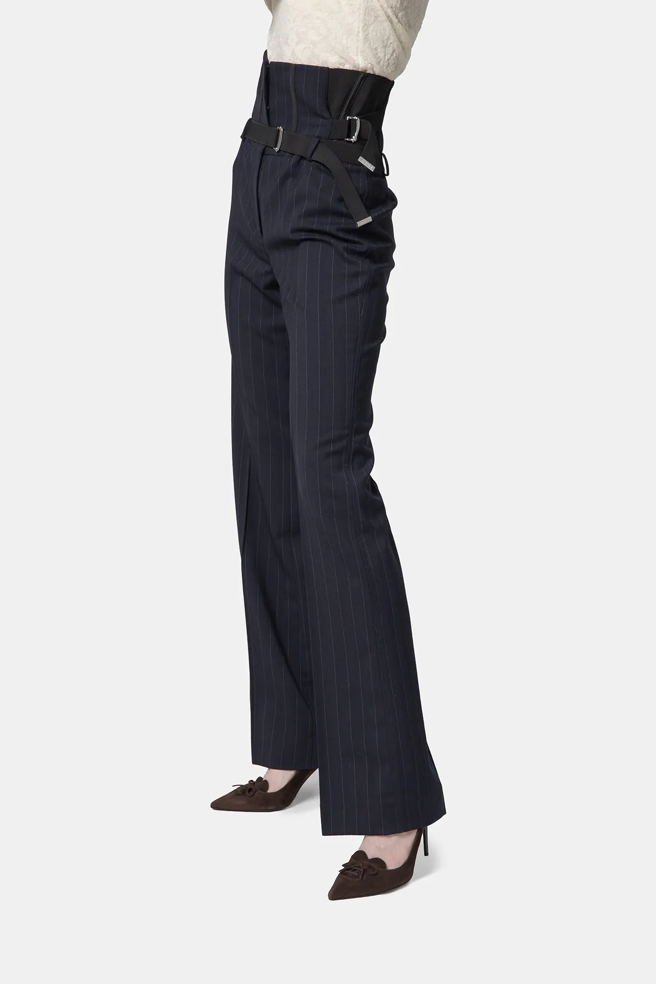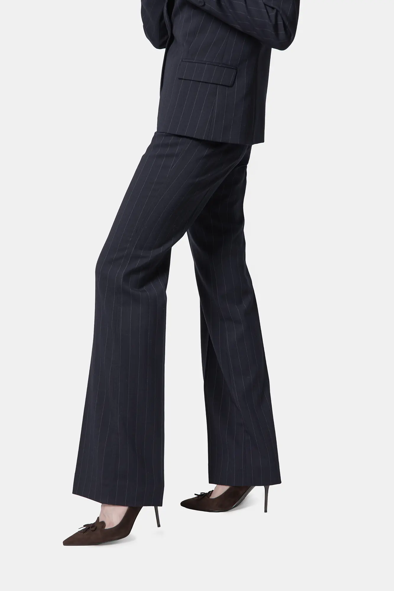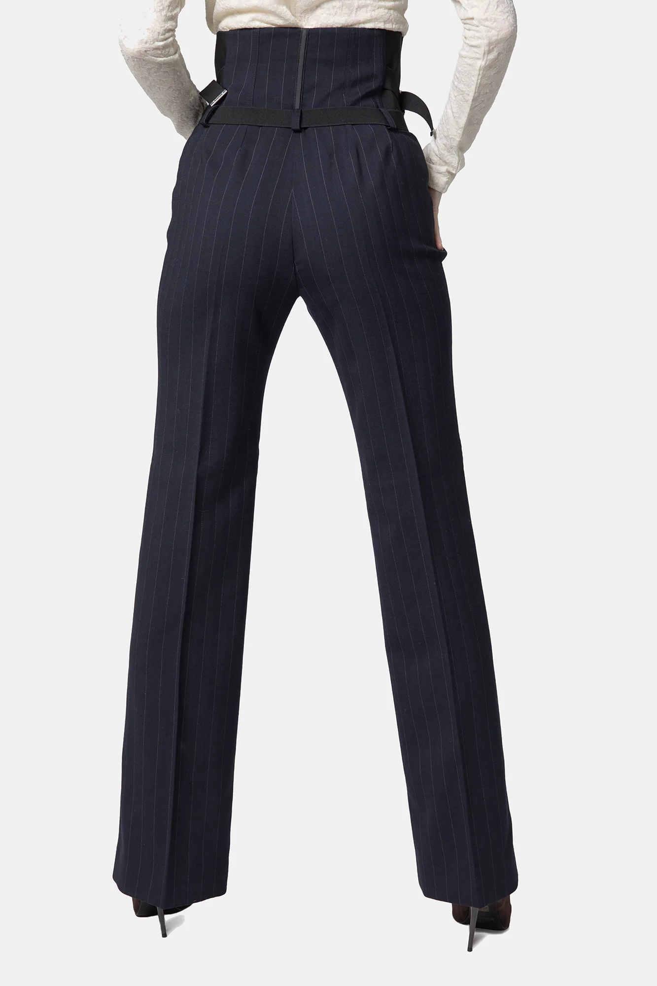 Granatowe spodnie damskie z wysokim stanem i delikatnymi paskami na całości.