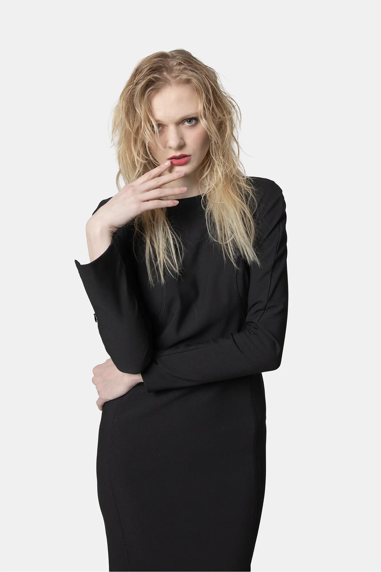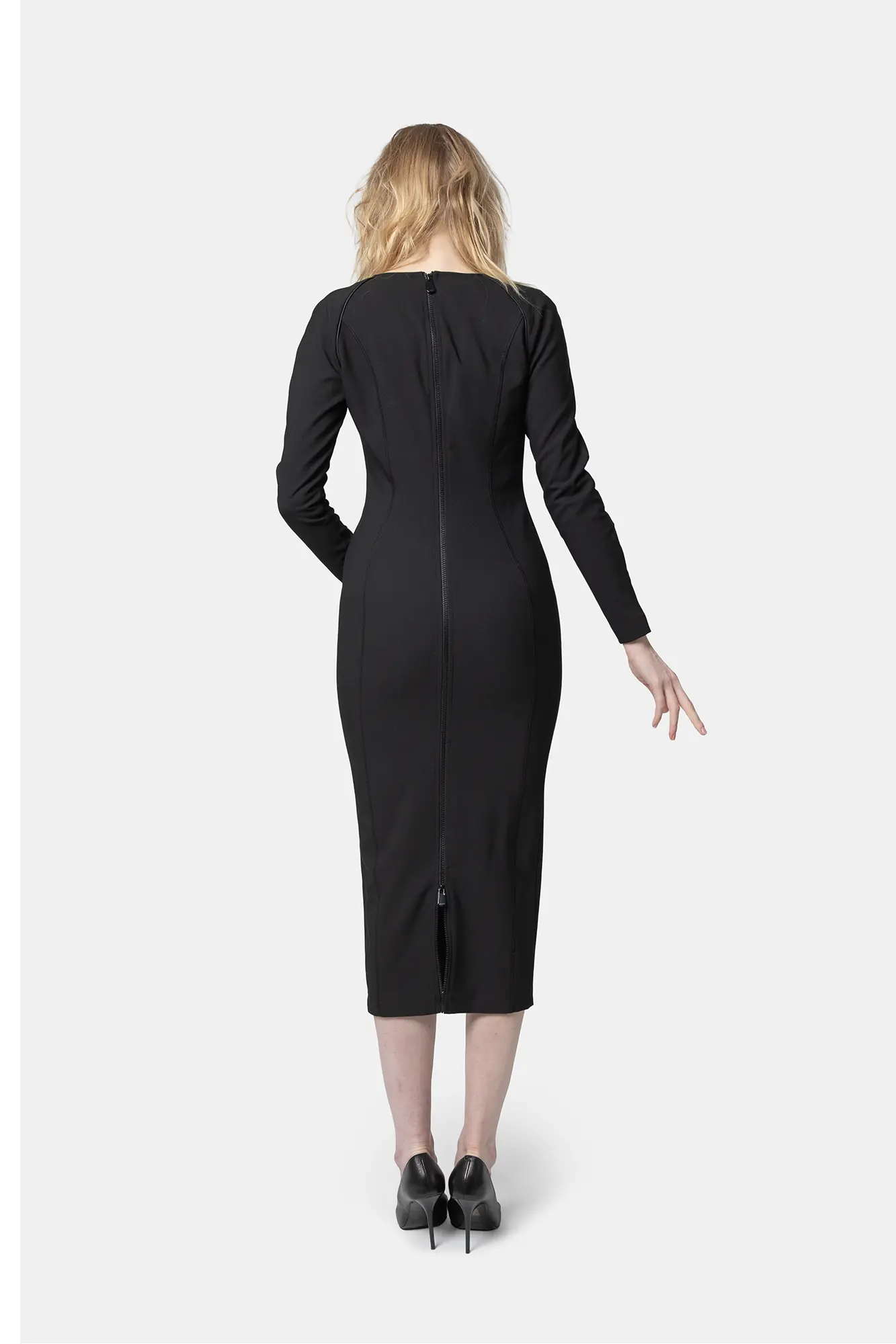 Sukienka ołówkowa midi Frutta z długim rękawem, subtelnie modeluje sylwetkę, jest zapinana z tyłu na zamek. Dzięki temu jest możliwość szybkiej zmiany od sukienki formalnej, dopiętej, po zmysłowy look z intrygującym rozcięciem. Sukienka jest idealna na spotkanie biznesowe czy elegancką kolację i wieczorne wyjście.