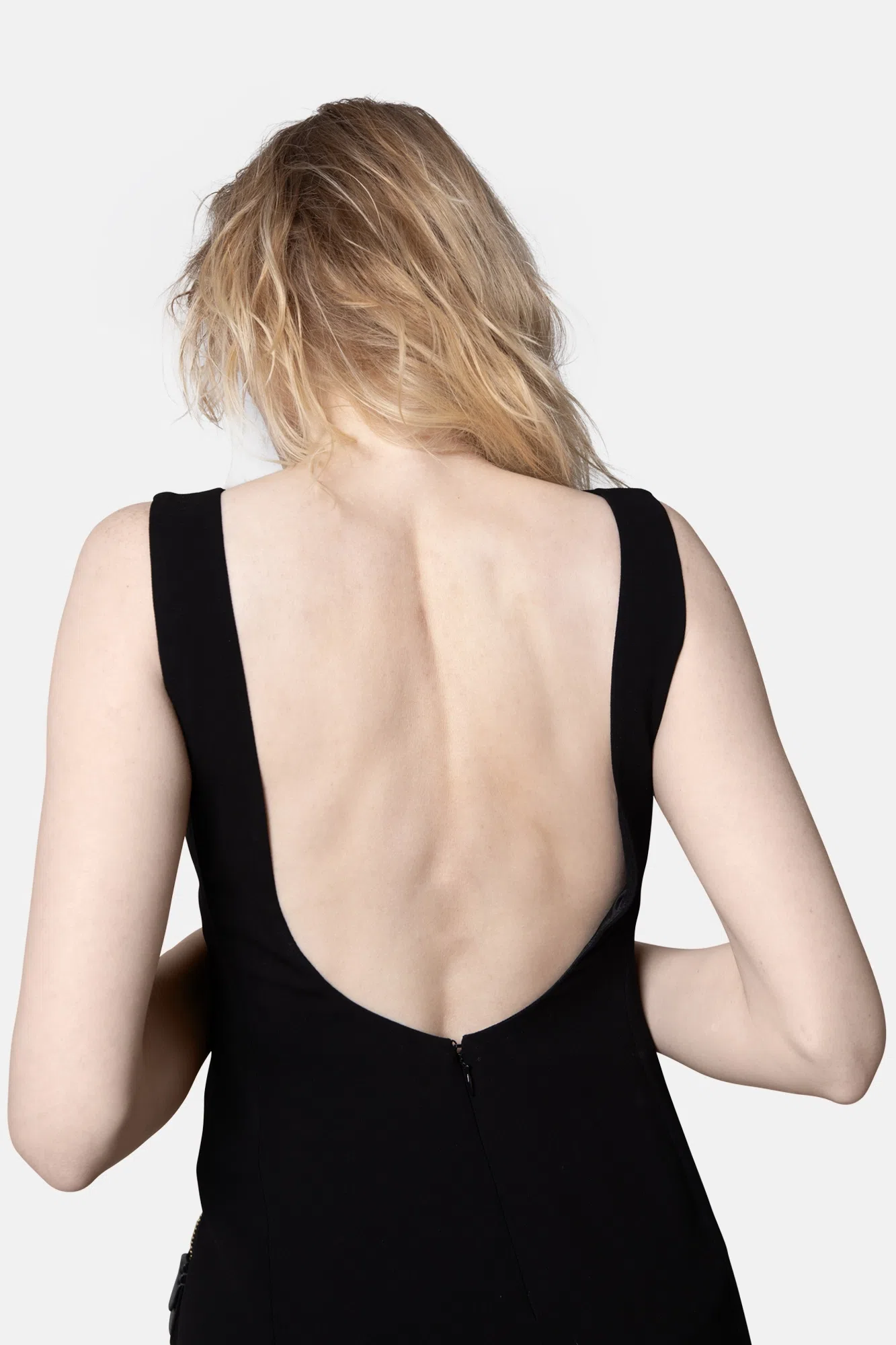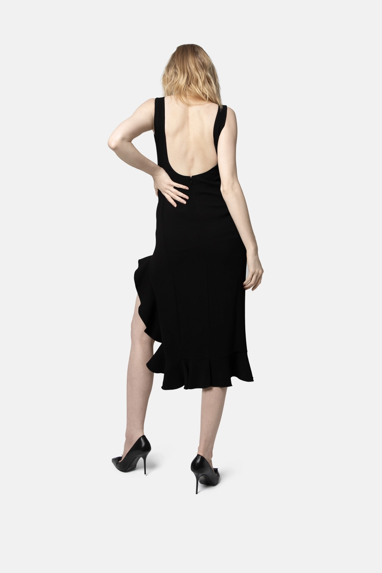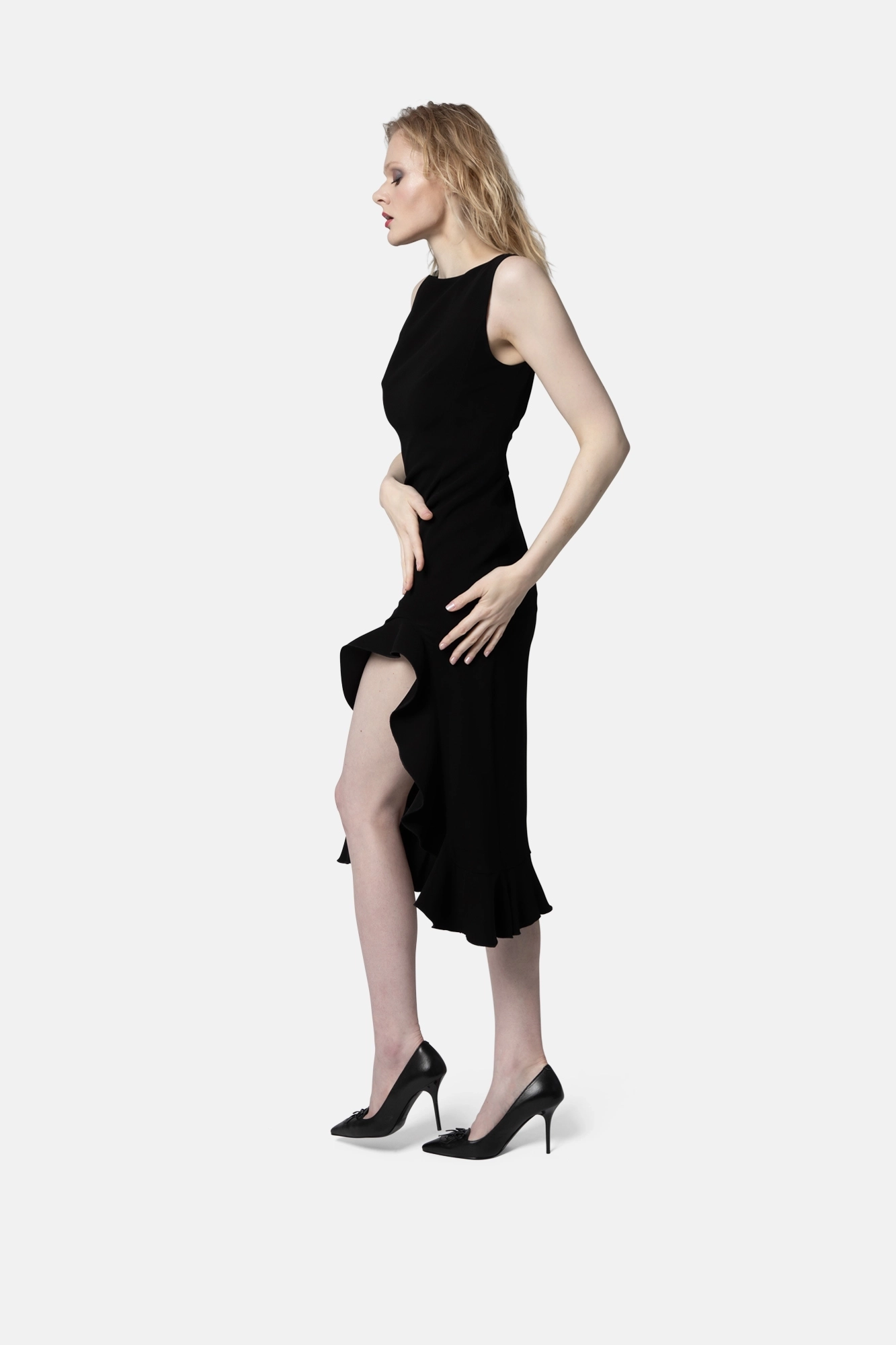 Bardzo elegancka, czarna sukienka wieczorowa midi, z odkrytymi plecami i rozcięciem.