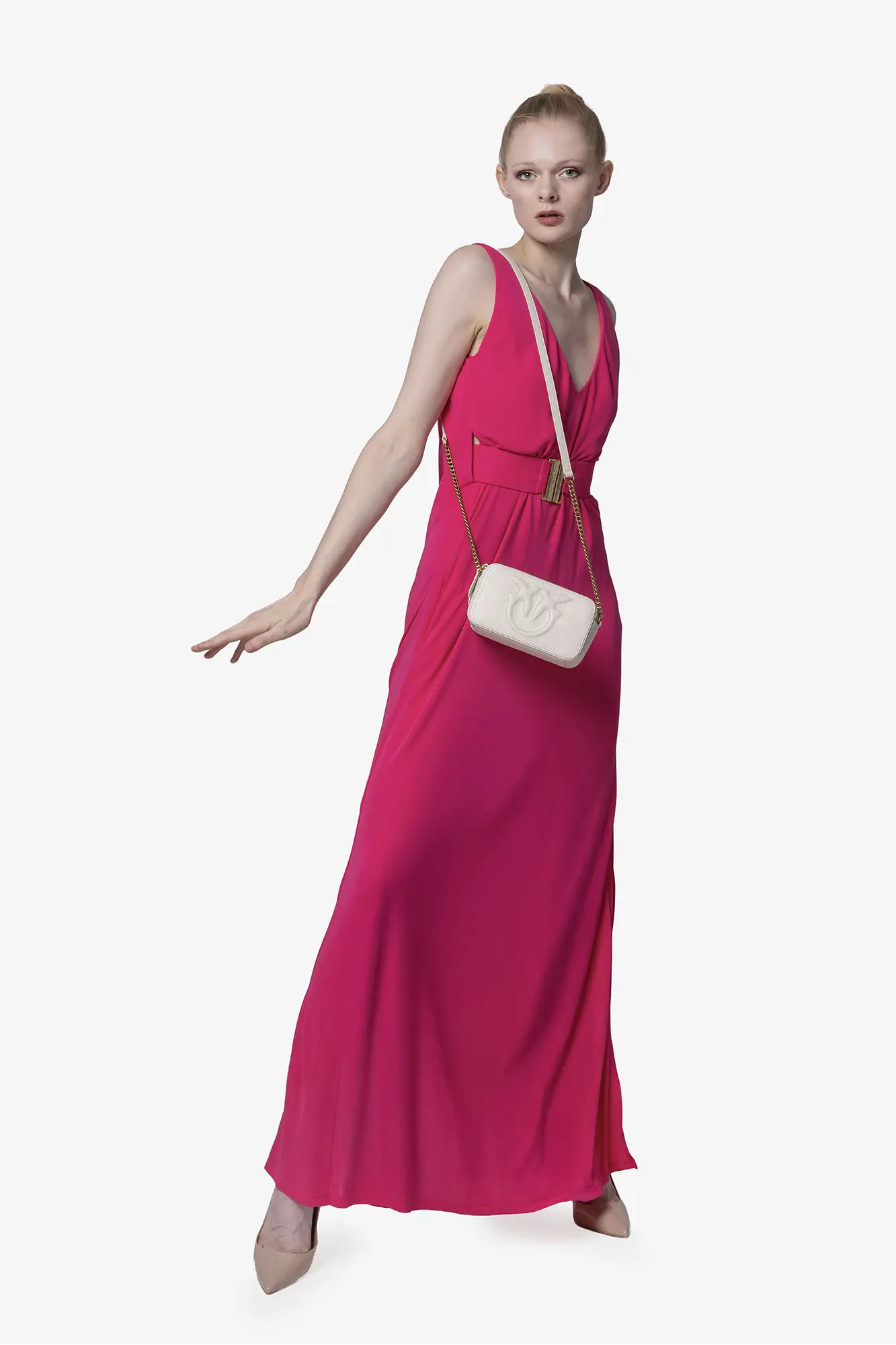 Sukienka maxi o wieczorowym kroju różowa, z odkrytymi plecami. Wyraźnie zaznaczona talia, która jest podkreślona paskiem, podkreśla luźniejszy, lejący się dół. Odkryte plecy nadają sukience zmysłowego charakteru a rozciecie na dole dodaje lekkości.
