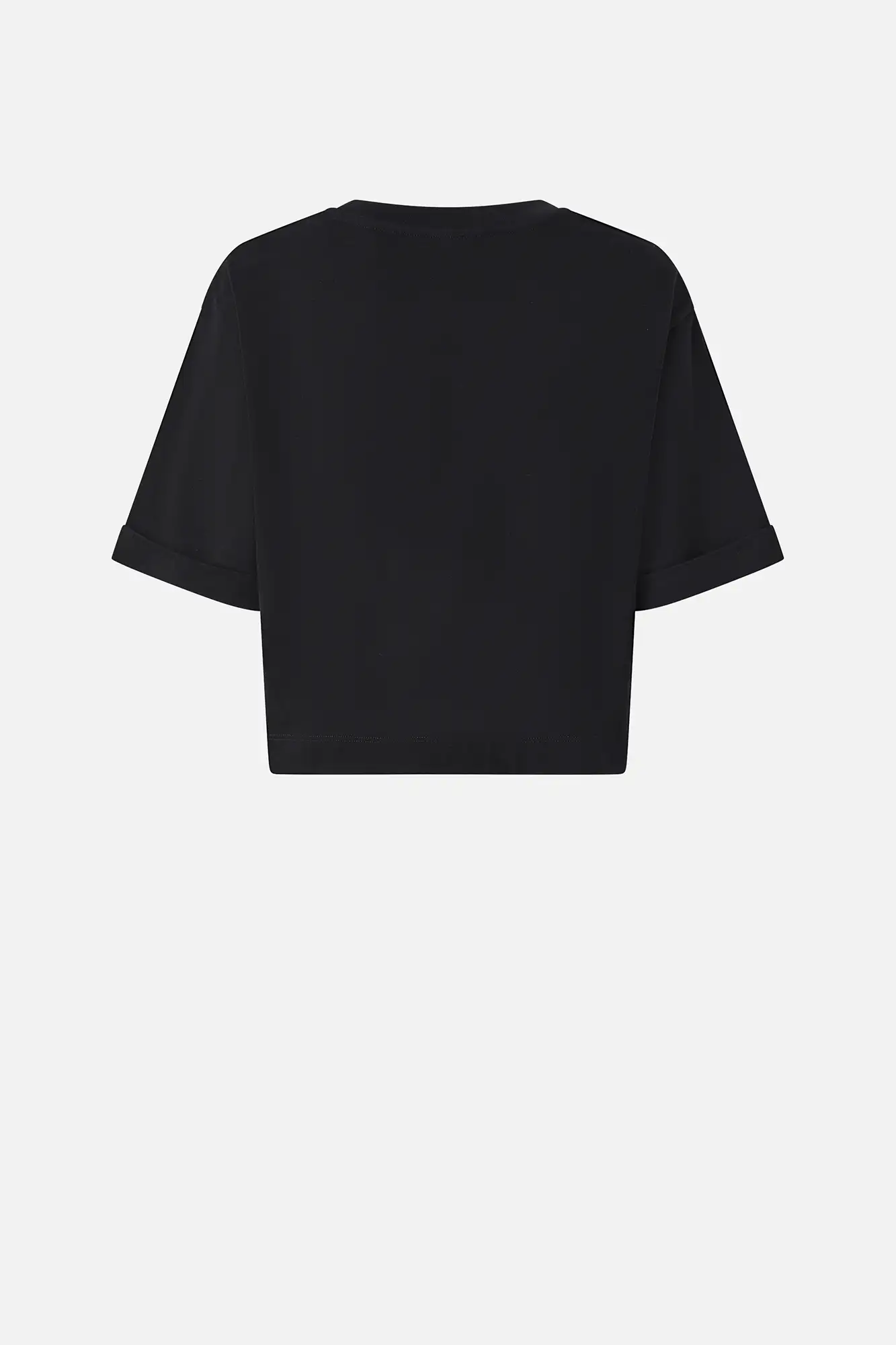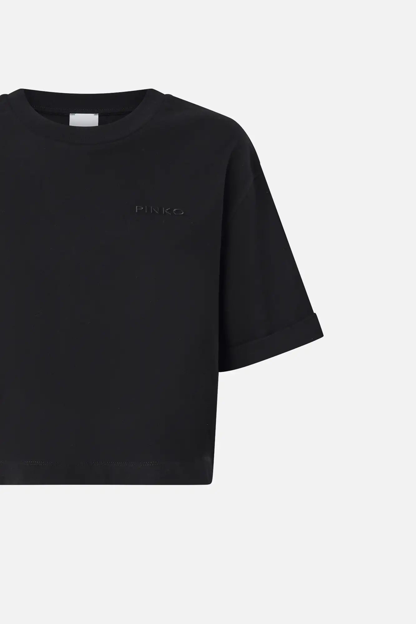 T-shirt Pinko o krótkim kroju w czarnym, klasyczny kolorze. Bluzka świetnie komponuje się ze spodniami z wysokim stanem podkreślającymi sylwetkę.