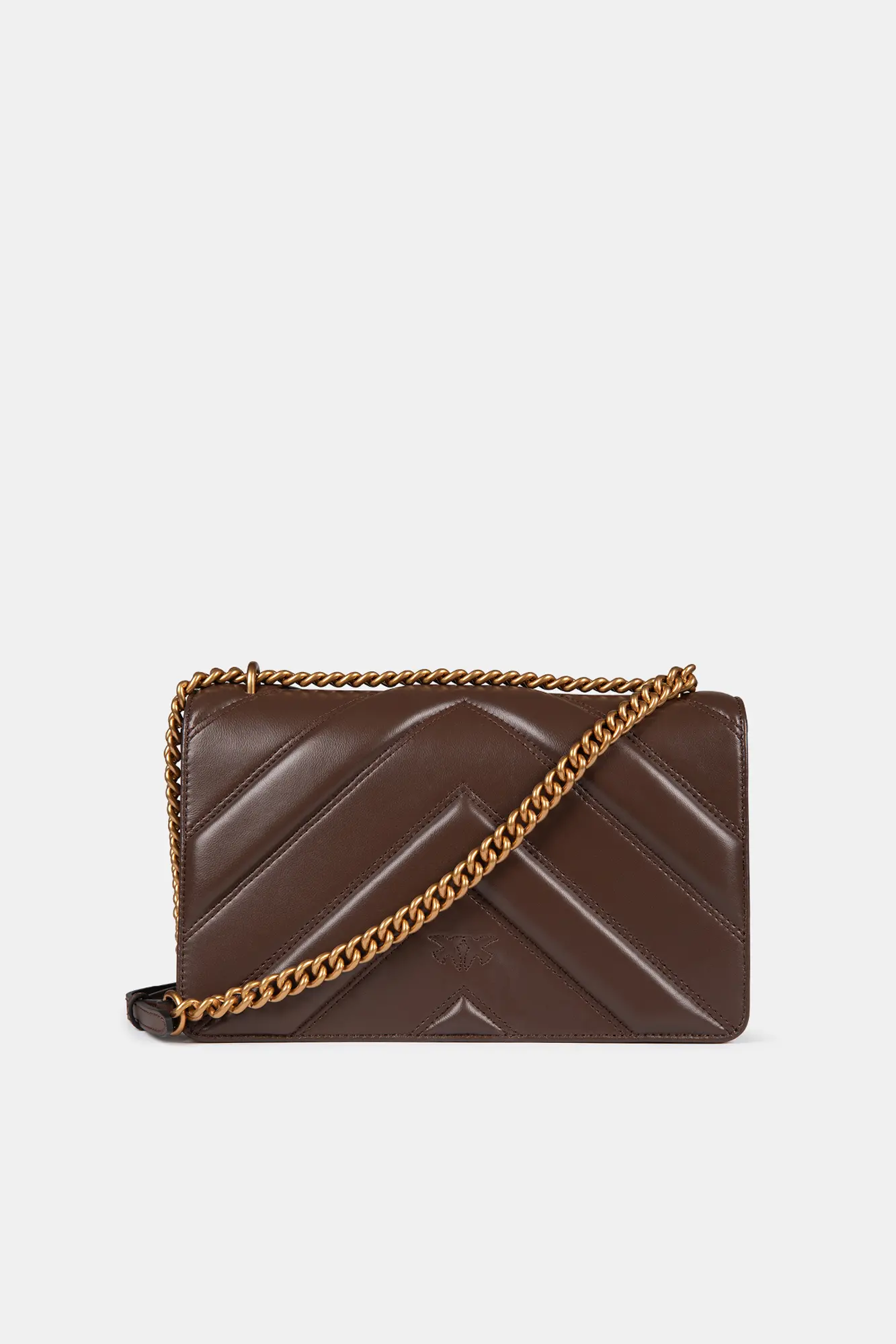 Torebka damska na ramię Pinko brązowa, mleczna czekolada, wykonana z naturalnej skóry z dodatkami w kolorze złotym. Model jest pikowany w jodełkę na całości i ma regulowany pasek z możliwością dostosowania do odpowiedniej długości. W środku znajduje się kieszonka zapinana na zamek i szeroka komora na najpotrzebniejsze rzeczy. Całość daje przepiękny efekt.