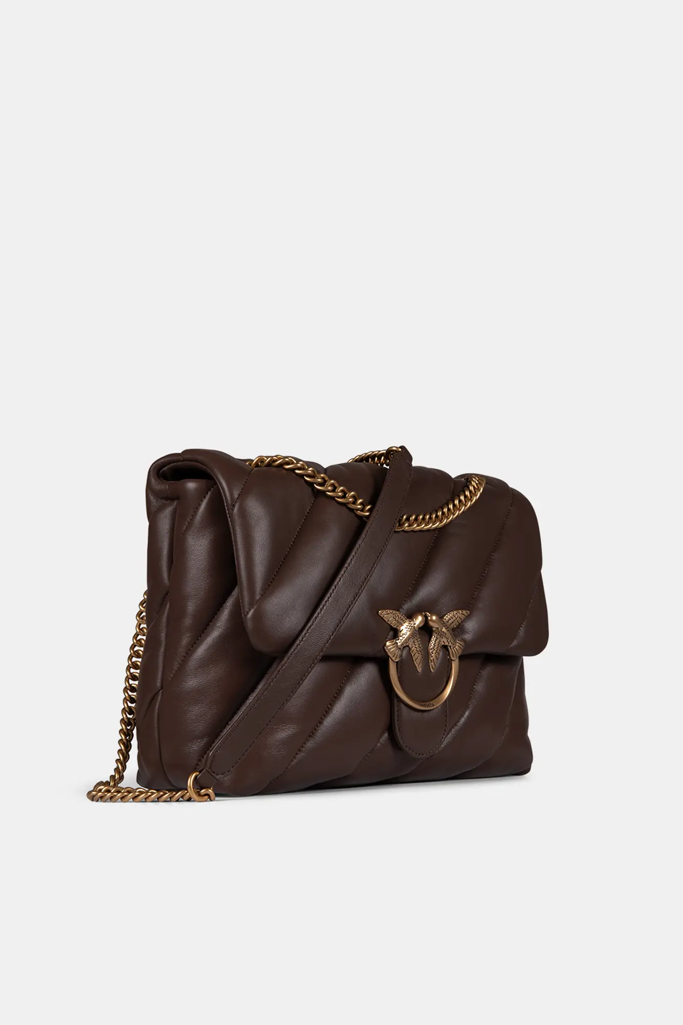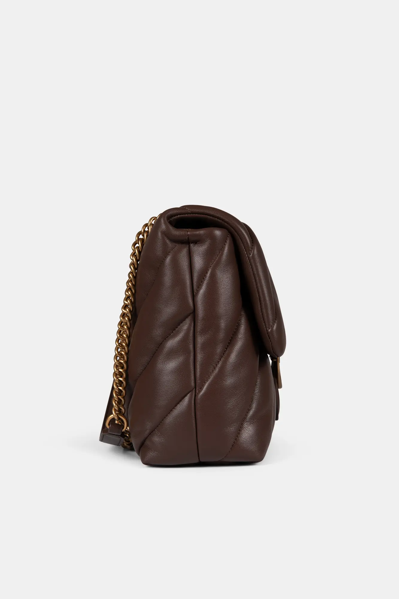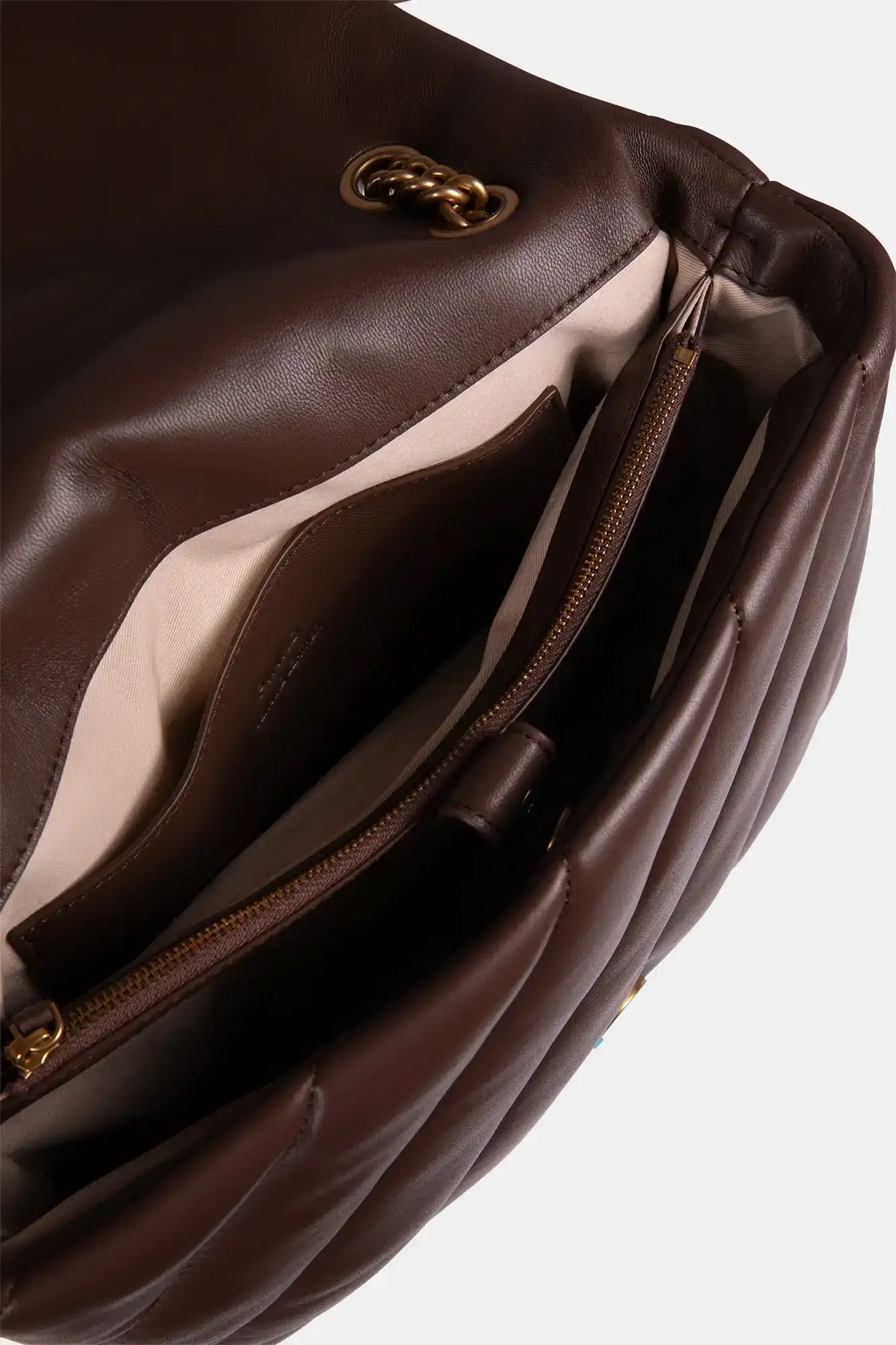 Torebka PINKO Love Big Puff brązowa, wykonana z naturalnej miękkiej w dotyku skóry, ozdobiona wykończeniami w kolorze złotym. W środku przegródka i kieszonka zapinana na zamek, wyściełane podszewką z mikrofibry. Klasyczna i obowiązkowa pozycja w szafie, która wzbogacji każdą stylizację.