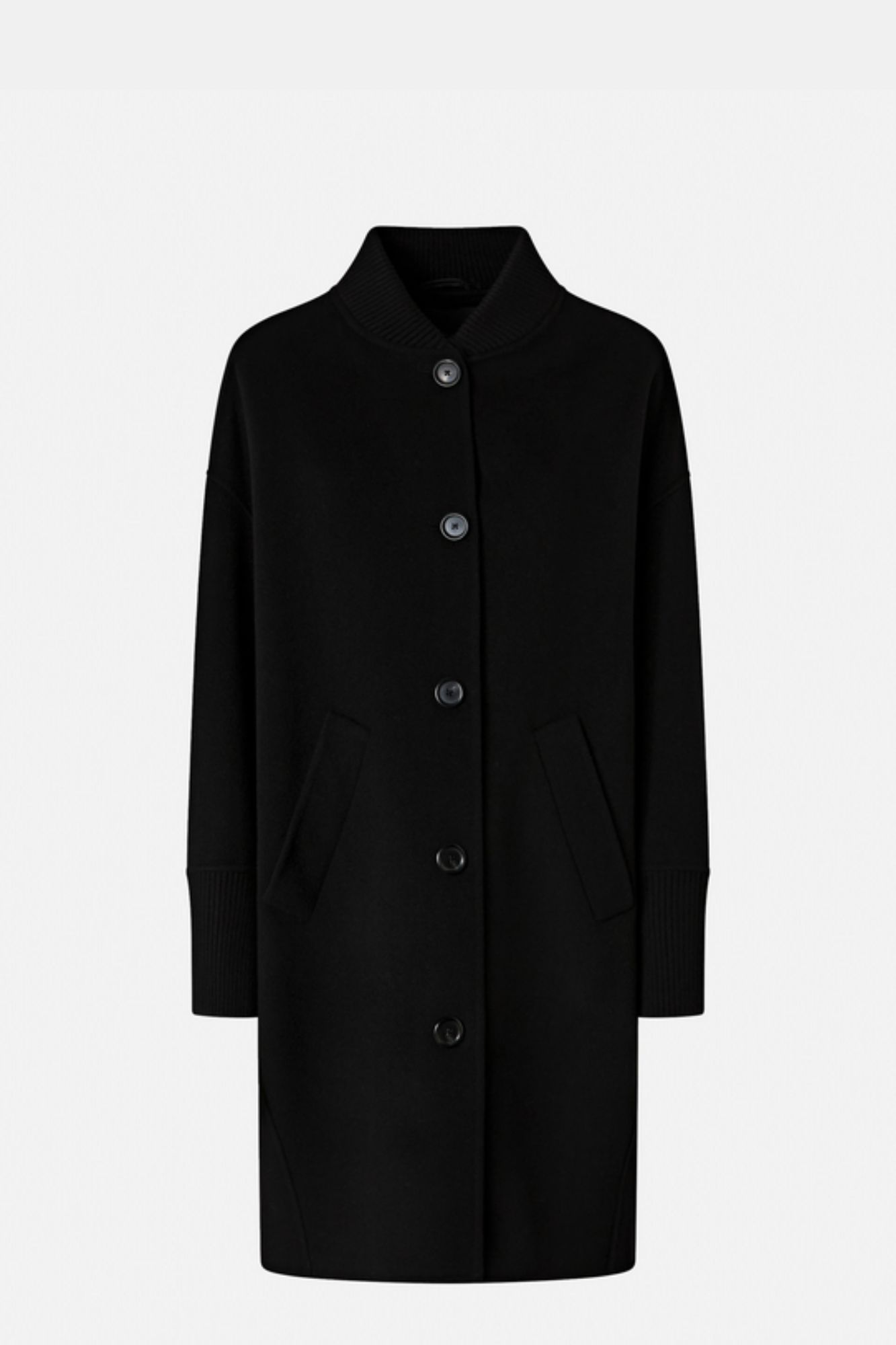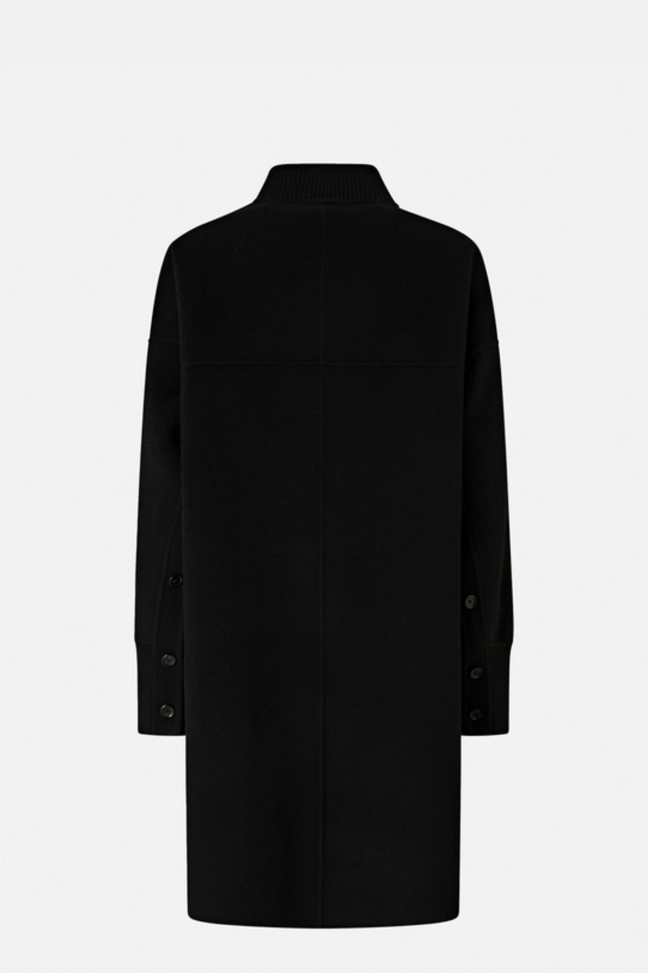 Wełniany elegancki czarny płaszcz damski z obniżoną linią ramion, zapinany na guziki, z dzianinowymi prążkowanymi ściągaczami na rękawach i przy kołnierzu. Na rękawach, wzdłuż wewnętrznego szwu na wysokości przedramienia, umieszczono guziki jako element dekoracyjny. Guziki są czarne, spójne z kolorystyką płaszcza i nadają całości bardzo ciekawego efektu.