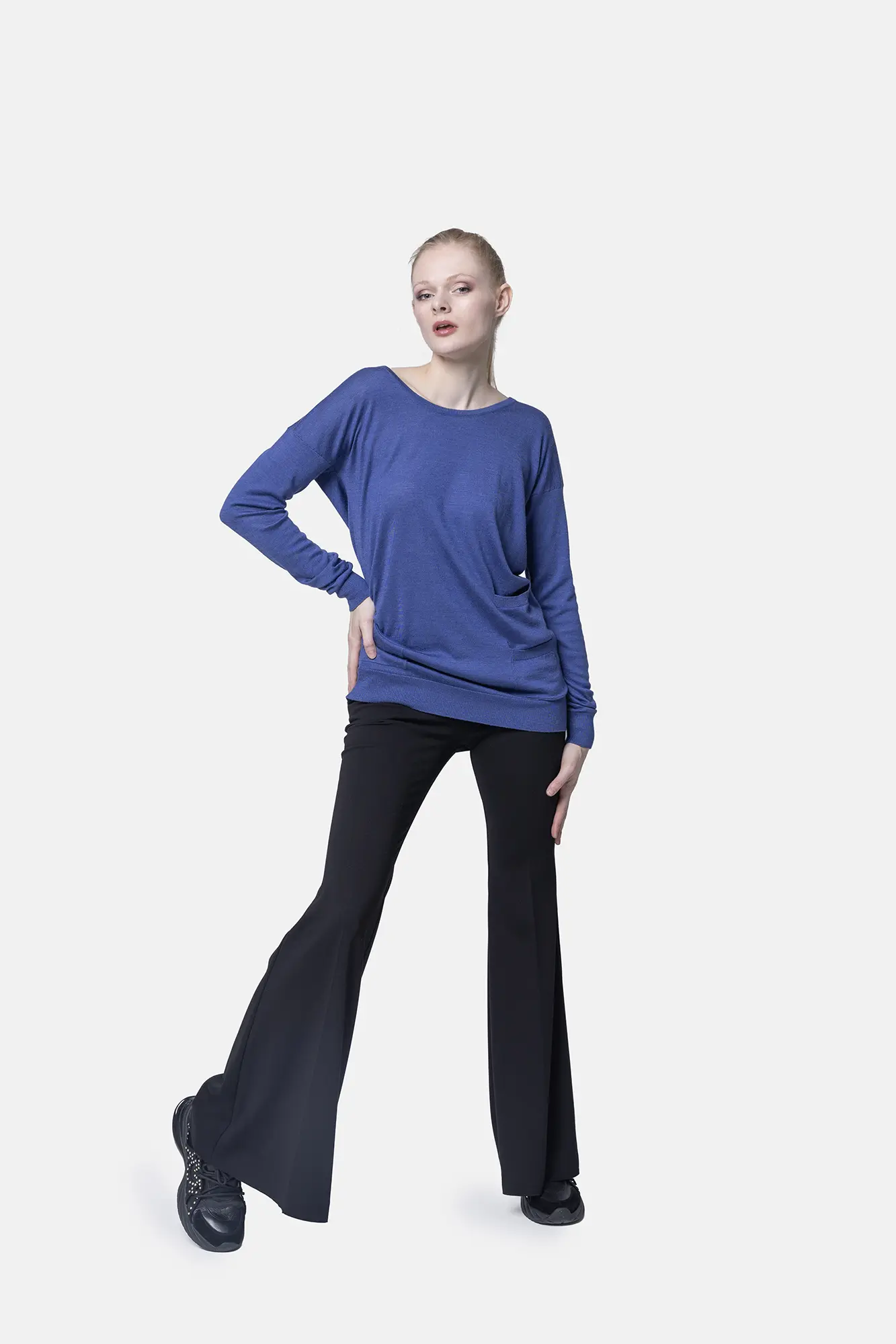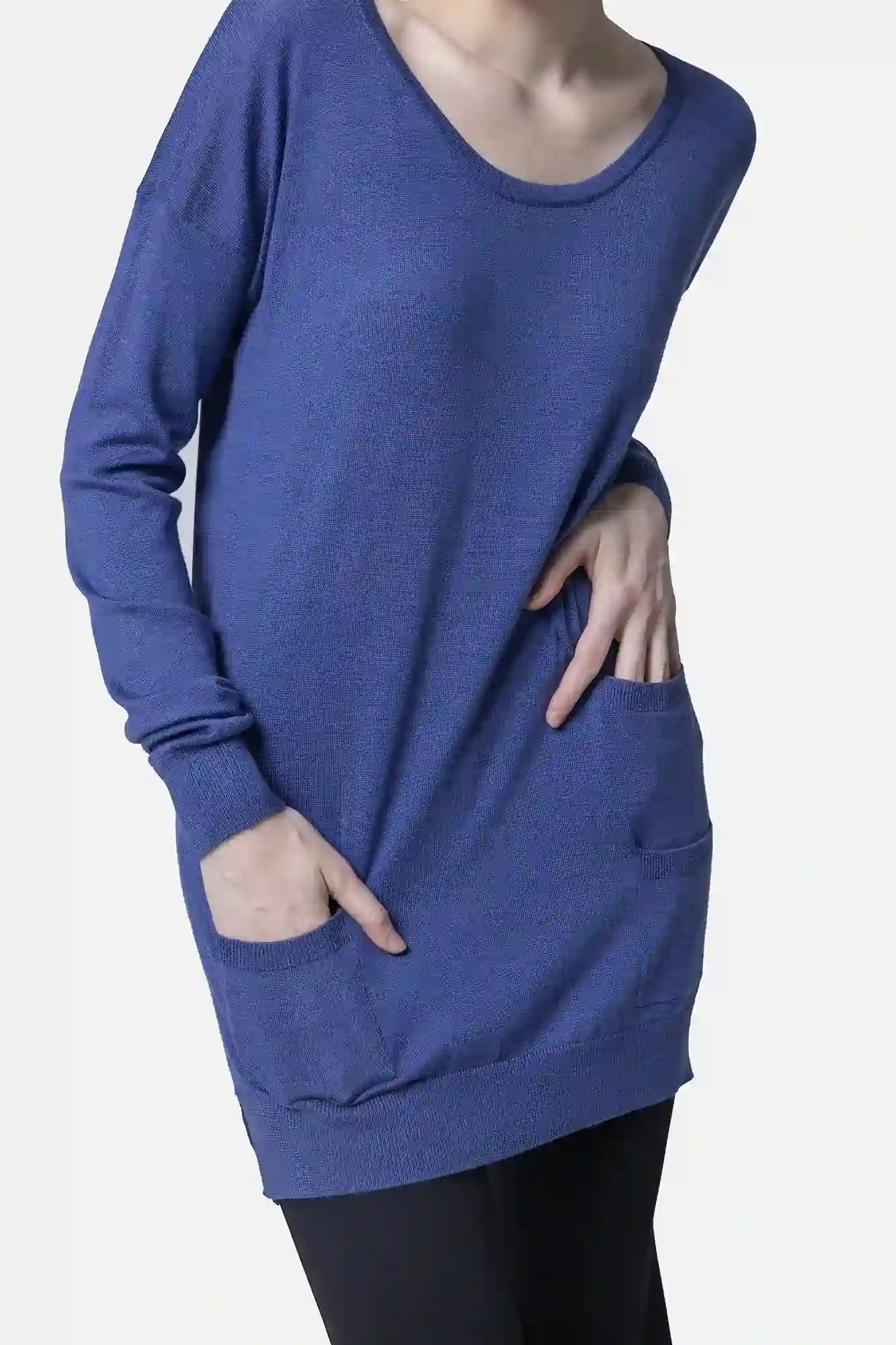 Damski sweter w spokojnym, chłodnym odcieniu niebieskiego, to propozycja dla kobiet, które cenią sobie przemyślany design i funkcjonalność. Wykonany z wełny merynosów, niezwykle miękkiej w dotyku. Sweter ma przedłużony krój, który zapewnia wygodę i wszechstronność. Luźny fason z lekko opadającą linią ramion. Dwie duże, naszywane kieszenie z przodu to nie tylko praktyczny detal, ale również kluczowy element, który nadaje całości nowoczesnego, swobodnego charakteru. Niewielkie rozcięcia po bokach sprawiają, że sweeter świetnie układa się w ruchu.