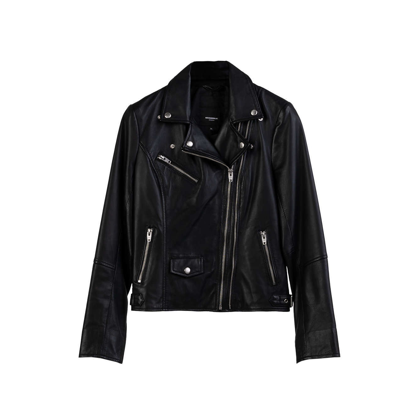 Kurtka skórzana ramoneska w czarnym kolorze. Dopasowany krój, dopracowane detale. Trzy kieszenie, dwie po bokach zapinane na zamek, mała kieszonka na napę po prawej stronie i jedna kieszeń na piersi. Na rękawach zamki, po bokach na na dole paski do regulacji szerokości. Wszystkie napy i zamki logowane.