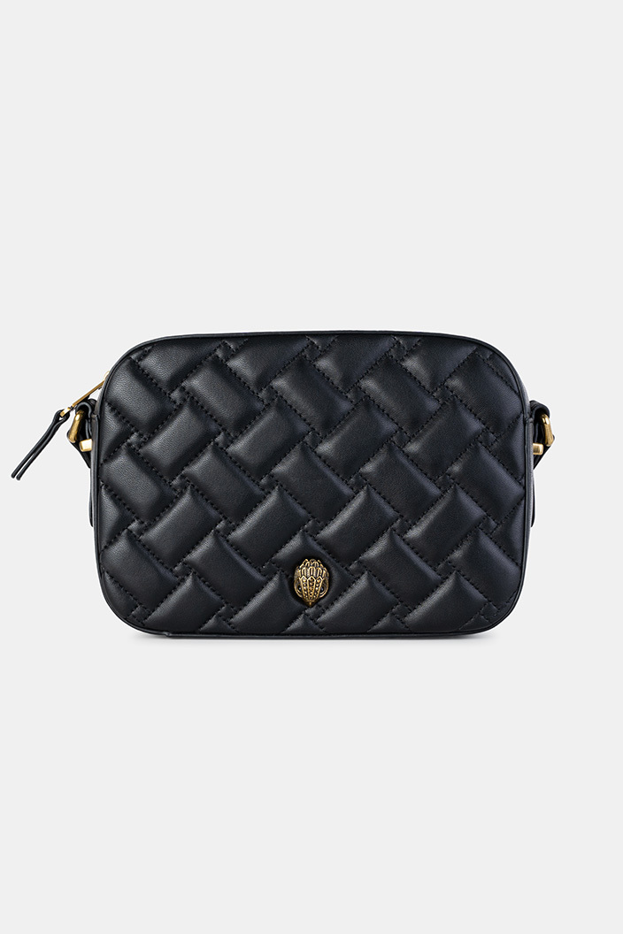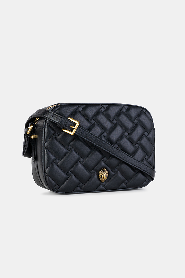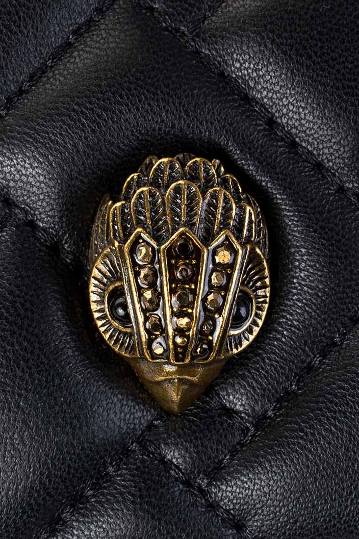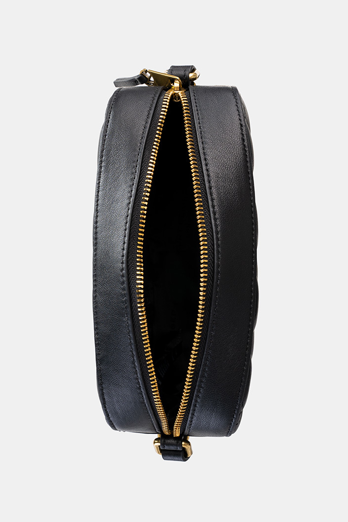 Mała czarna torebka z naturalnej licowej skóry, pikowana, miękka w dotyku. Jedna komora zamykana na zamek, z tyłu kieszonka na zamek z eleganckimi obszyciami. Z przodu torebka ozdobiona głową orła z cyrkoniami. Długość paska 138 cm.